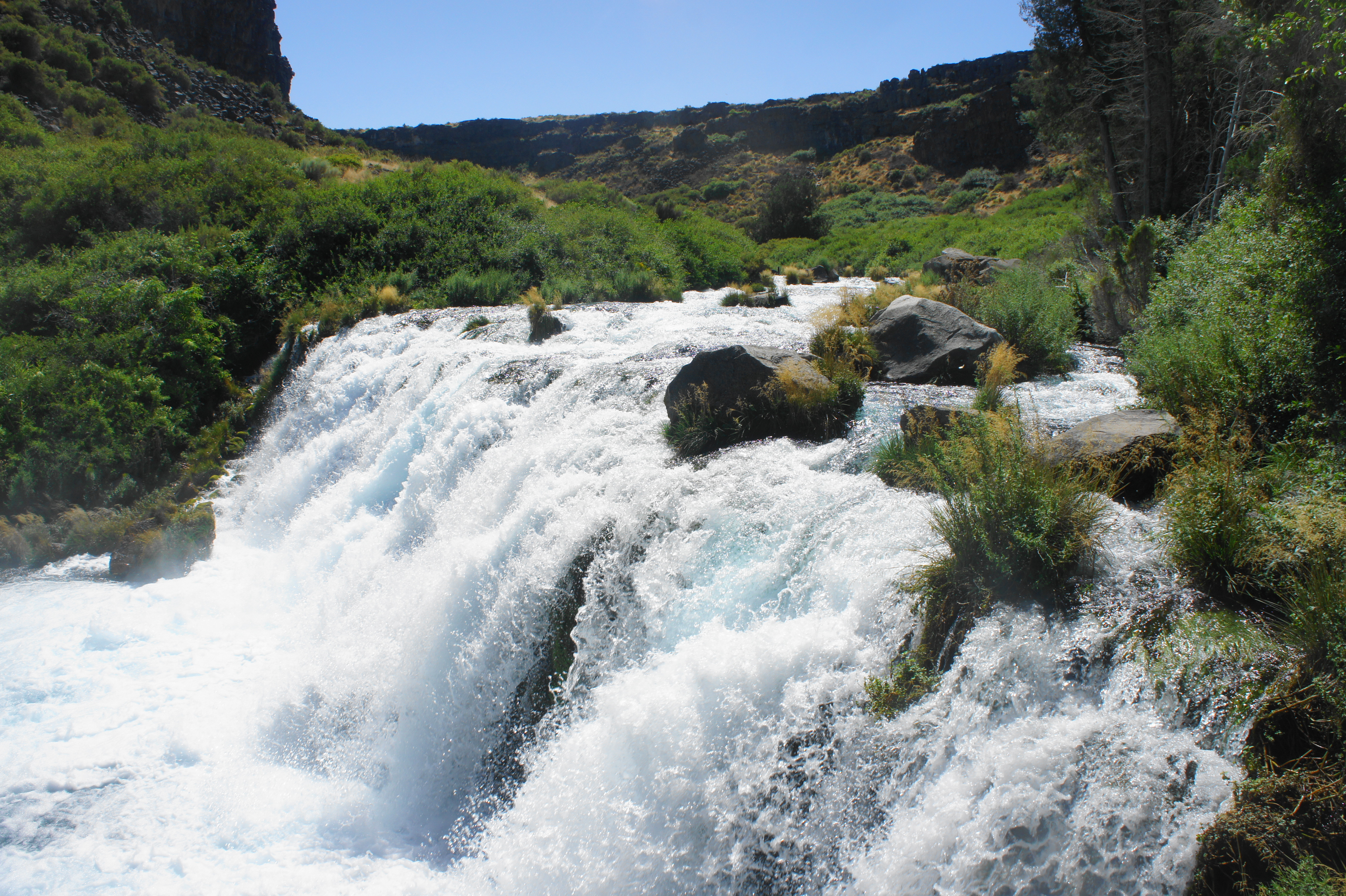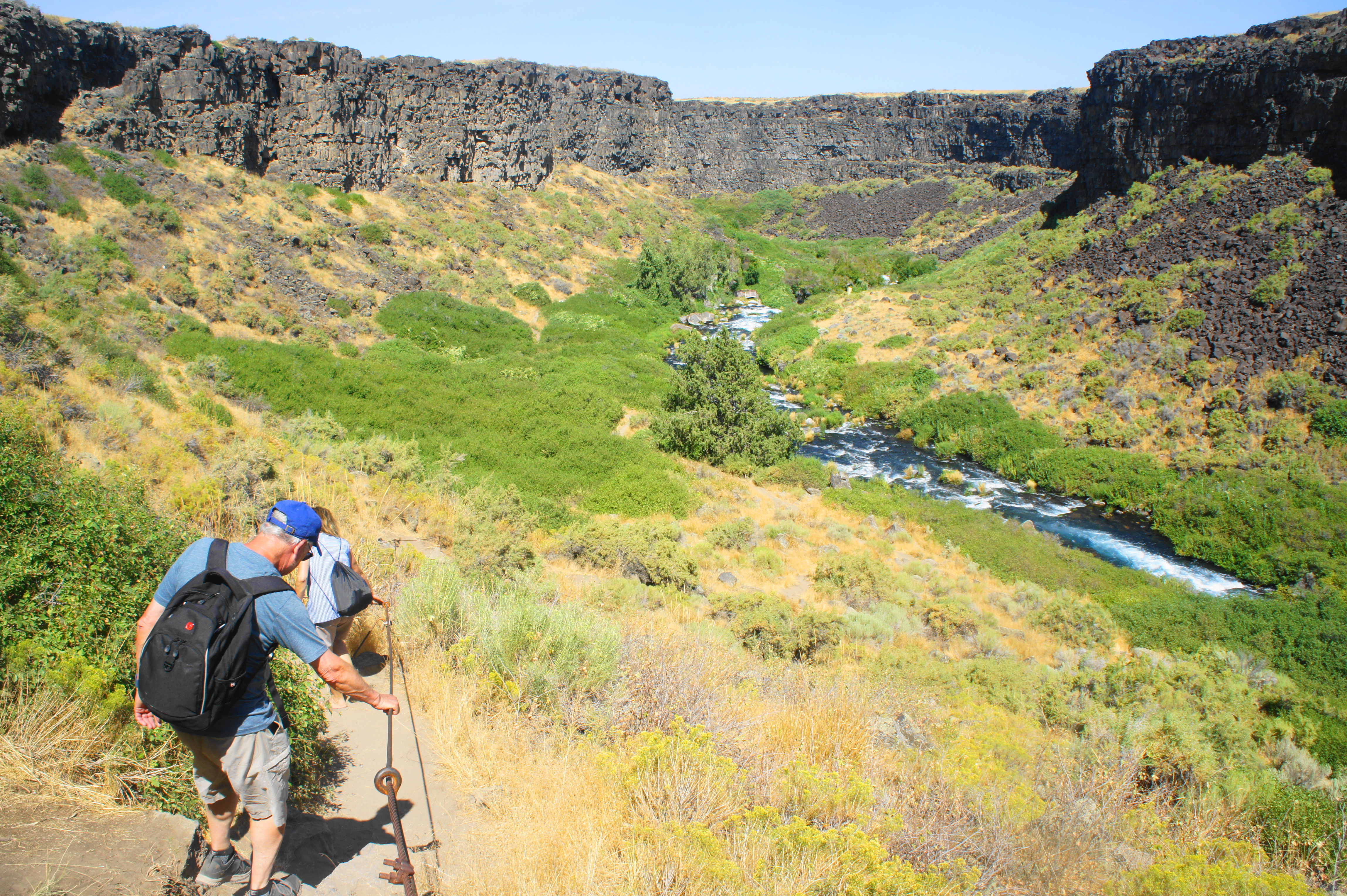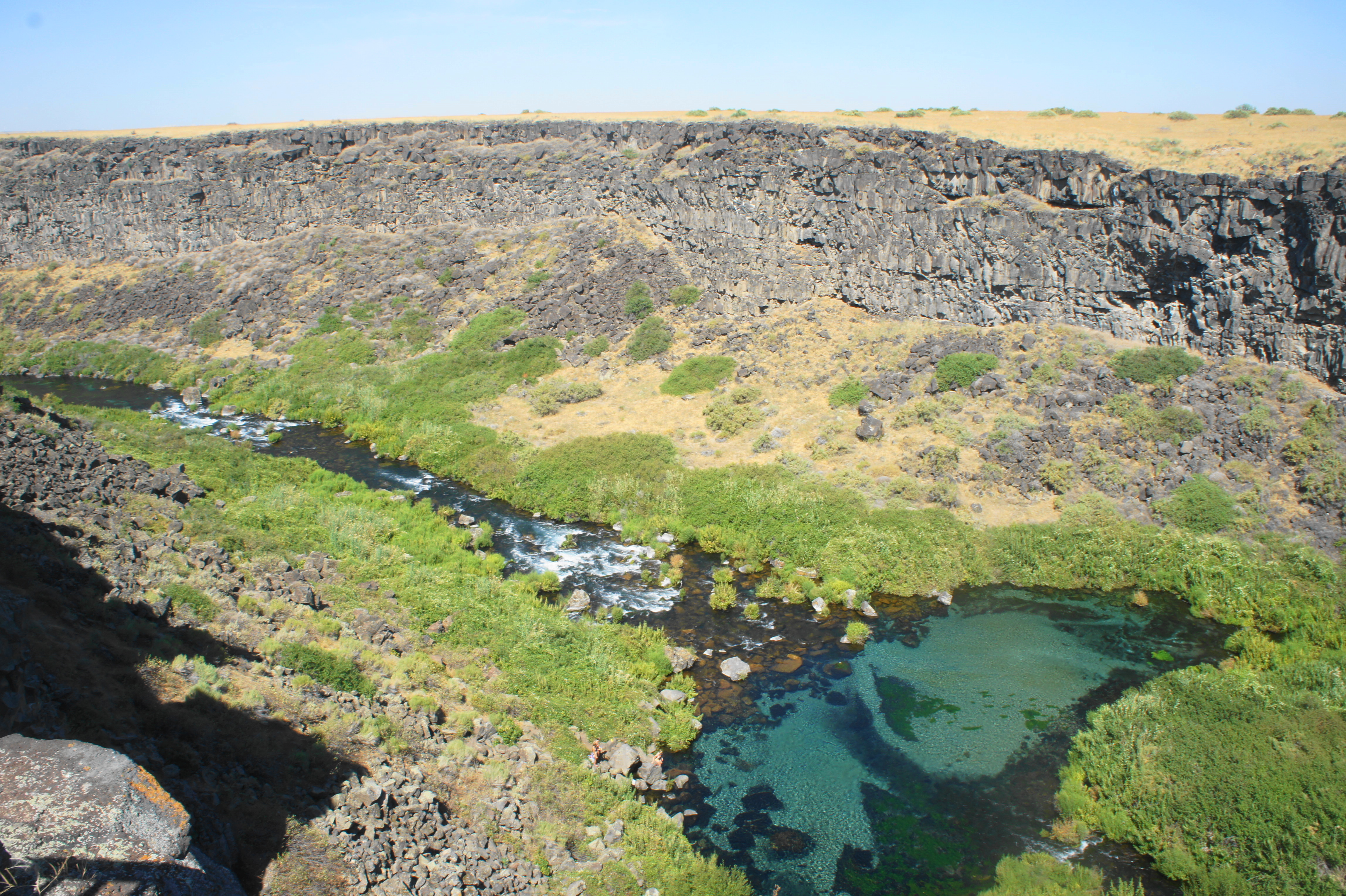 The one and only path heading from the trailhead is wide and well-trodden, clearly an old road. A short walk across the flat plain leads to the first overlook of Box Canyon Springs—the basalt-laced walls drop precipitously on three sides (hence the “box canyon”), revealing a lush landscape below: dense greenery and turquoise waters. The scintillating pools are fed by the subterranean aquifer, which seeps to the surface in the canyon. The pools give way to a river, which flows down-canyon.