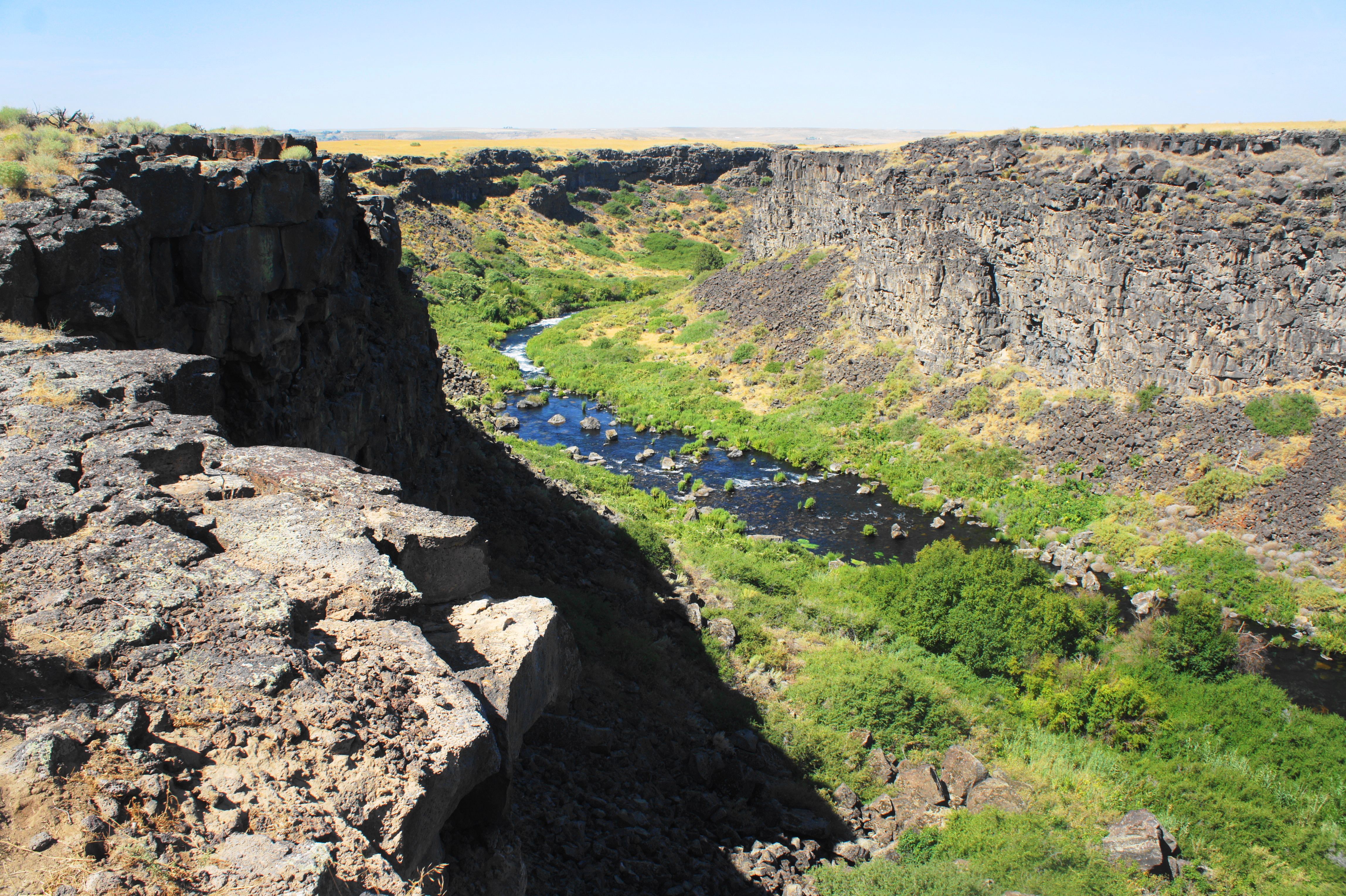 When approaching one of the many canyons of southwest Idaho, it is easy to have doubts: can such a feature even be possible amid all these flat plains? The crop fields of the Snake River Basin could pass, after all, for the vast lowlands of Kansas or Nebraska. Yet suddenly there it is: heading south toward Twin Falls, for example, the flatlands give way to a precipitous drop of hundreds of feet: to reach the city, on the other side of the canyon, one must either navigate a series of winding roads or cross the nearly 500-foot-tall Perrine Bridge. This is the doing of the Snake River, which over time has carved deep gorges into the bedrock of basalt and rhyolite.