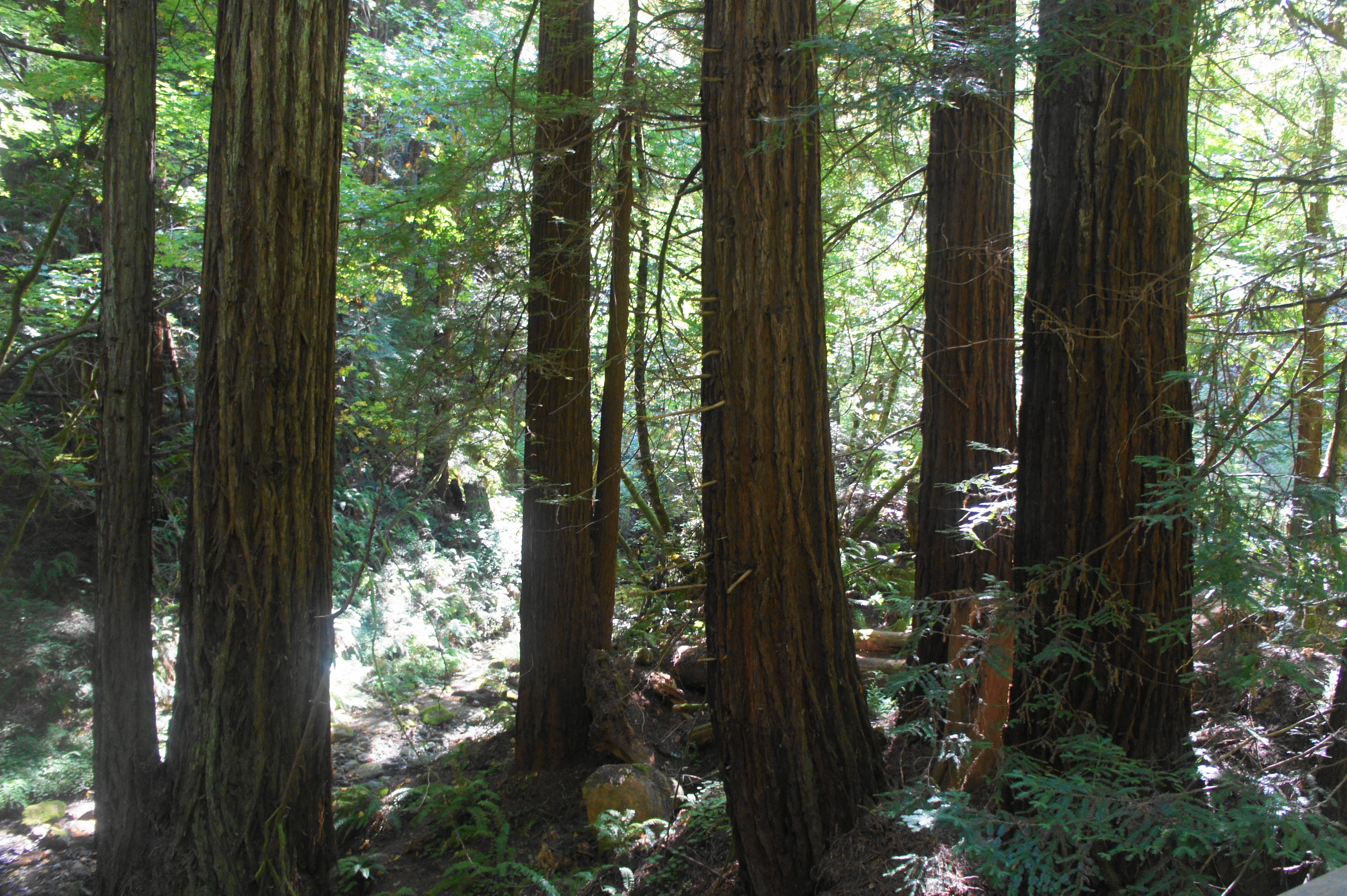 After this opening grove, a tributary of Purisima Creek comes in from the right. The next cluster of trees is the Cheney-Hart Grove on the left. Here the ripping creek adds to the charm of the densely-packed redwoods.