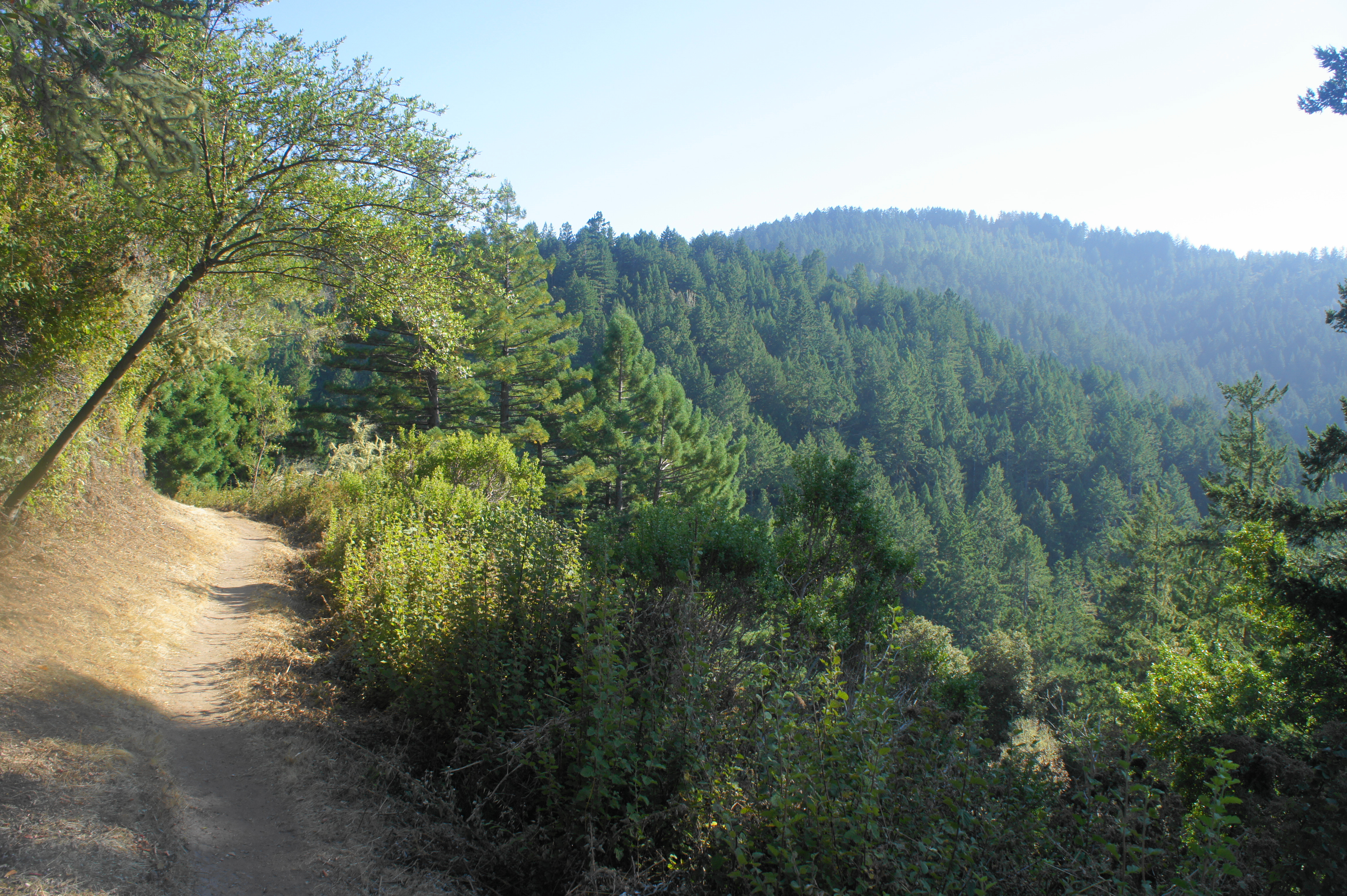 At 4.5 miles, a sign marks the Thomas Judson Grove on the right—a reminder that redwoods need not be clustered right along the water. The trees stretch up the hillside as far as the eye can see. Just beyond, a spur leads left to the banks of Purisima Creek, where there is a small cascade. At about the hike’s 5-mile mark, there is another named section on the left: the Harold and Nina Osborne Memorial Grove.