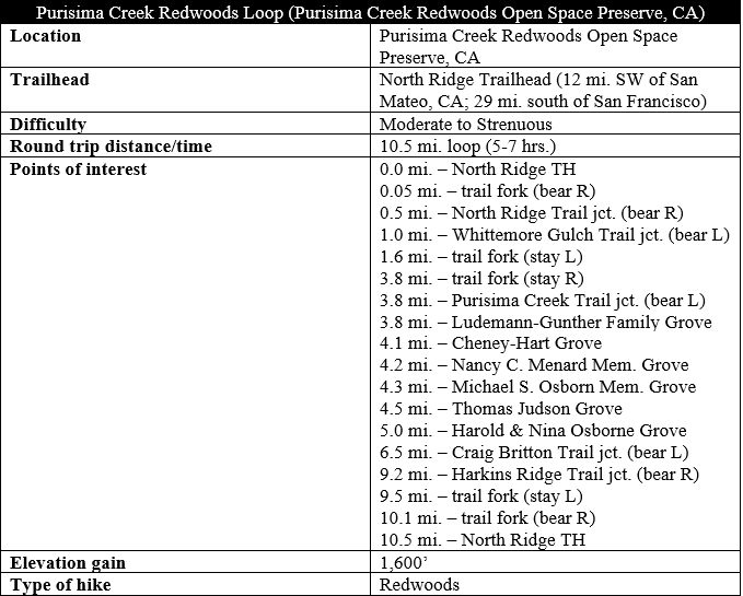The San Francisco Bay Area in northern California is a fantastic launching point for redwood hunters, with accessible groves of these mesmerizing trees within an hour and a half both north and south of the Golden Gate. While the largest groves lie further north, the Santa Cruz Mountains between the Bay Area and Santa Cruz offer an ample selection of redwood hikes. Purisima Creek Redwoods Open Space Reserve, a regional park, is one of the closest places to encounter impressive stands of second-growth redwoods, as well as sweeping views across the chaparral hillsides that descend to the Pacific Ocean. The 10.5-mile, full-day jaunt described below hits the highlights of the park, starting high in the oak/bay forest before dropping down through coastal scrub and returning via the redwood-studded Purisima Creek and Craig Britton Trails.