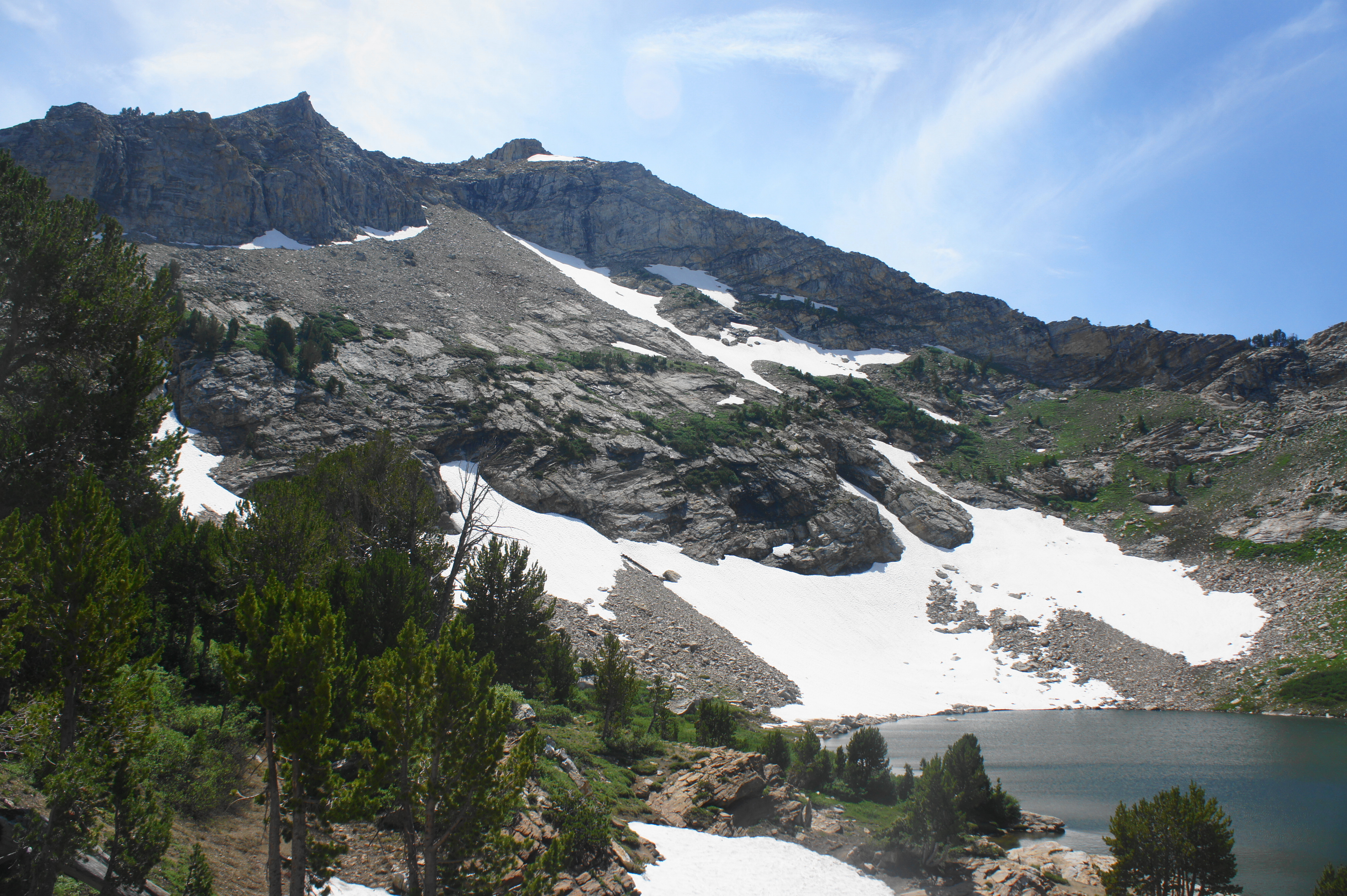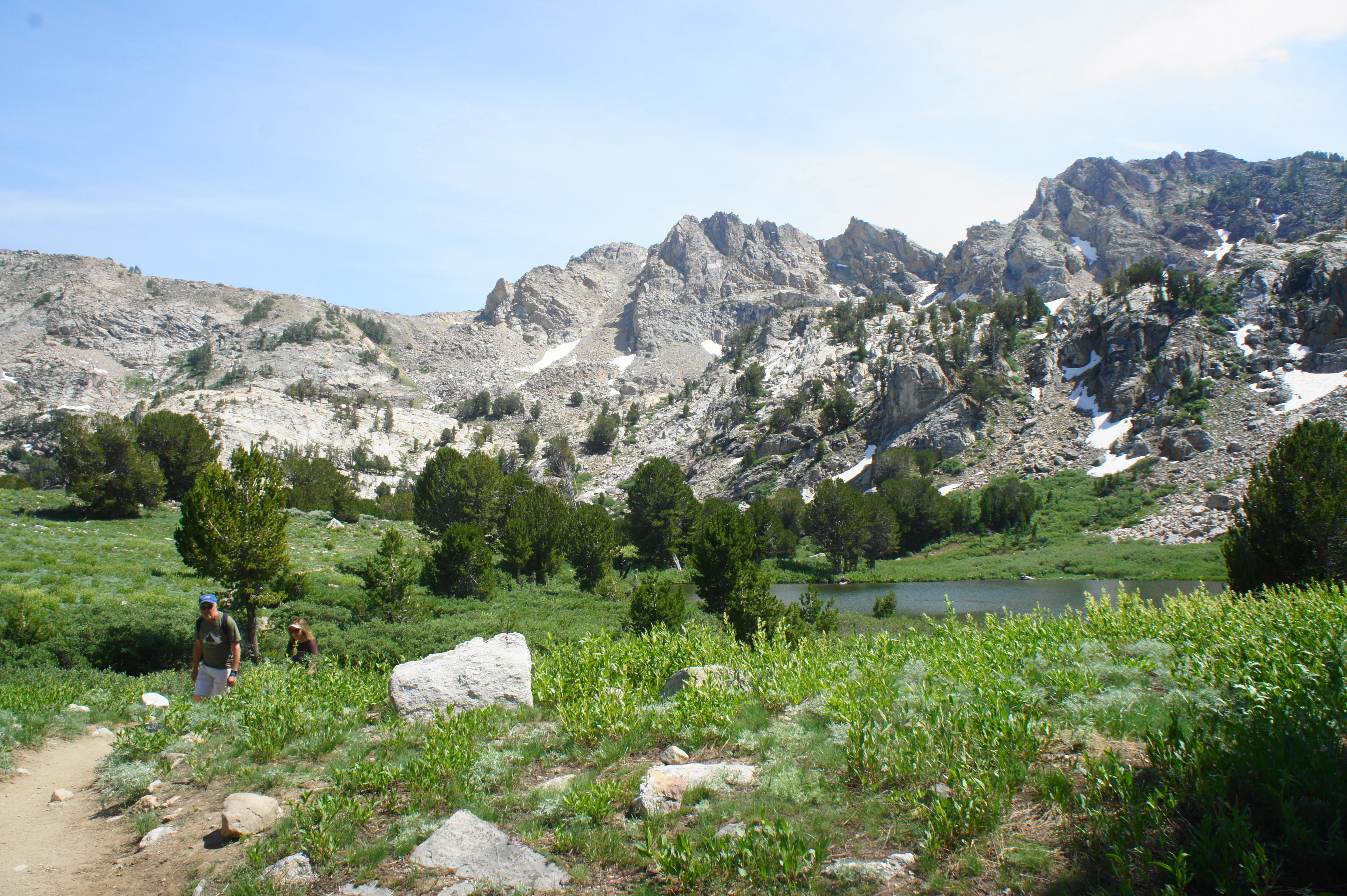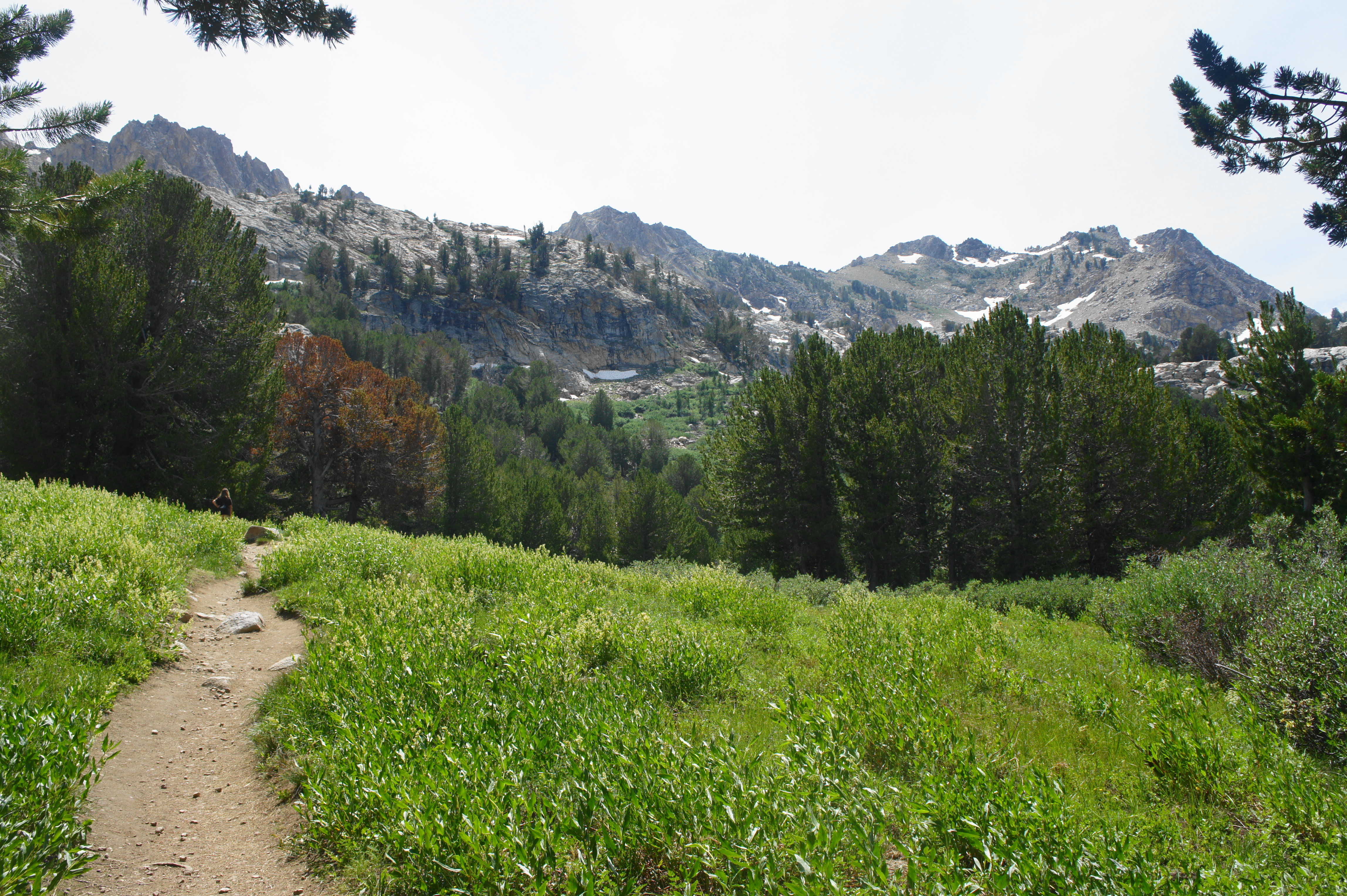 Just beyond, hikers must traverse a relatively fast-flowing stream: this flow drains the two Dollar Lakes, marshy but peaceful sights worth a visit on the left. Above the Dollar Lakes are Favre Point (10,879’) and an unnamed mountain that tops out at 10,865 feet.