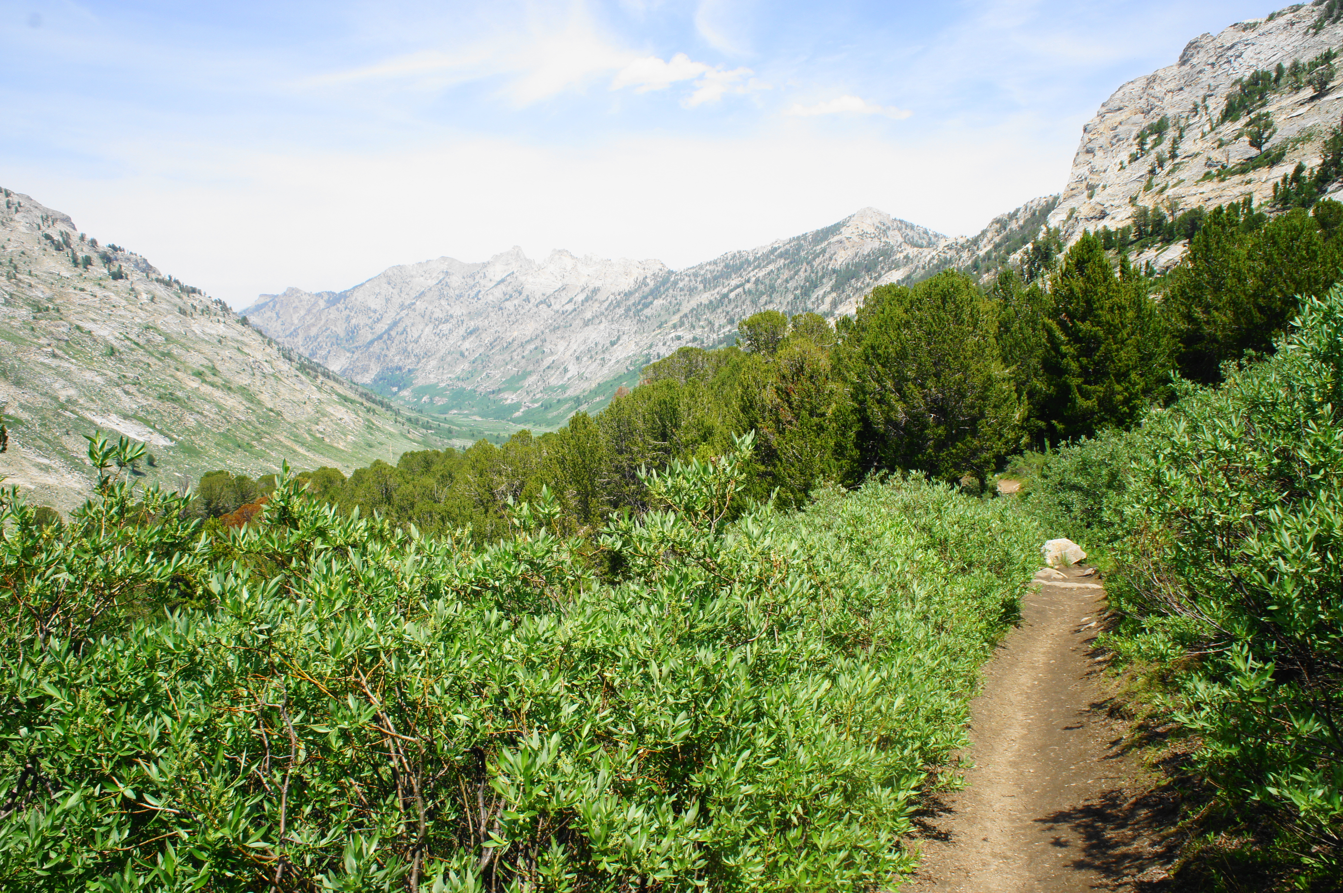 After several switches in short succession, the trail begins to level off, having cleared the hurdle of reaching the upper shelf of Lamoille Canyon. At 1.5 mile, arguably the best overlook of the hike awaits on the right: an unblemished, 180-degree view of Snow Lake Peak, Lamoille Canyon, and Verdi Peak. One can make out the tiny specks of the parking area, more than 800 feet below.