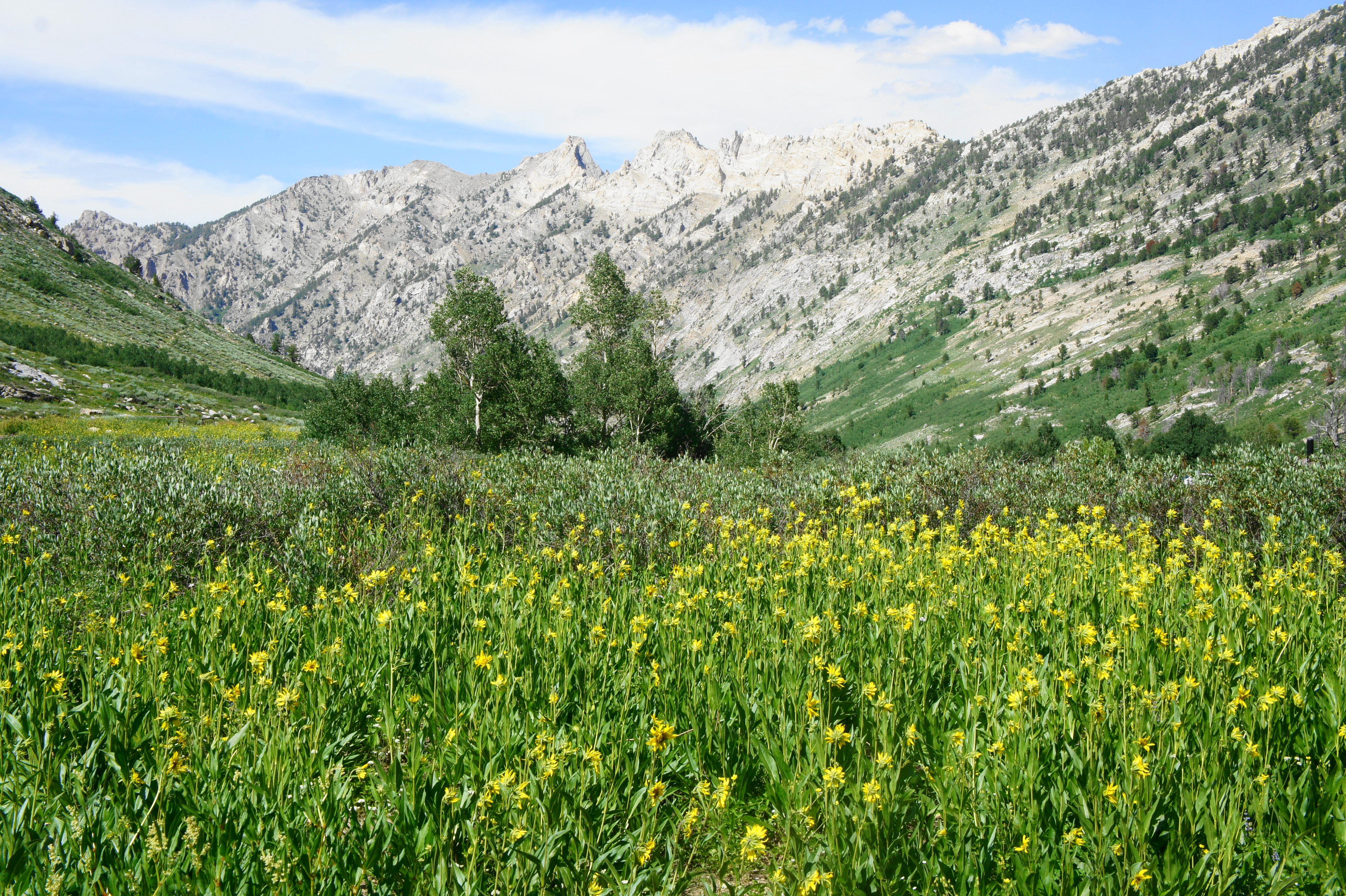 After passing through an initial field of wildflowers, the Ruby Crest Trail crosses a fork of Lamoille Creek, then enters a patch of woods with the main stream on the left. Rocky outcrops begin to replace the grassy patches, and hikers encounter a second stream crossing at about 4/10 mile. As the trail steadily ascends, brief breaks in the woods offer views of the high peaks to the west.