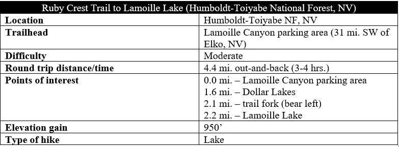 Unless you are a resident of Elko, Nevada—the nearest major town—chances are that you have not heard of the Ruby Mountains. Yet, at times, this spectacular range in northeast Nevada rivals the mountain scenery of the better-known Sierra Nevada or Colorado Rockies. From the jumping-off point at Lamoille Canyon, hiking trails take off in several directions, but the most appealing is to the head south, following the 36-mile Ruby Crest Trail through the heart of the range. While the entire Ruby Crest is best reserved for backpackers, day hikers can bite off a small chunk of it with the 4.4-mile round-trip climb to Lamoille Lake, an alluring glacial tarn situated just above the timberline.