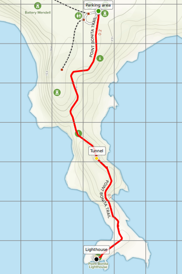 The Point Bonita Trail begins at the Bonita Lighthouse Parking Area, situated roughly four miles west of the Golden Gate Bridge in Golden Gate National Recreation Area. (Note: Along the way, stop by the Marin Headlands Visitor Center for information.) There is, however, very limited parking at Bonita Lighthouse. Expect to have to find a spot instead, back up Field Road about 3/10 mile, at Battery Alexander Parking Area, which is considerably more spacious. (Note: From here there is a 3/10-mile connector trail that follows the road down to the Bonita parking area.) This area was previously part of Fort Barry, a former Army base active during the first half of the 20th century. The army’s primary purpose here was coastal defense, lining the cliffs of the Marin Headlands with artillery batteries that, fortunately, never saw action during World War I or II.
