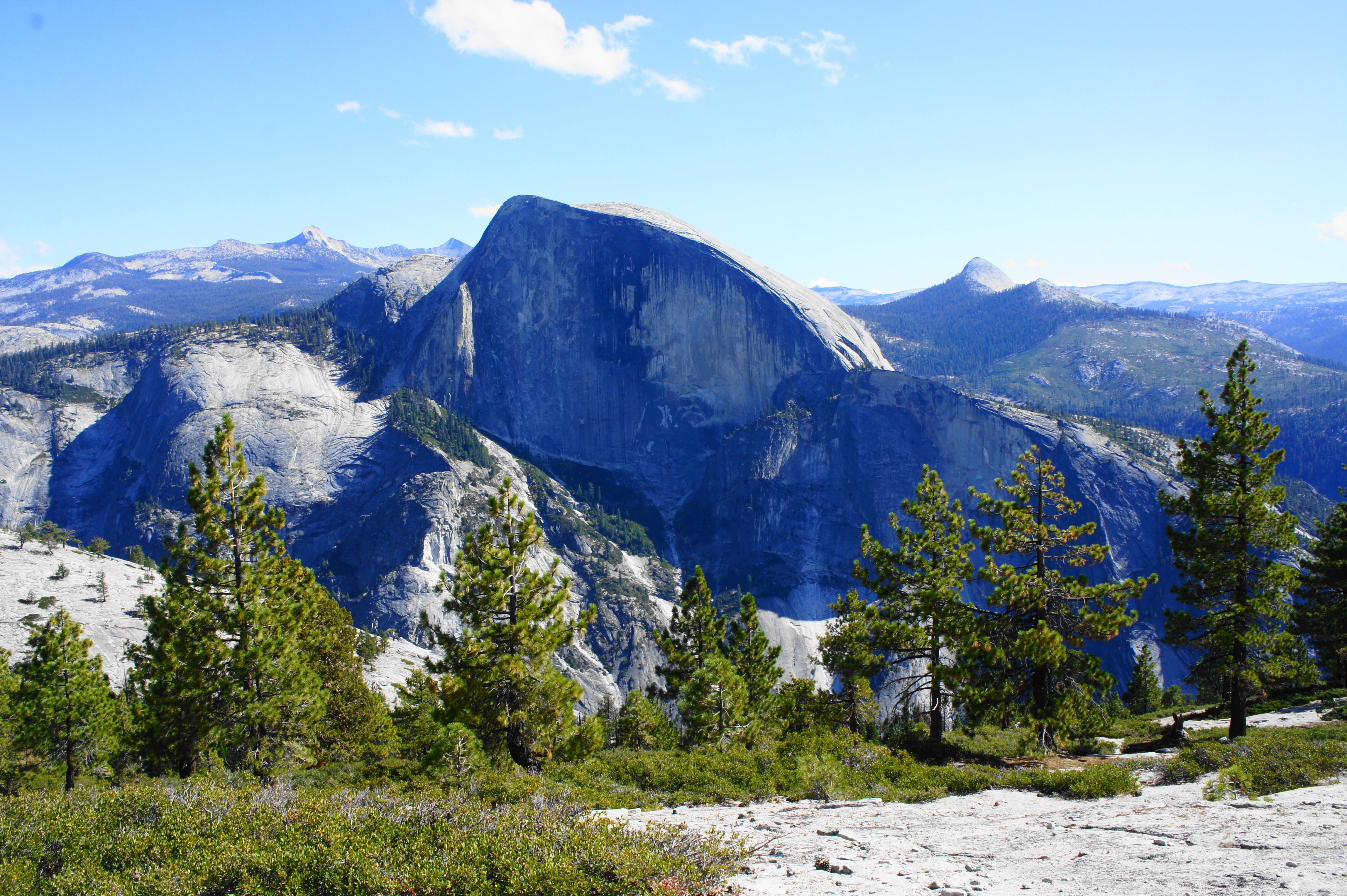 The final ascent to Indian Ridge is particularly steep but brief, ending at about 2.9 miles with a trail junction. Here a spur trail to Indian Rock heads left; leave this for your return journey. Continue right as the North Dome Trail traverses the top of Indian Ridge, first downhill, then slightly uphill an over a second hill. At 3.3 miles, the trees give way to pure granite, and hikers get their first views of Half Dome on the left.