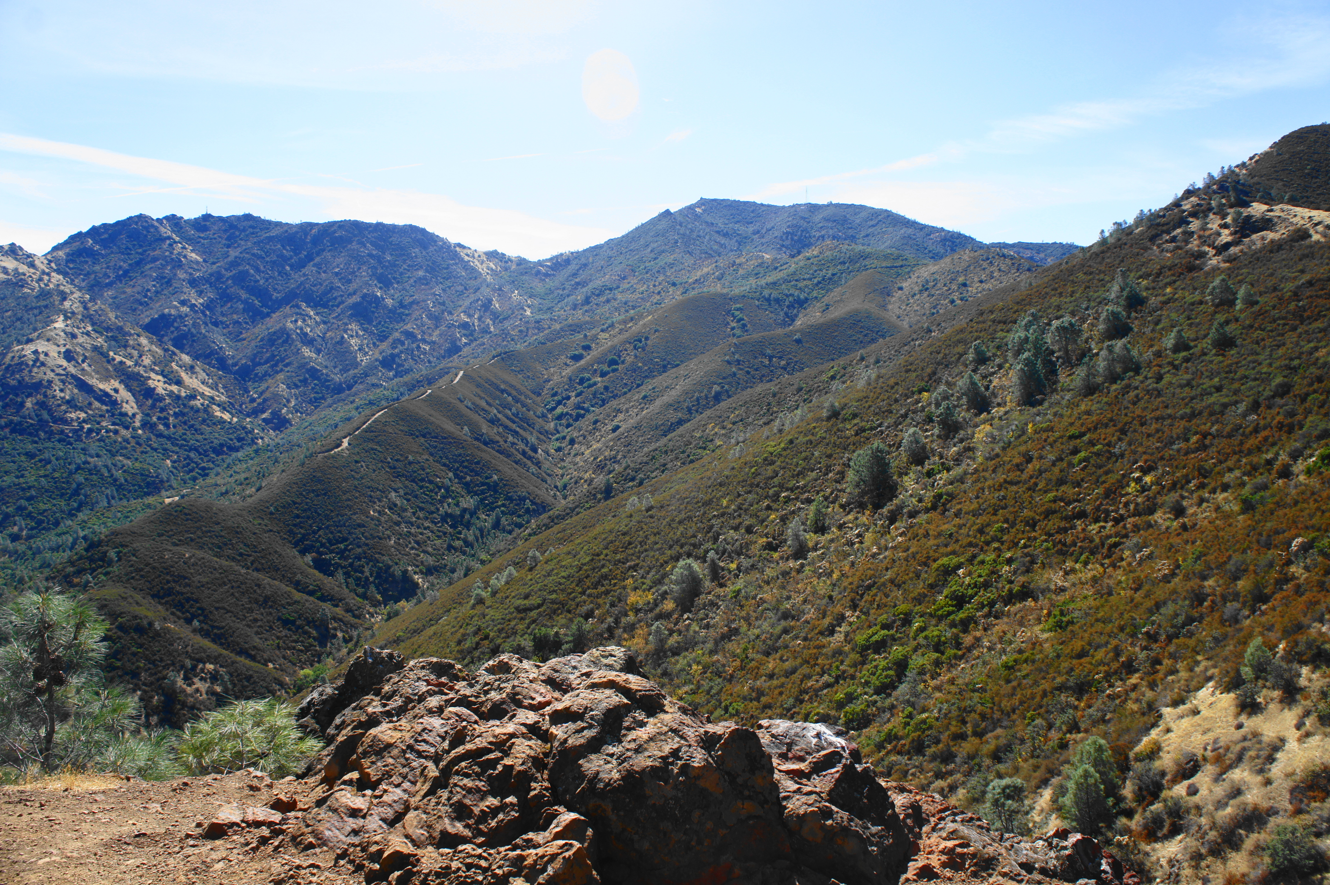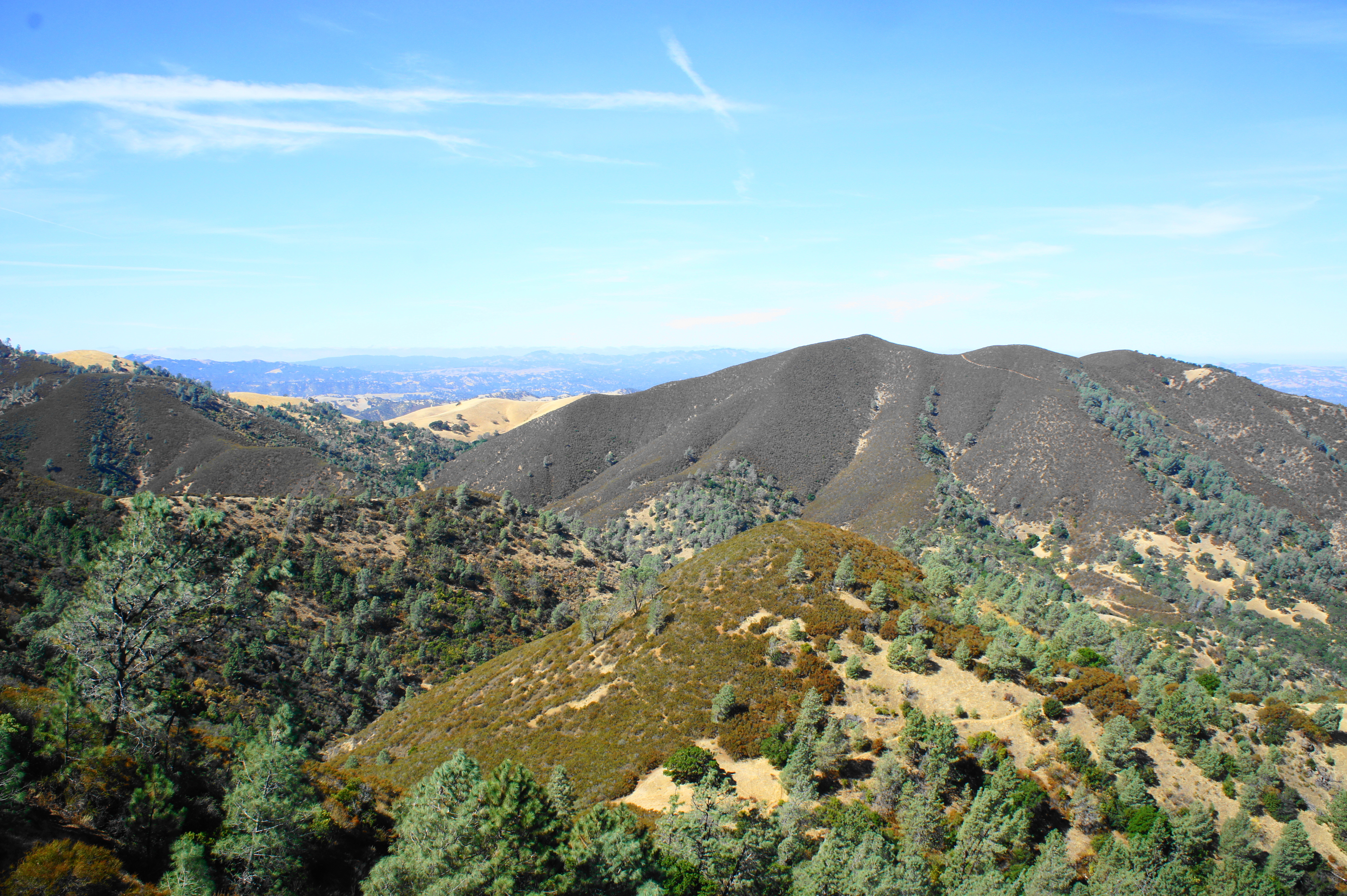 The Bald Ridge Trail begins by ascending through a lovely grove of manzanitas, lush and green year-round. Soon enough, however, the thicket gives way to grasslands and rocky outcrops, and hikers clear Bald Knob (2,645’) at about 3.8 miles. As the trail bobs up and down, the landscape changes again, this time to a scorched area charred by a recent brush fire.