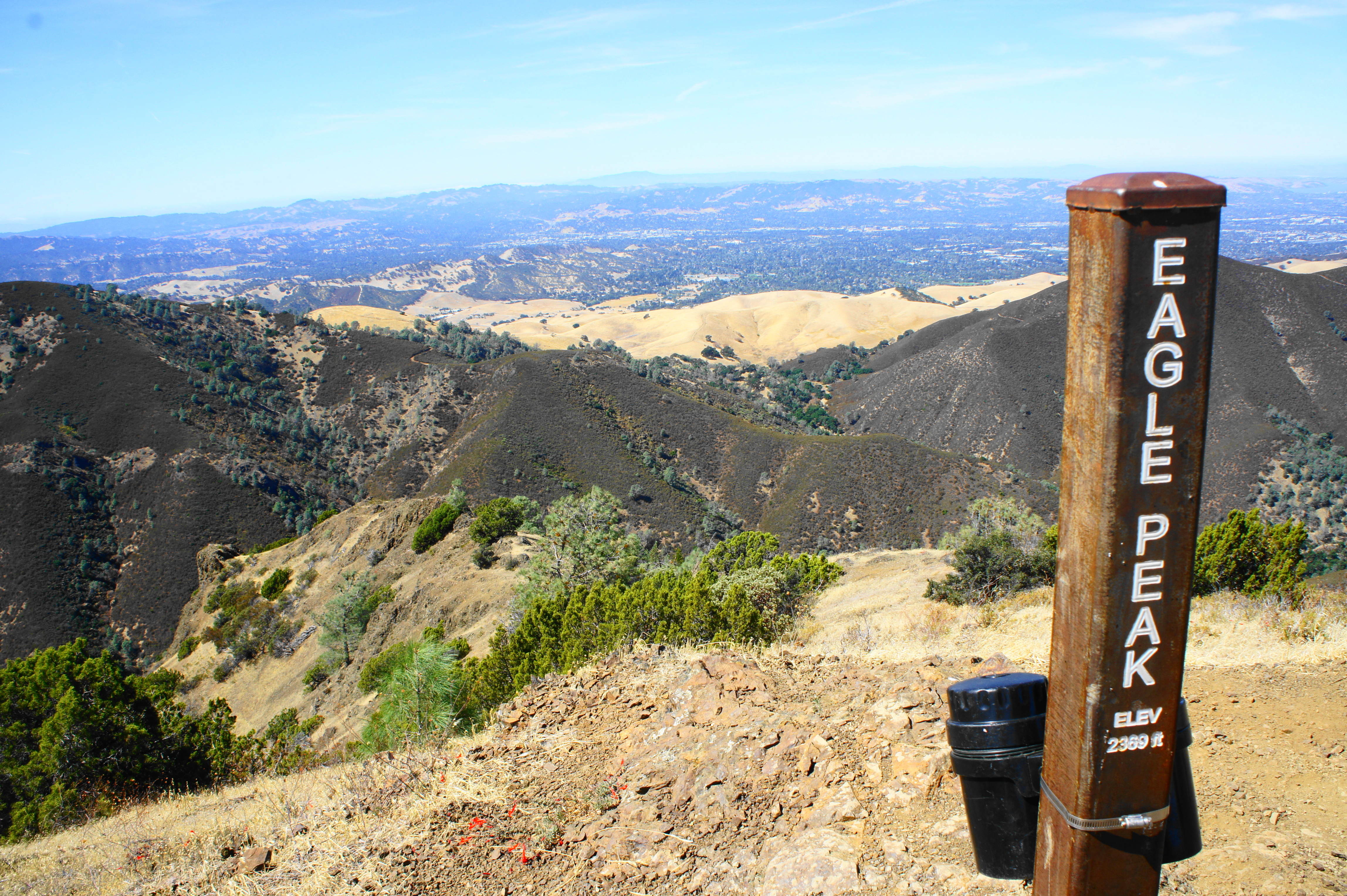 Eagle Peak, at 2.8 miles, is a terrific place to stop for lunch or a break, taking in the panoramic views, some of the best of the hike. Although not as high, Eagle Peak is in some ways preferable to Mount Diablo: its summit is more remote and wild, free of roads and stores and parking lots.