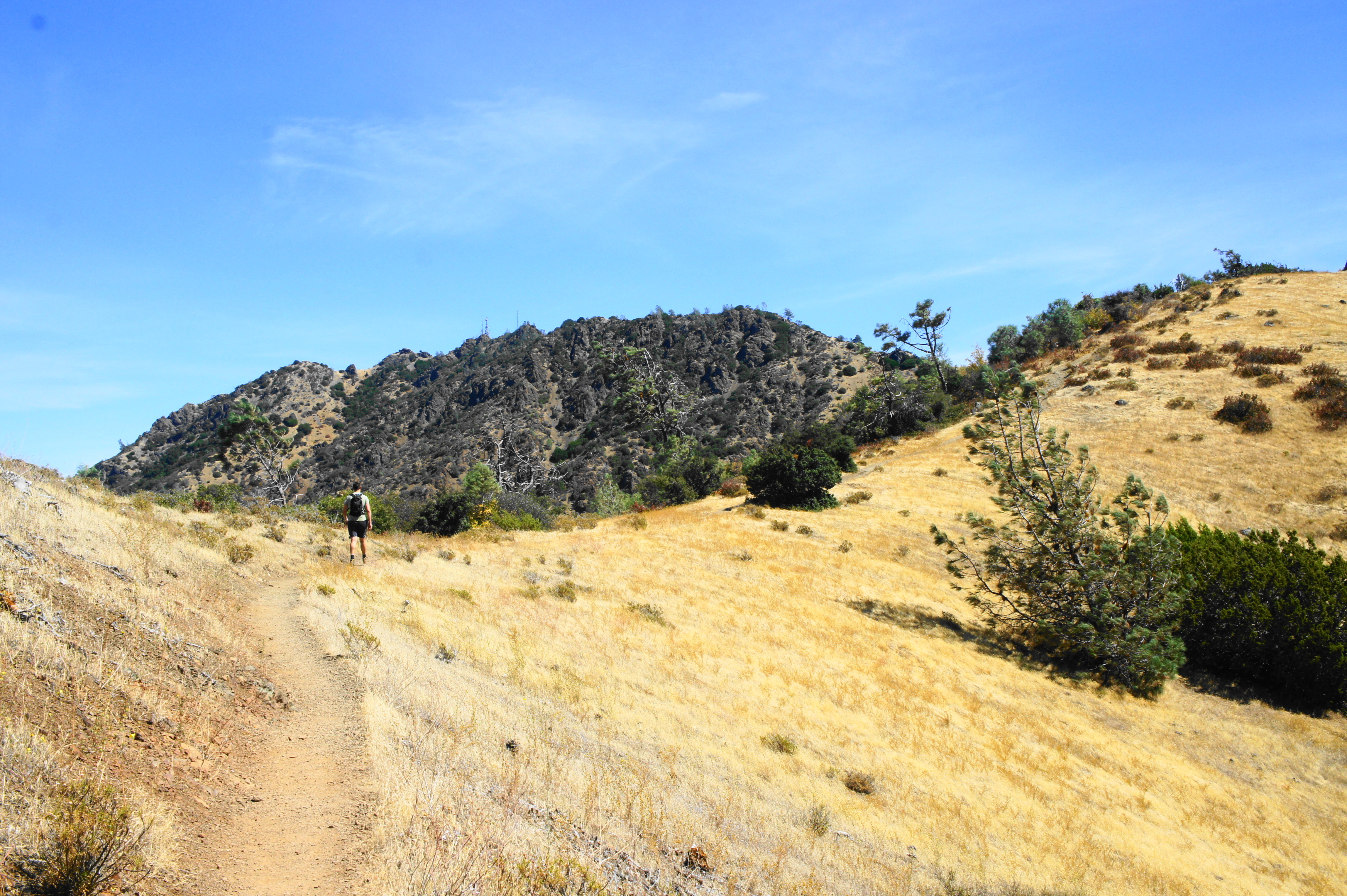 Beyond Eagle Peak, the trail begins a rocky descent to a low saddle. While the downhill is welcome after ascending more than 1,700 from Mitchell Canyon Staging Area, shedding 300 feet in elevation to reach the saddle means hikers will have to make it up again as they continue onward to Mount Diablo. After reaching the gap, the trail resumes its ascent amid thick sagebrush. At 3.6 miles, hikers cross Meridian Ridge Road at Murchio Gap (3,330’), where the Back Creek Trail comes in from the left. Continue straight on the Bald Ridge Trail, following the sign for Prospectors Gap Road.