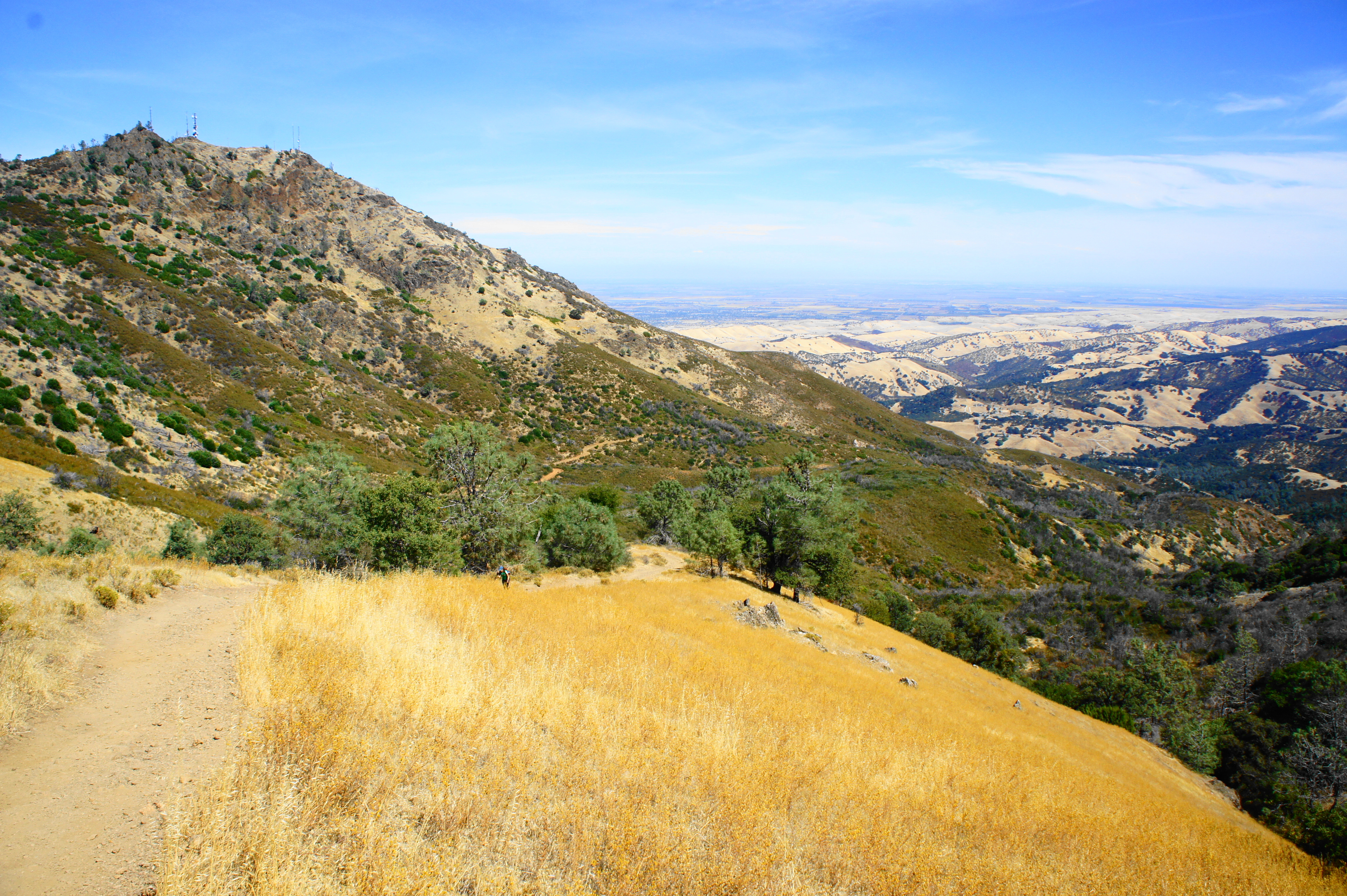From here, bear right on the Summit Trail, which provides the final approach to the top of Mount Diablo. The trail climbs steeply at first before settling into a more modest grade as it parallels the road below on the left. The Mount Diablo antenna tower is visible ahead.