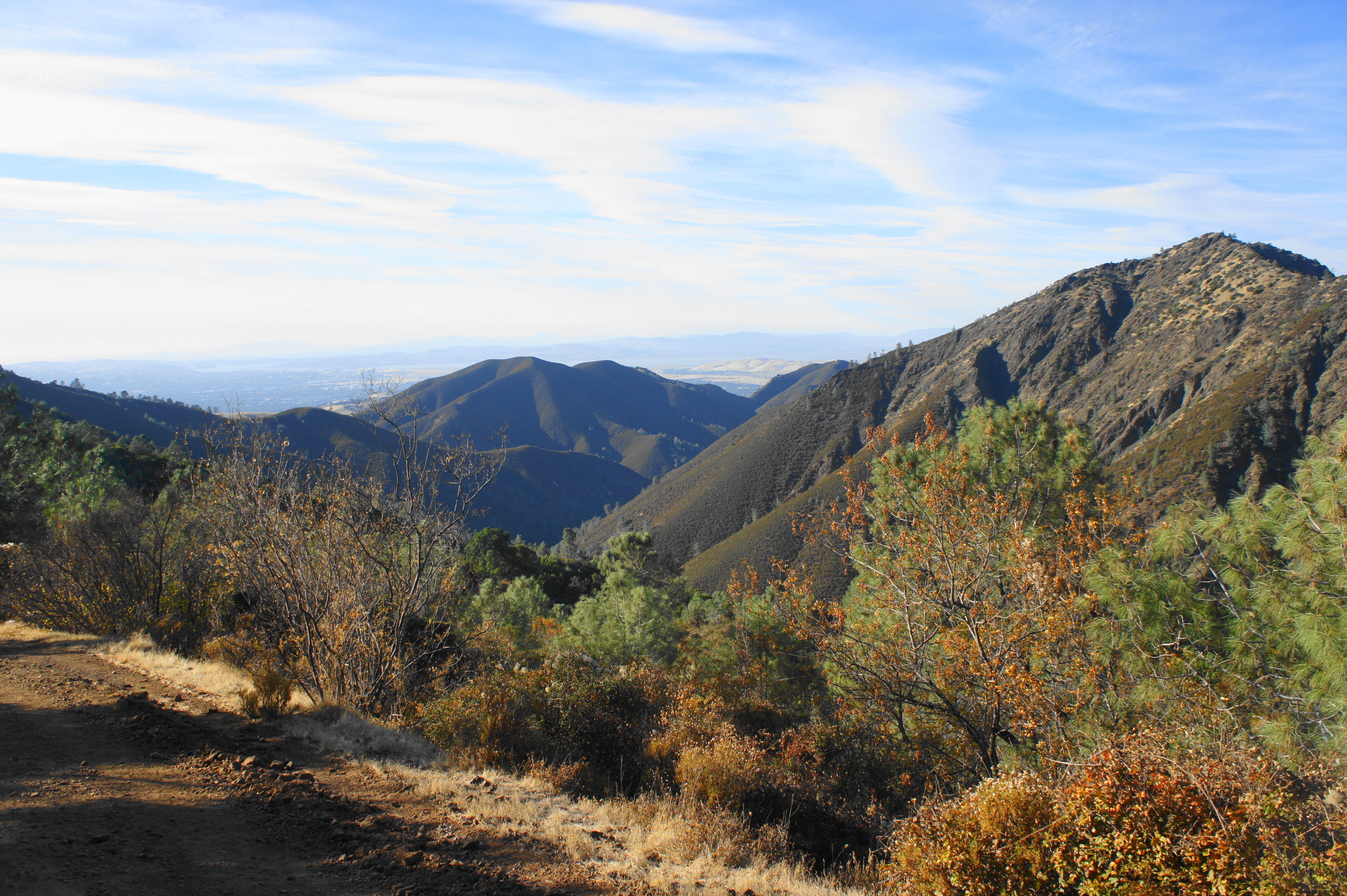 The Bald Ridge Trail terminates at Prospectors Gap Road, situated between Mount Diablo and North Peak. Bear right on the dirt track, then a quick right again at the start of the North Peak Trail, which connects the gap with the Mount Diablo summit. Rather than ascending Diablo’s precipitous northern slopes, the trail slowly circles around the mountain to the south. Following a steep initial ascent, the grade lessens as views open up to the south and east: the Diablo Range and Black Hills continue for miles into the distance.