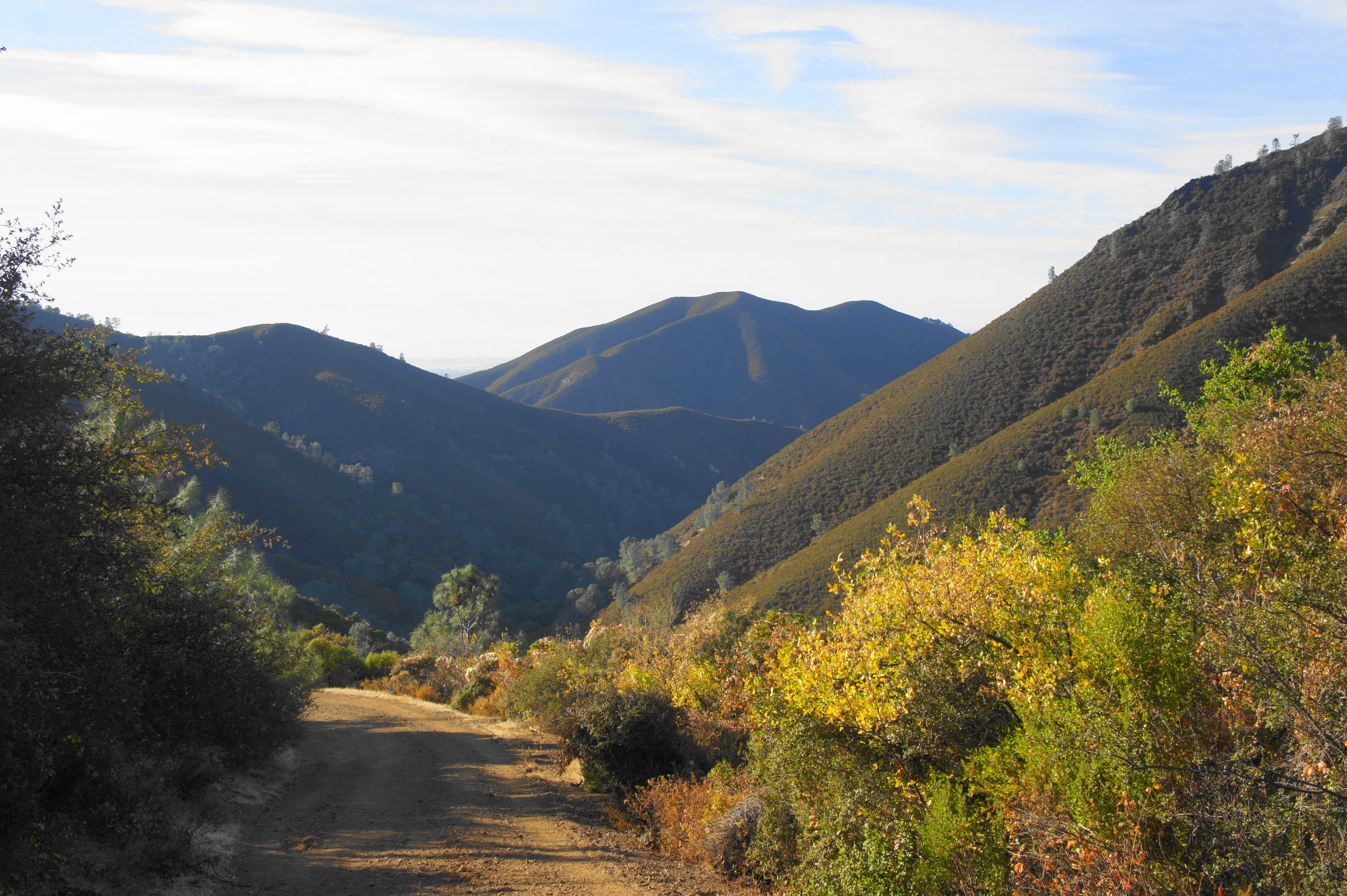 Follow Deer Flat Road as it passes a campground bathroom on the left, then continue straight as the road turns to dirt, passing through the gate. Stay straight at the junction with the Juniper Trail continuation at the 8-mile mark, following the wide grade as it skirts the west-facing hillside. The subsequent section is one of most scenic of the hike, as the grassy hillsides slope sharply down to the valley below.