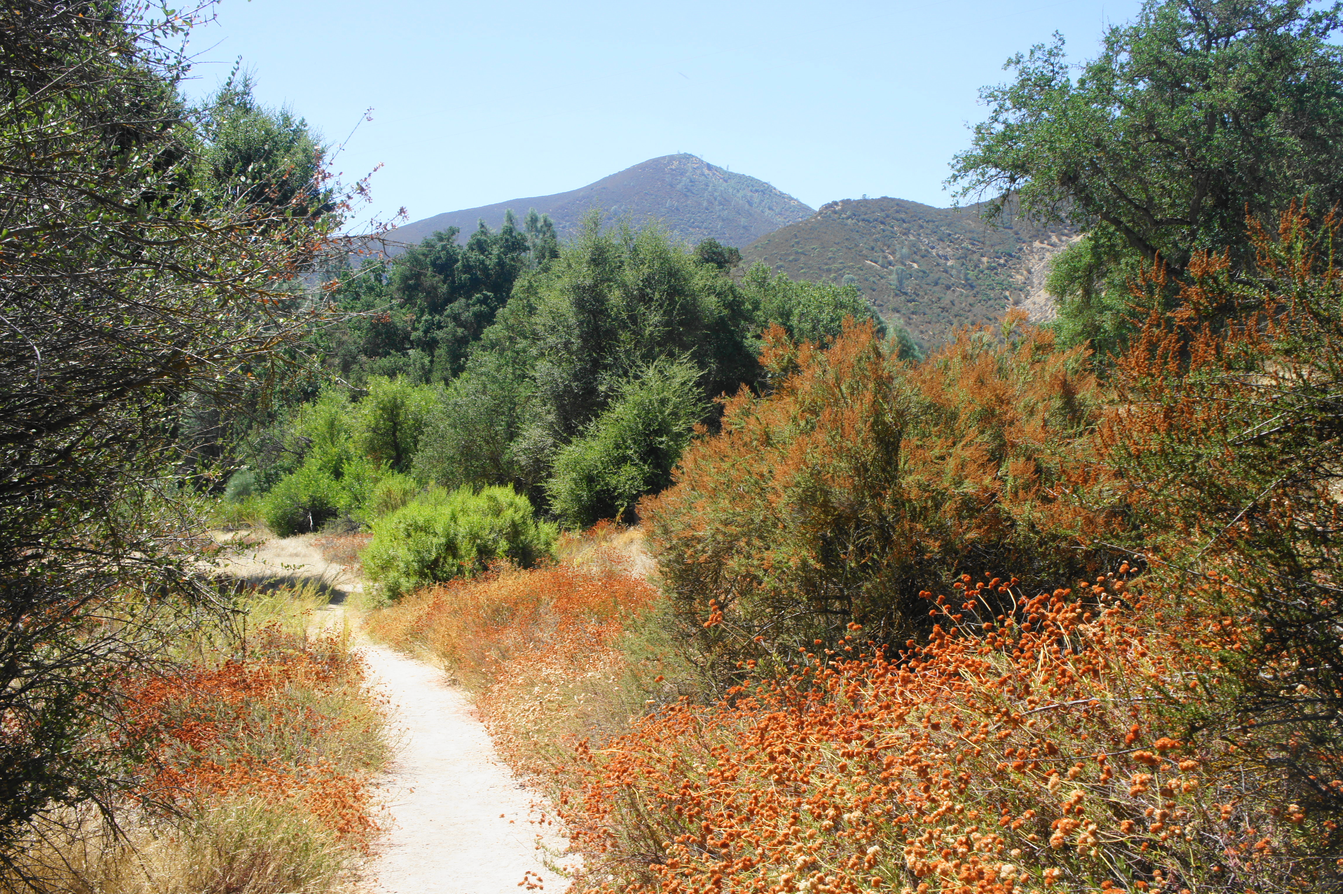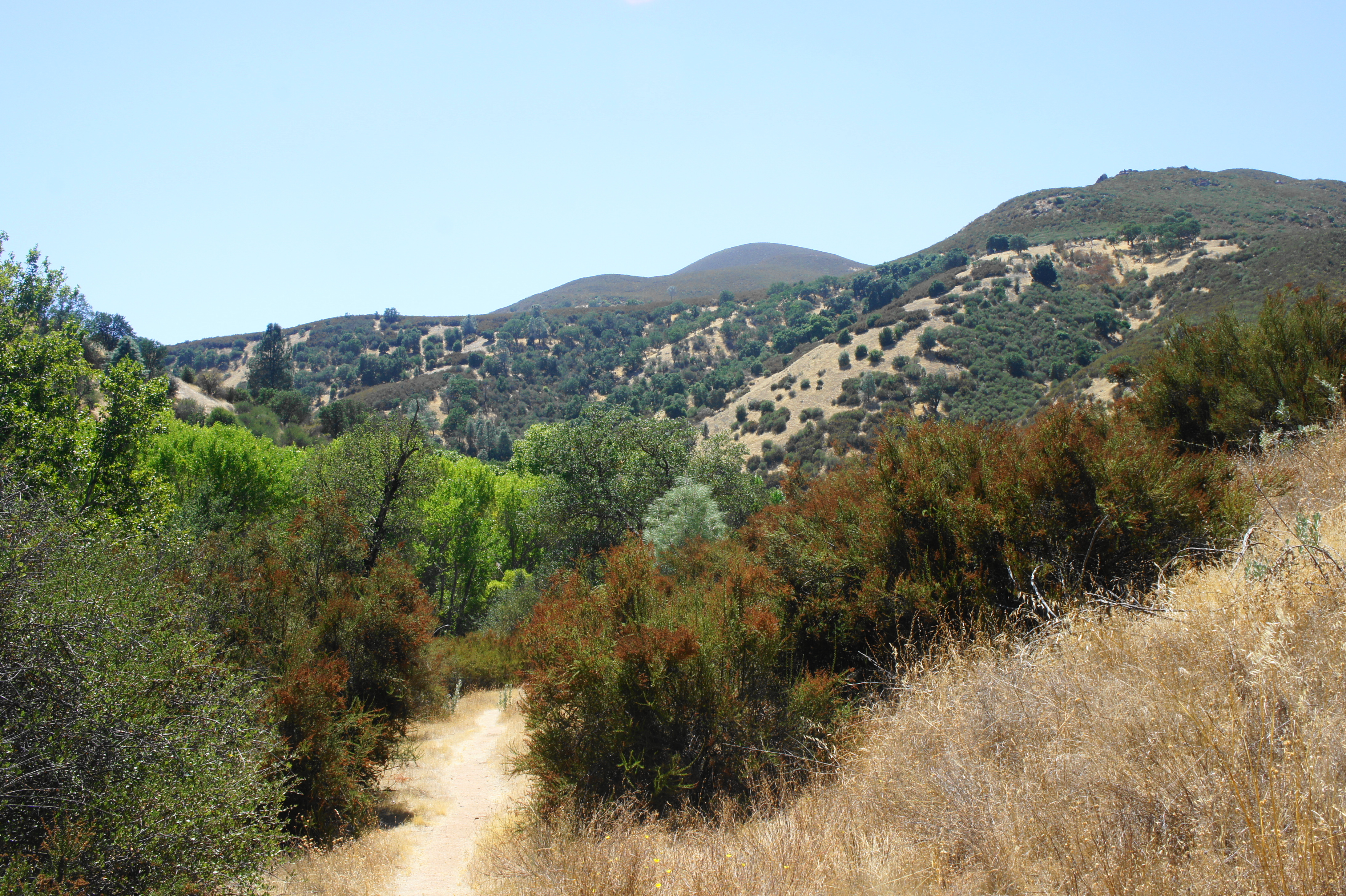 The views from this area are decent: the chaparral valley continues southward, at the base of a series of sloping peaks on the right. None of this hike, however, is overwhelming, and hikers are likely to be captivated less by grandeur than by relief that the trail has ended. Of course, it’s a 2.9-mile return journey to the trailhead, back the way you came. At least a series of nice oaks, pines, and sycamores provide some relief from the hot sun. All told, the out-and-back clocks in at around 5.8 miles, a hike that should take 3-4 hours. The elevation gain is rather negligible, although there are some climbs and dips that make this a potentially moderately difficult hike.