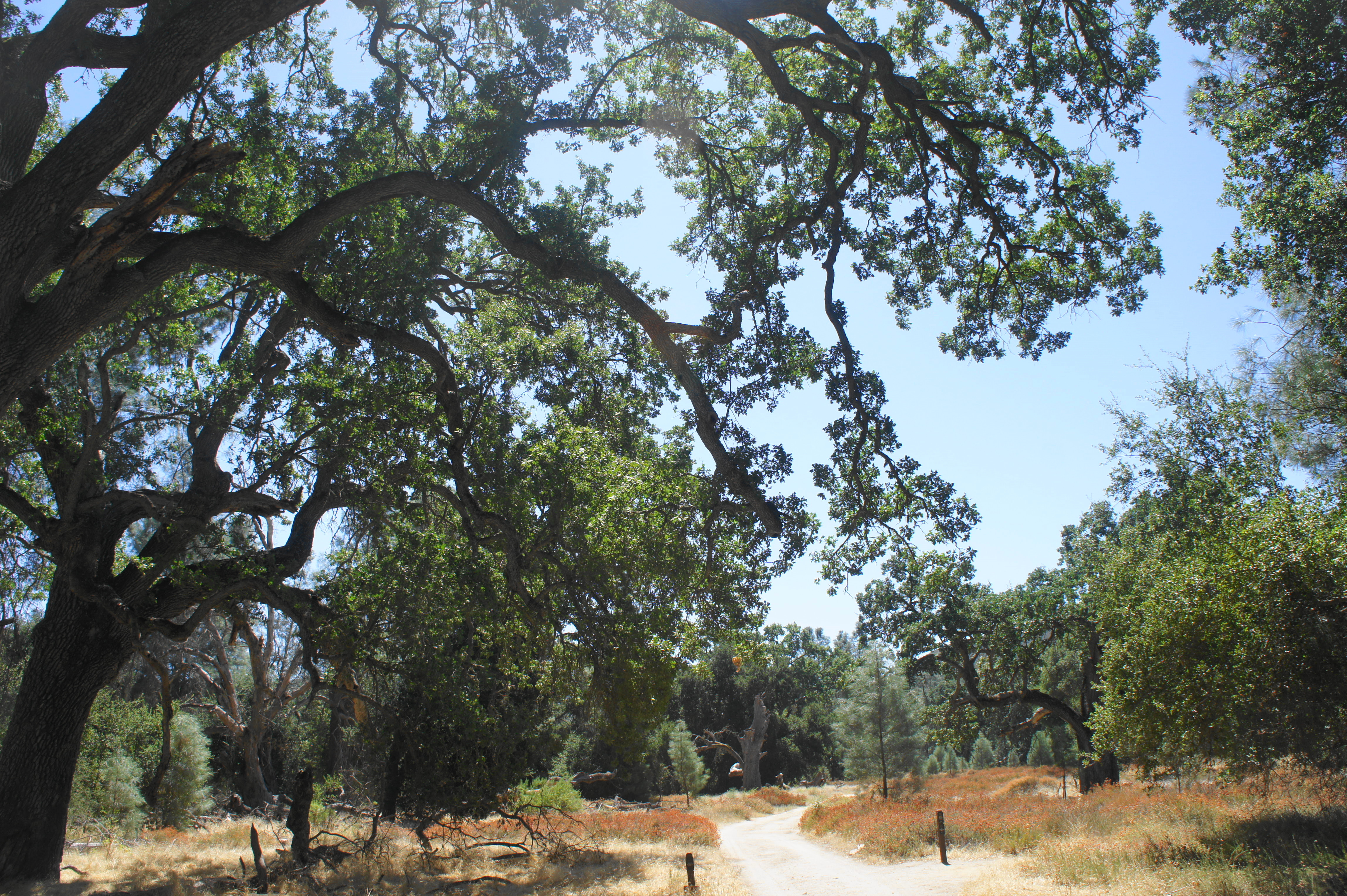 At 6/10 mile, the Bench Trail intersects a gravel fire road heading south. Bear left on the road, then continue straight as the Bench Trail continues off to the right around 70 yards later. This area is one of the prettiest of the hike, with towering valley oak trees providing temporary shade.