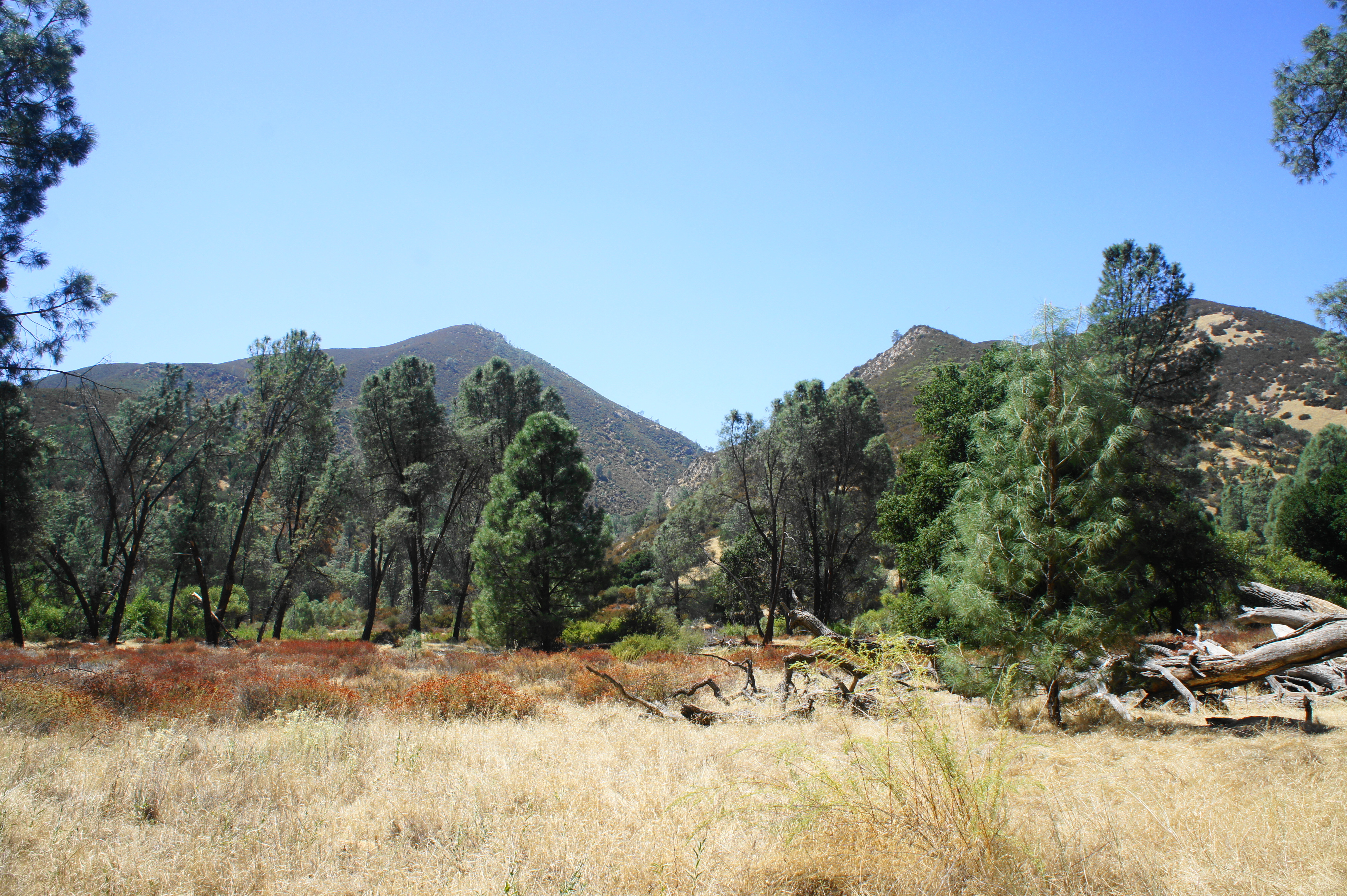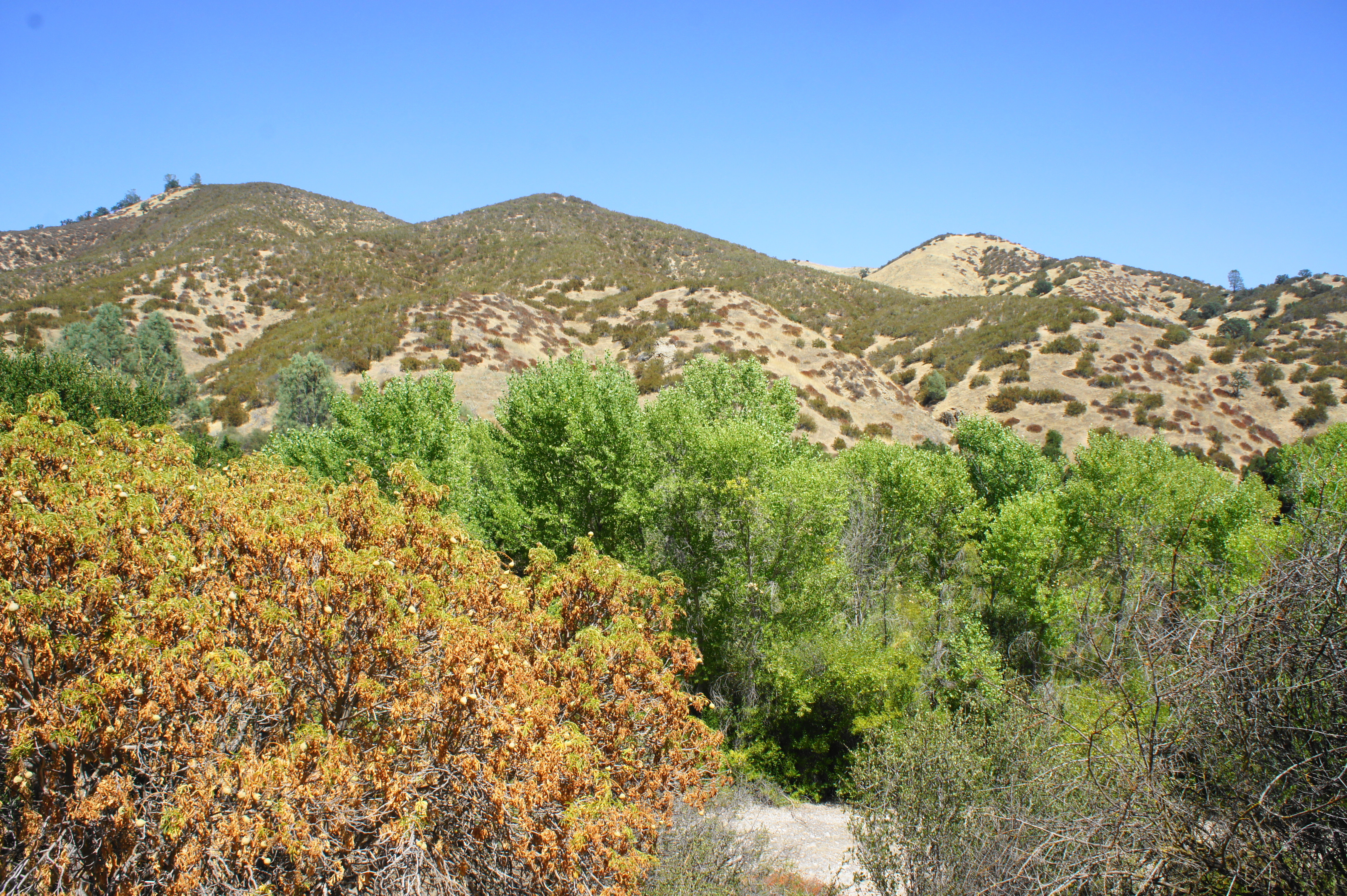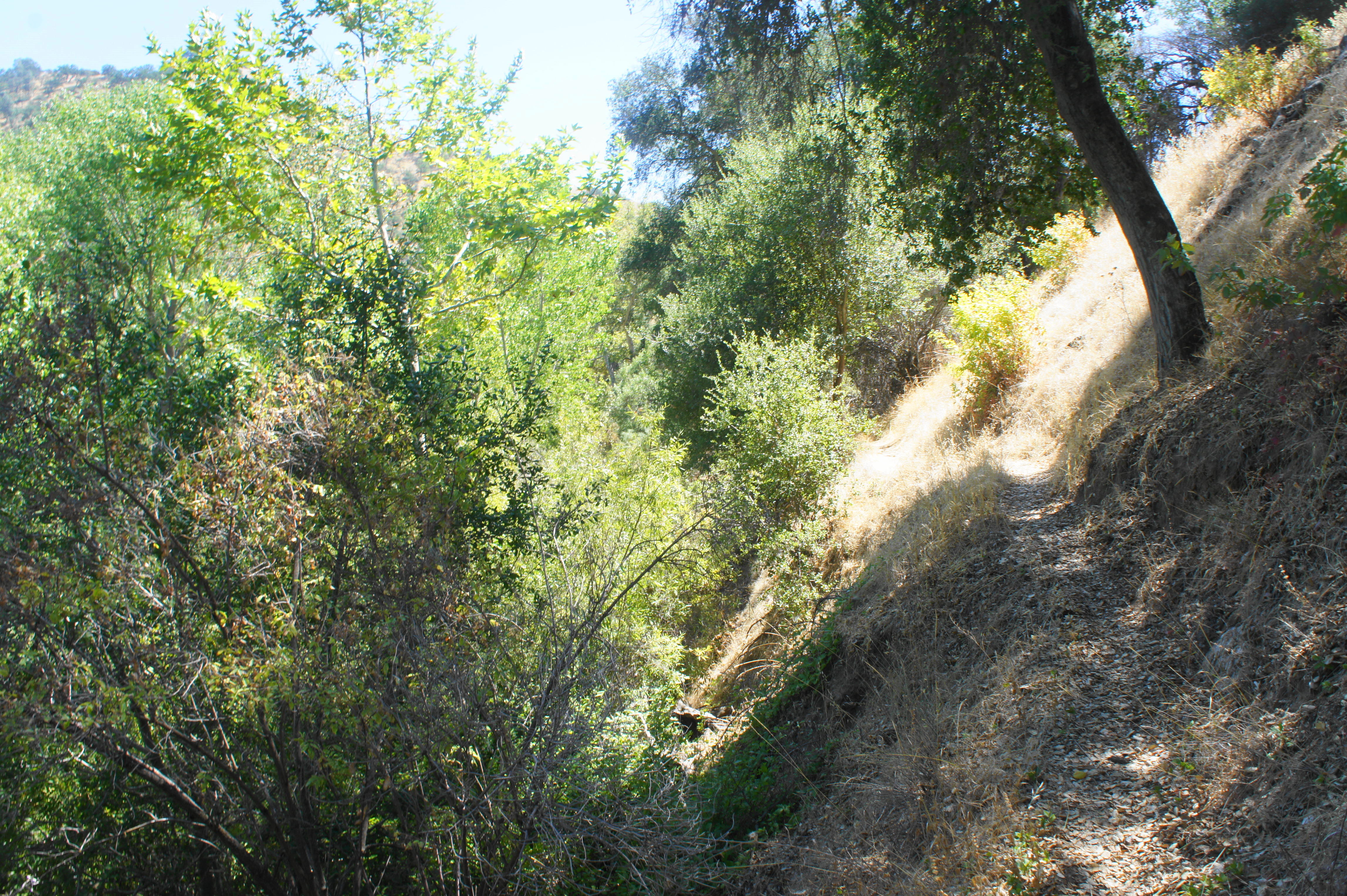 Follow the faint path up the valley, keeping the creek on your left. At 1.1 miles, two tall pines and a sycamore provide shade on a hot day. Shortly after, the trail runs right up to the base of the hillside on the right but does not climb it, staying in the low floodplain of Chalone Creek.
