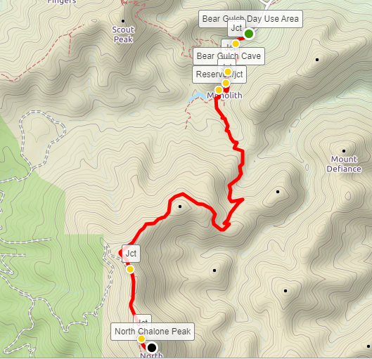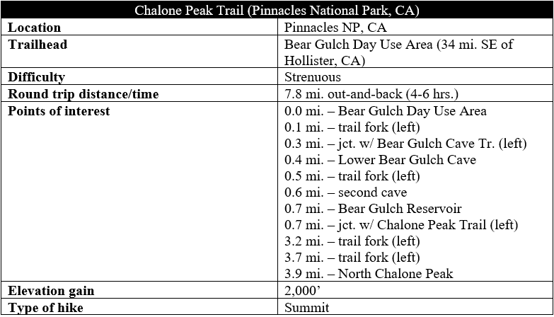 Rising to 3,304 feet, Chalone Peak is the highest point in California’s Pinnacles National Park and a worthy challenge for peak-baggers who seek to brave the exposed sun and 2,000 feet in elevation gain to reach the summit. The Chalone Peak Trail juts off from the end of Bear Gulch Cave in the eastern section of Pinnacles and climbs through a section of the park’s namesake spires and knobs before ascending a scrubby ridgeline to the windy highpoint. In terms of distance and elevation gain, this is probably the most difficult maintained hike in the park.
