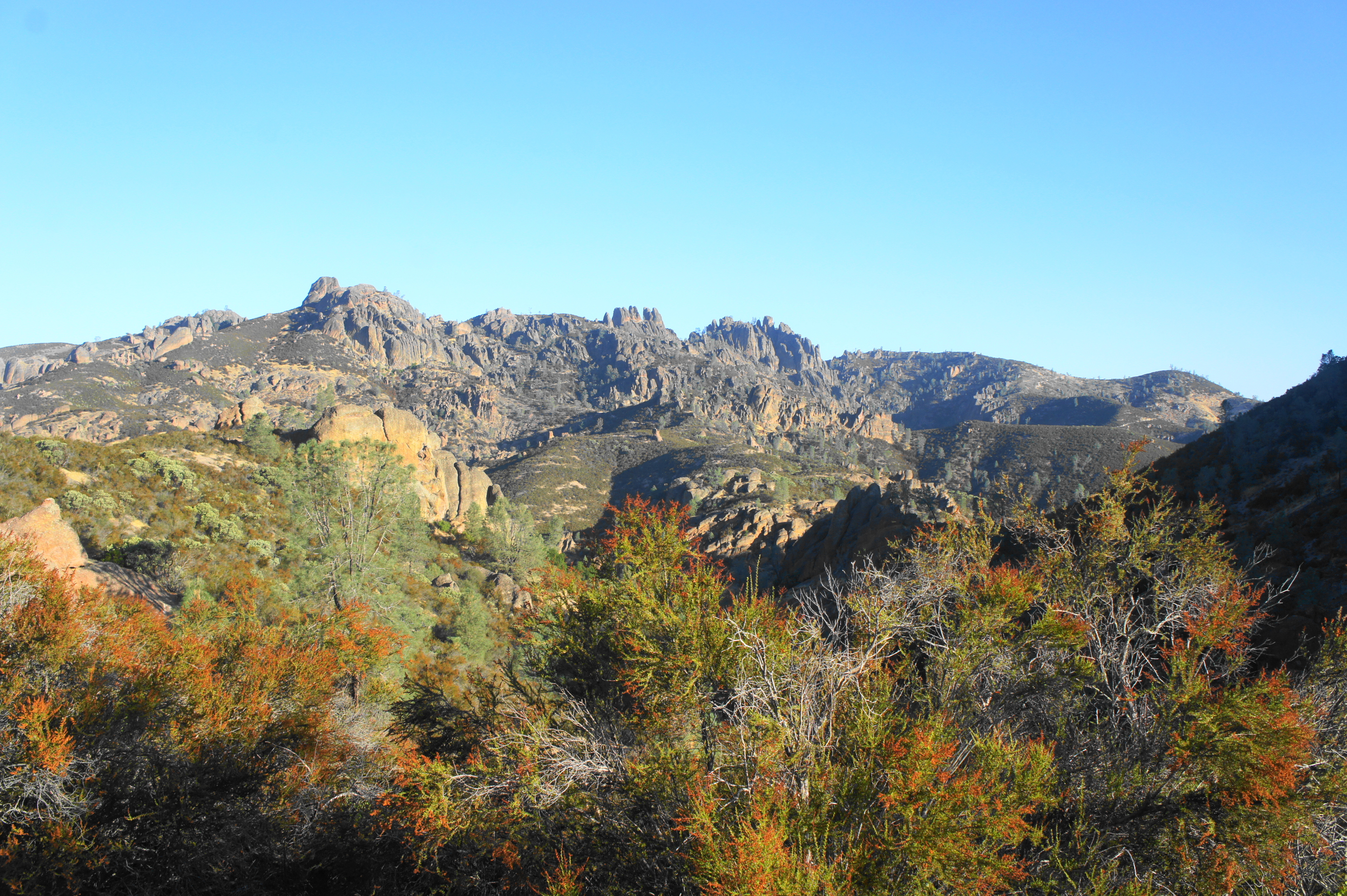The drawback, of course, is the looming reality of a 4-mile hike back the way you came to return to the trailhead. Yet the downhill slope is considerably more pleasant than the earlier ascent, and shifting light offers different perspectives of the pinnacles, peaks, and canyons along the way. Once back at the Bear Gulch Reservoir, there are a few options to return to the Bear Gulch Day Use Area: the first is to return down Bear Gulch Cave, the second is to follow the cave trail part way down and then turn on the Moses Spring Trail, and the third is to follow the scenic Rim Trail along the western slopes before descending the High Peaks Trail back to the start.
