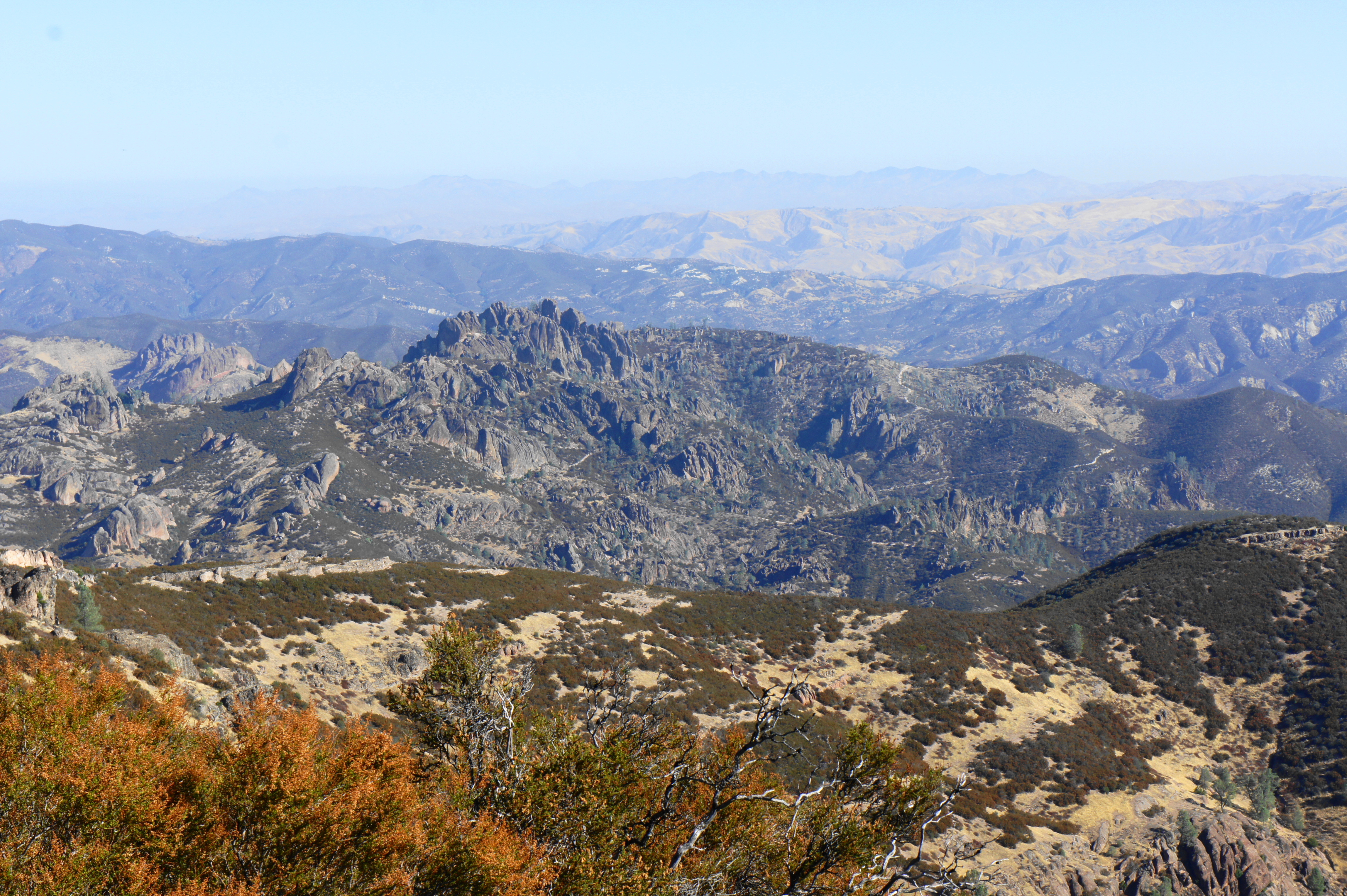 As the trail bends south, take in westward views over Salinas Valley to the Santa Lucia Range beyond. Down in this valley is the town of Soledad, the gateway to the western reaches of Pinnacles National Park.