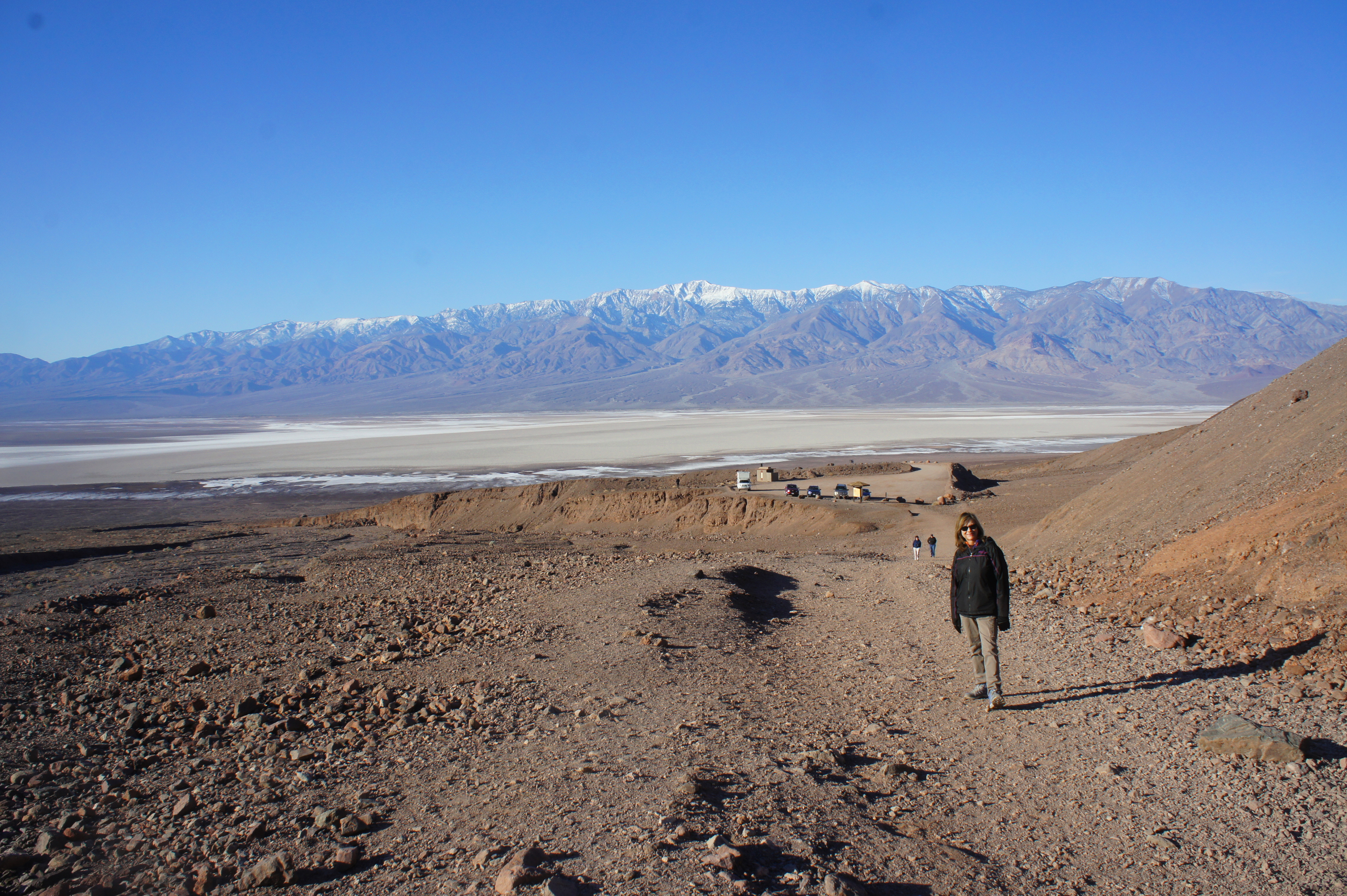 It is possible to continue for another ¼ mile beyond the natural bridge, where passage ends at a dryfall, but most visitors will turn around at the bridge, descending back to the parking area with terrific views across Death Valley and Badwater Basin, the lowest point in North America.