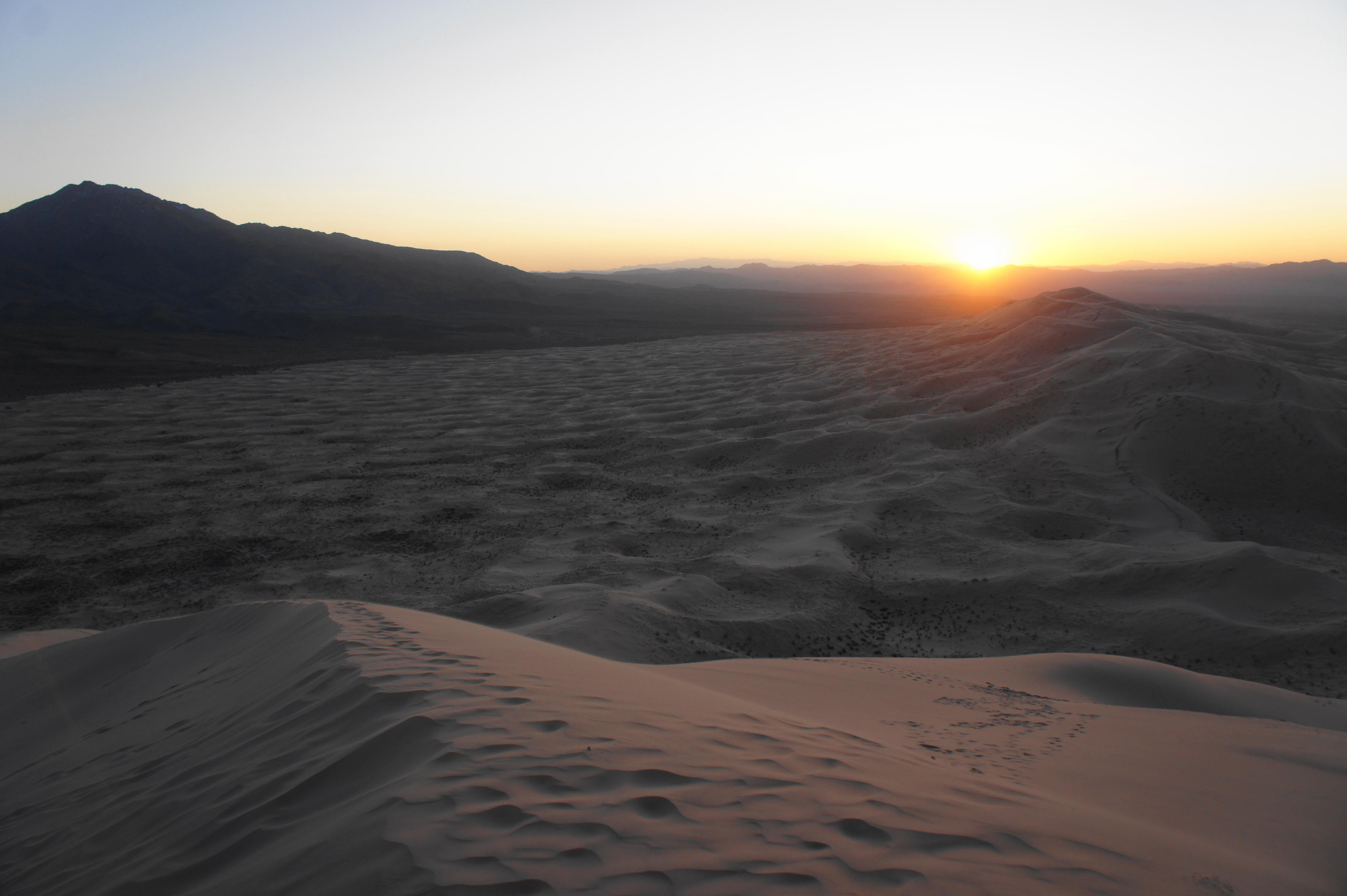 To the north, the dunes of Devil’s Playground extend off into the distance, with the Kelso Mountains and Soda Mountains beyond. To the east, the desert basin comes to an abrupt end as the Providence Mountains rise to nearly 7,000 feet. To the south are the craggy Granite Mountains and Old Dad Mountains. The dunes themselves were a product of these mountain boundaries, which blocked passage of the prevailing winds that carried the sands that now make up Kelso Dunes all the way from the Mojave River, dozens of miles to the west.