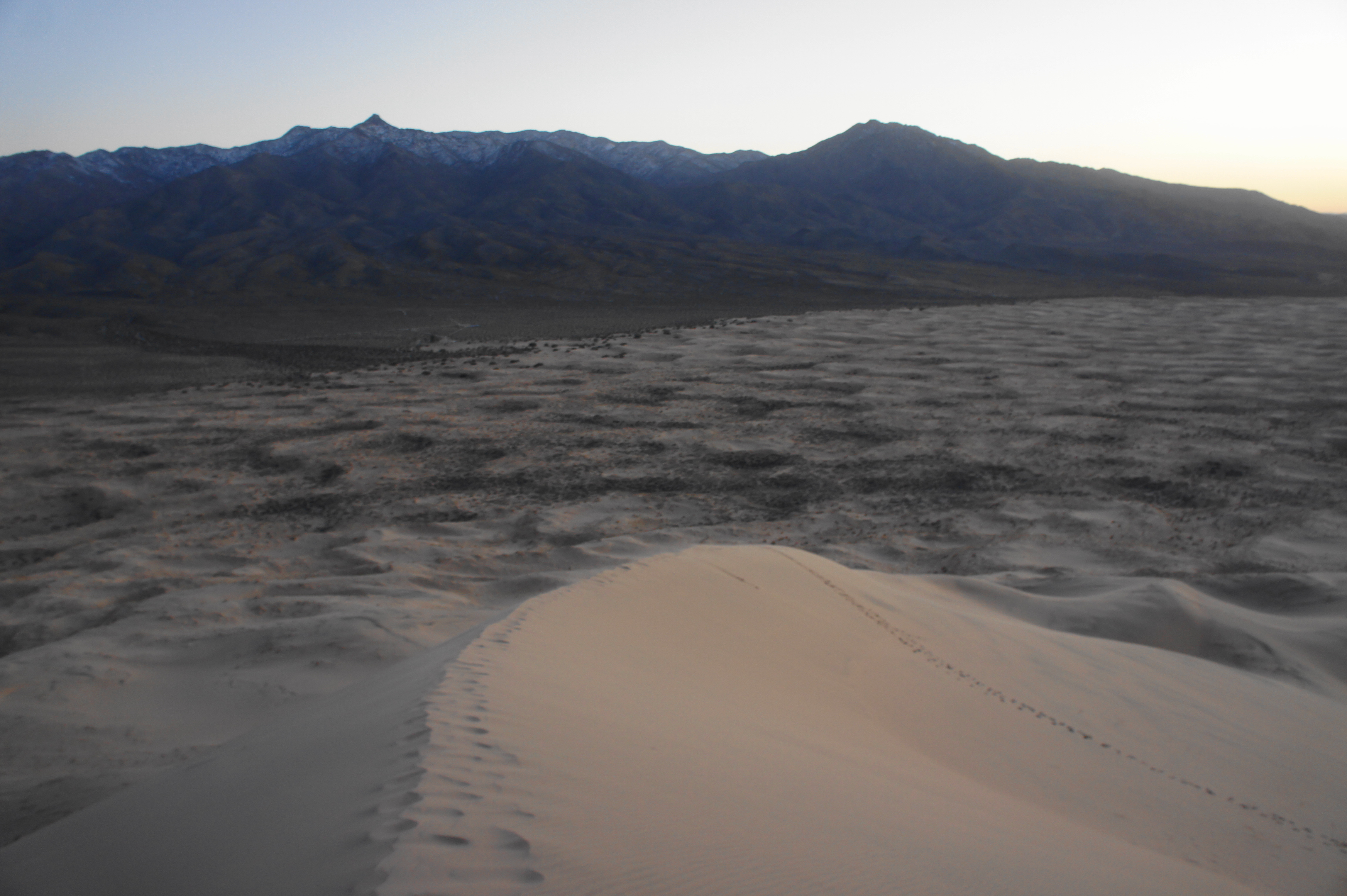 Finally, at about 1.5 miles, the route crests the saddle, revealing views of the broader dune field to the north. Views at sunset can be simply spectacular, as the evening light flashes color on an otherwise greyish-white landscape.