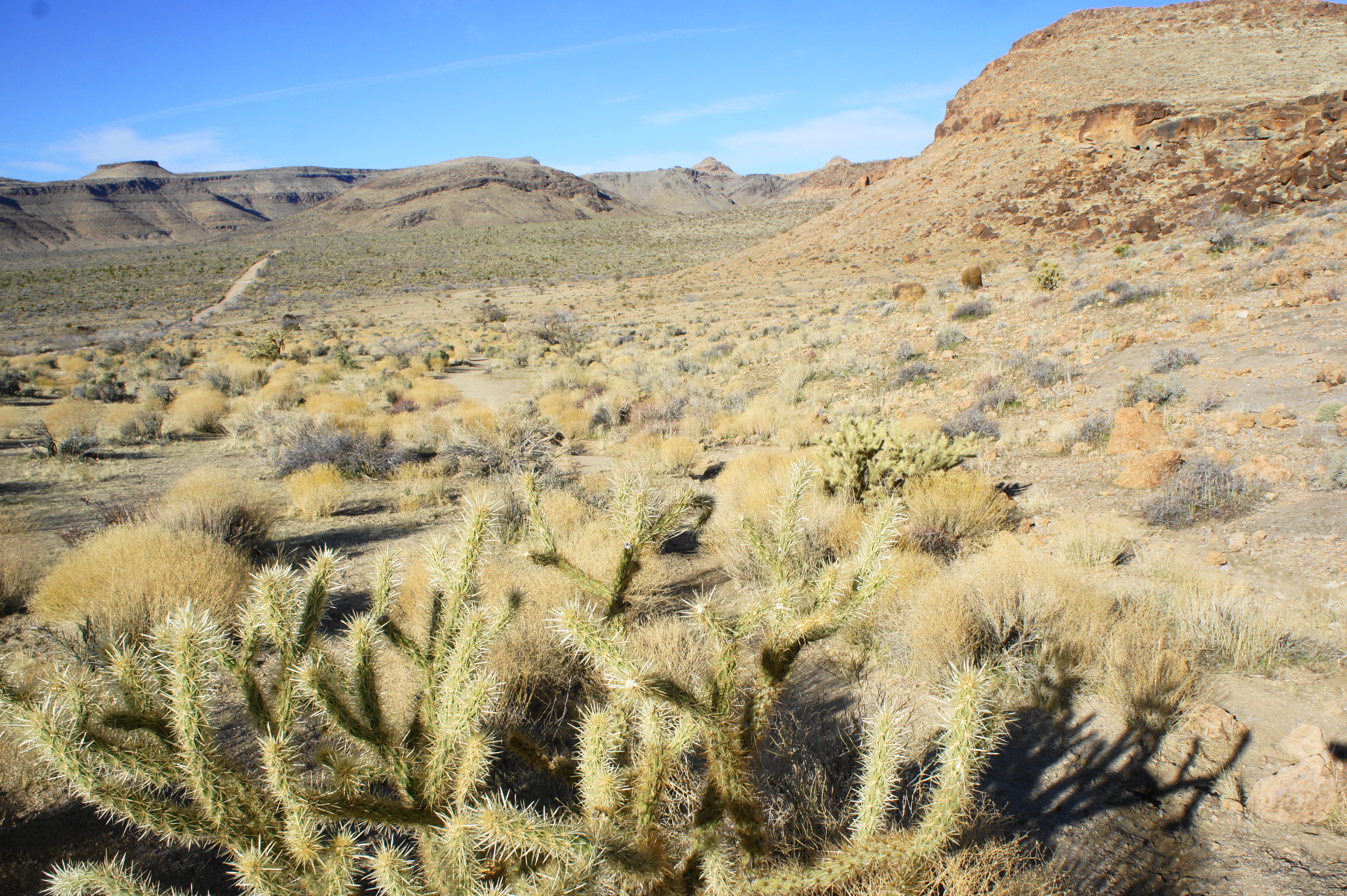 As the trail hugs the scrubby hillside on the right, it curves southward, and then west, to reveal another wide basin, the mouth of Wild Horse Canyon. The Wild Horse Canyon Road provides access to a handful of private residences in this remote and desolate environment.