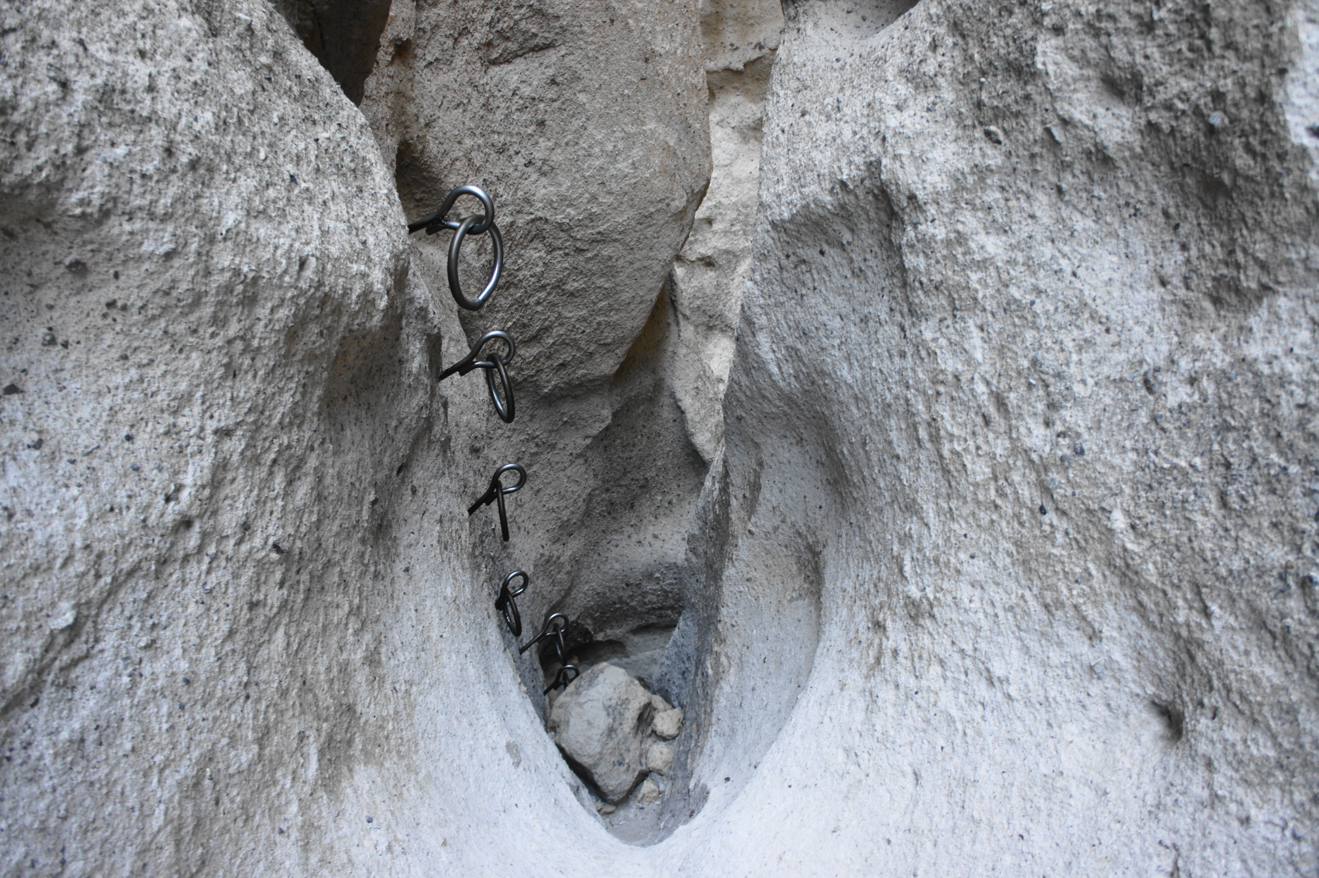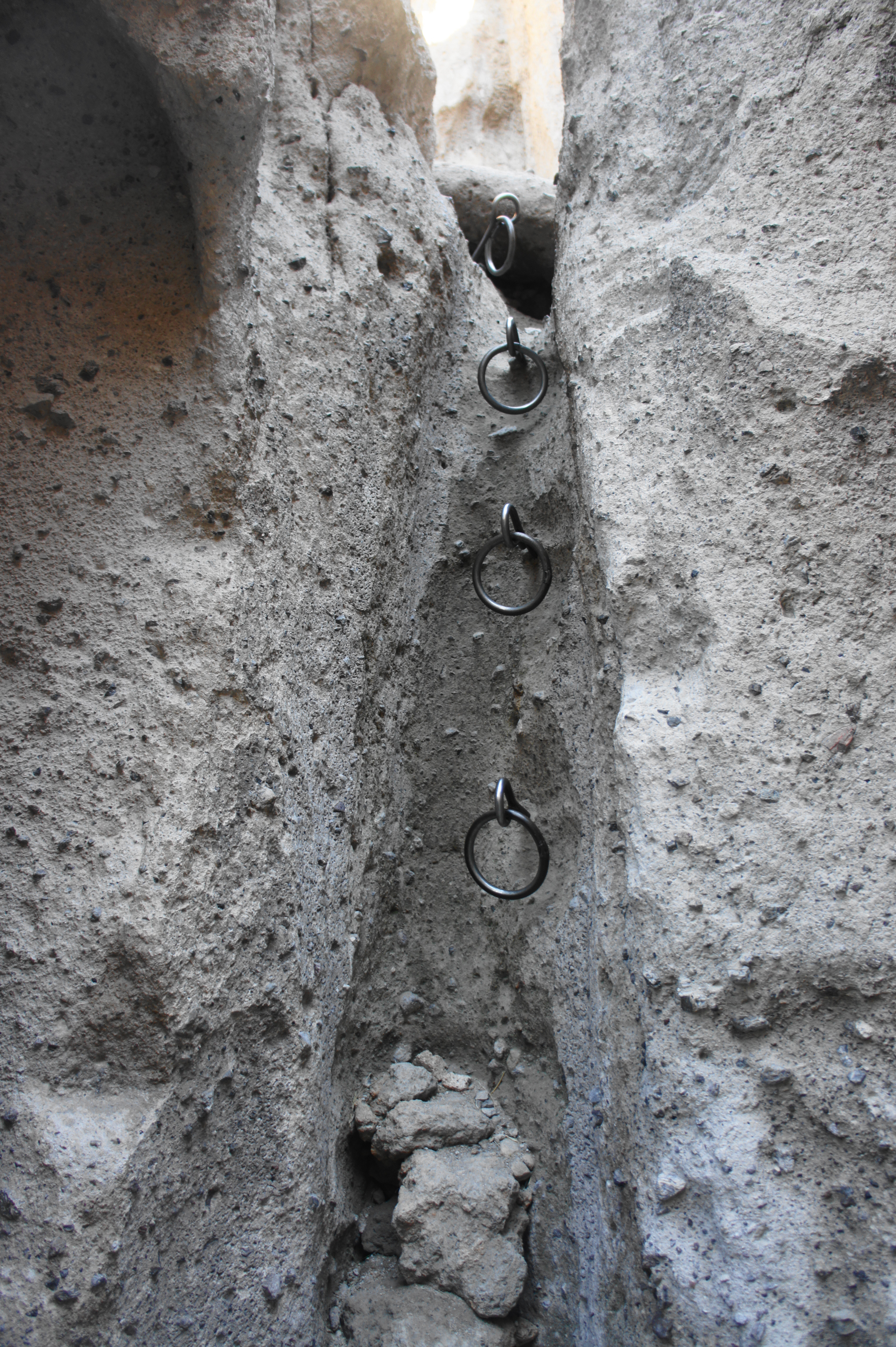 A half dozen rings, bolted into the right wall, assist with the ascent through the crevice: hikers may not need to use all of the iron rings, but the last three are particularly helpful to get up and over the smooth dryfall.
