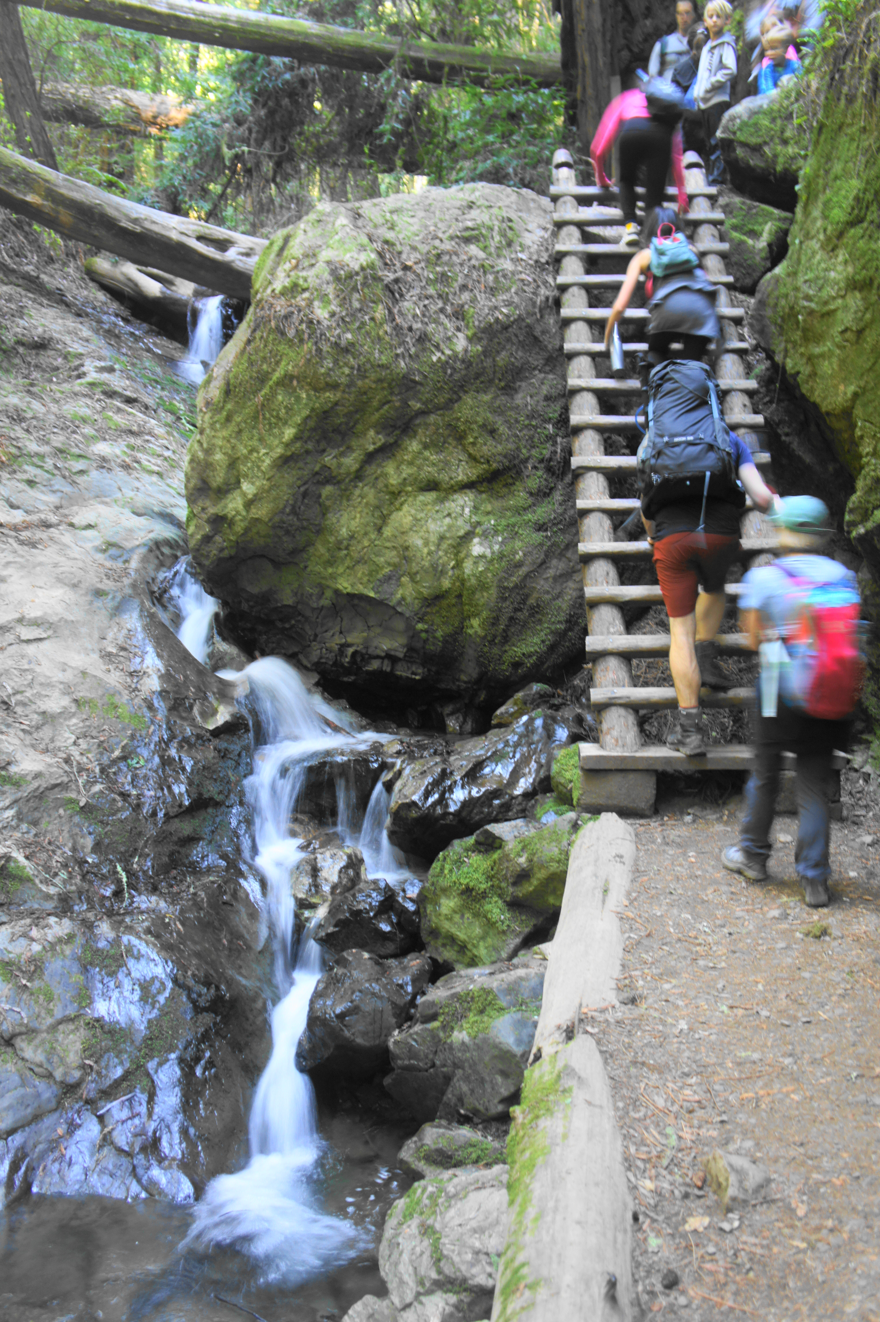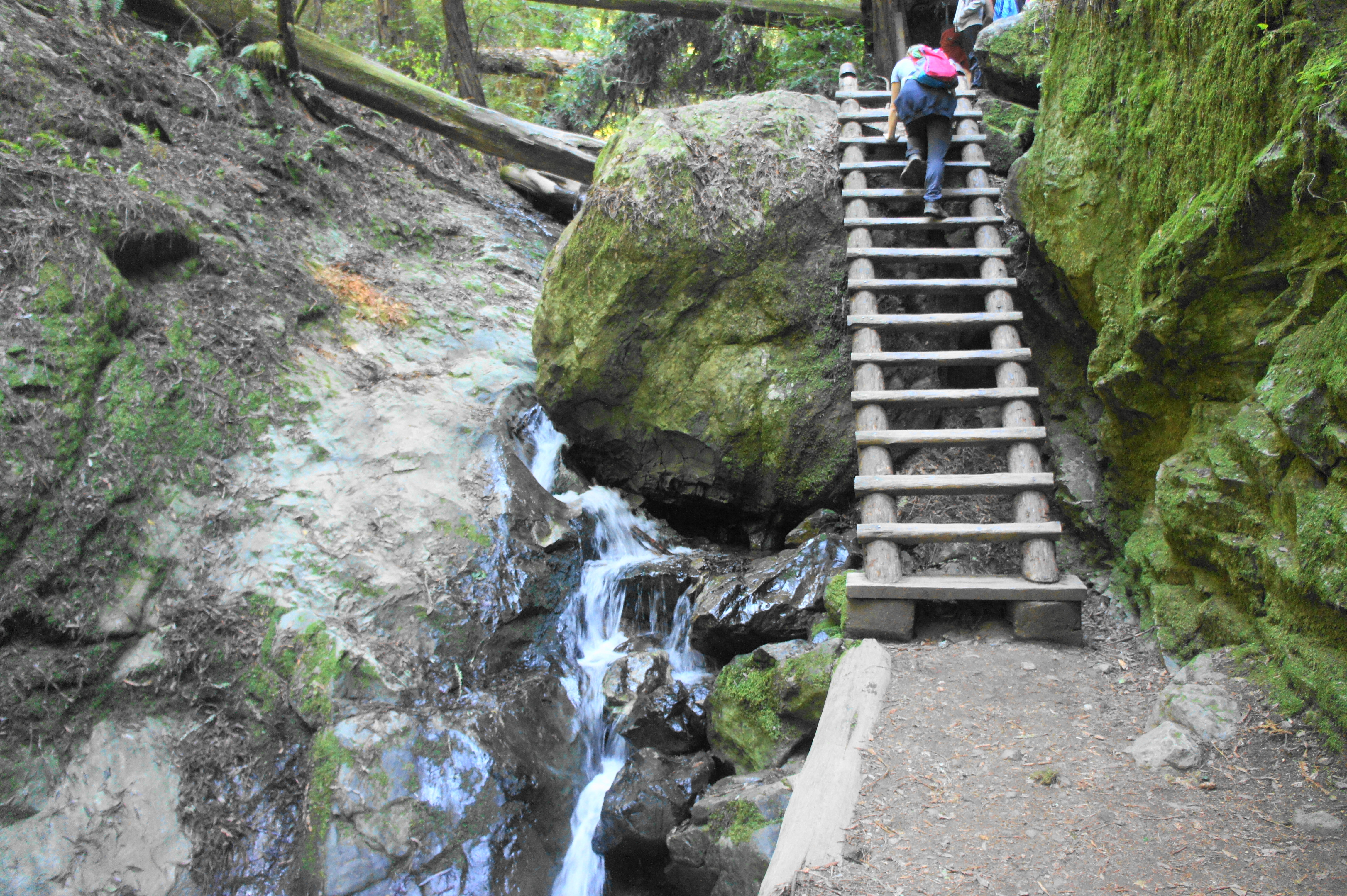 Here the trail briefly levels off, then traverses two more bridges, leaving one back on the right side. After climbing again, the Steep Ravine Trail reaches the iconic ladder: a 15-rung wooden structure that abuts one of the most beautiful cascades on the Marin Peninsula. If you’re lucky to have the place to yourself, this is one of the natural wonders of the Bay Area. Well…at least the falls, but the man-made ladder is nice to have in order to surmount the massive greywacke boulder wedged in the stream.