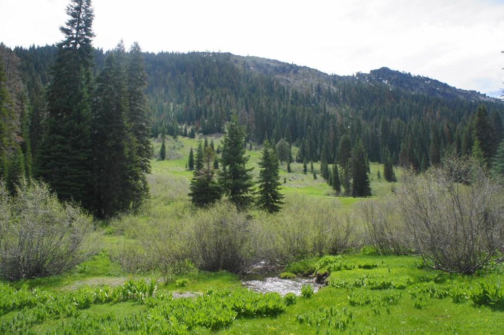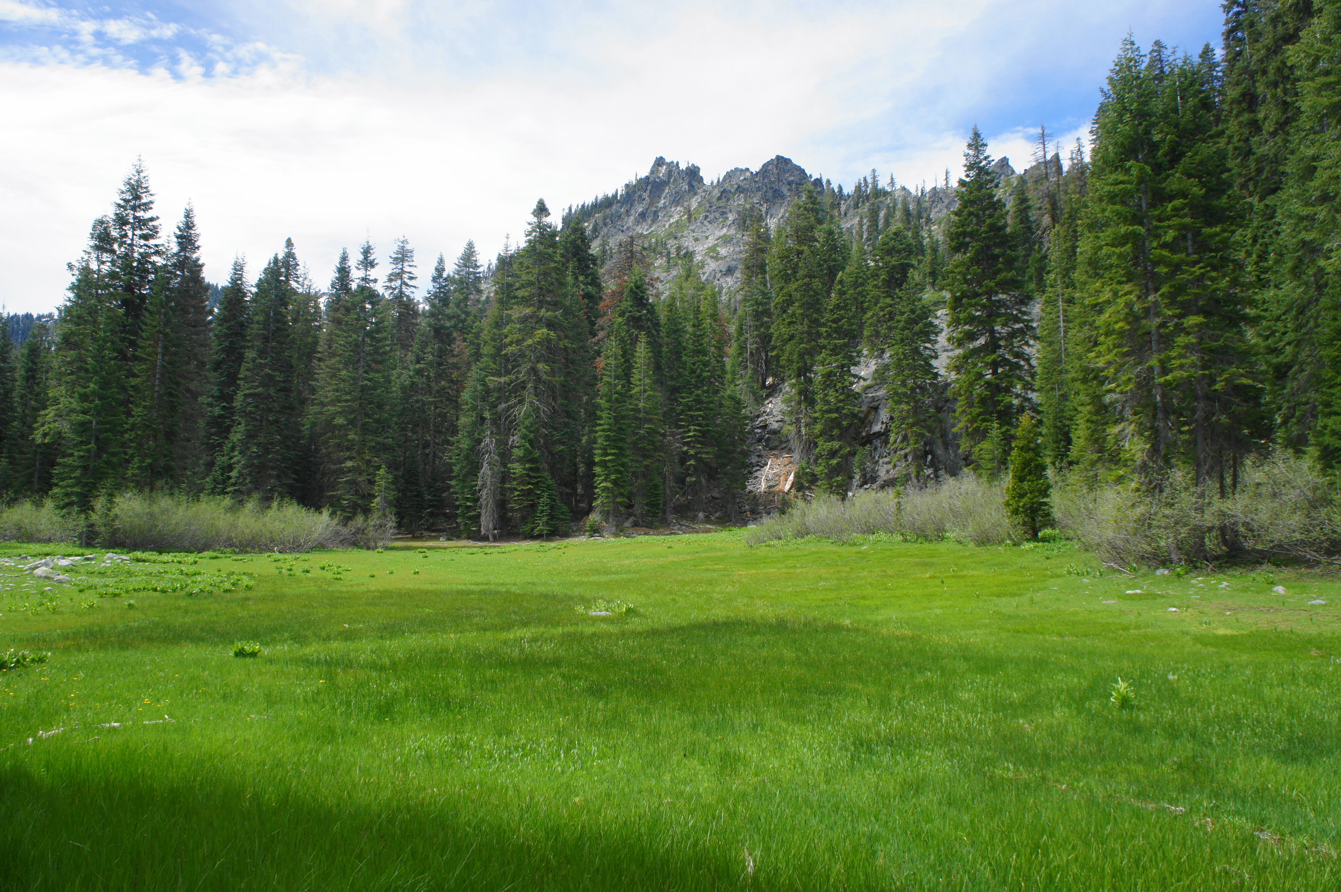 After ¾ mile under a dense canopy of conifers, the trail abruptly enters an open and beautiful meadow, marred only by the boggy mud after recent rains or snowmelt. After passing a marshy area on the right, hikers will catch views of the craggy mountaintops to the west and east, the highest being an unnamed peak ahead that reaches 7,794 feet.