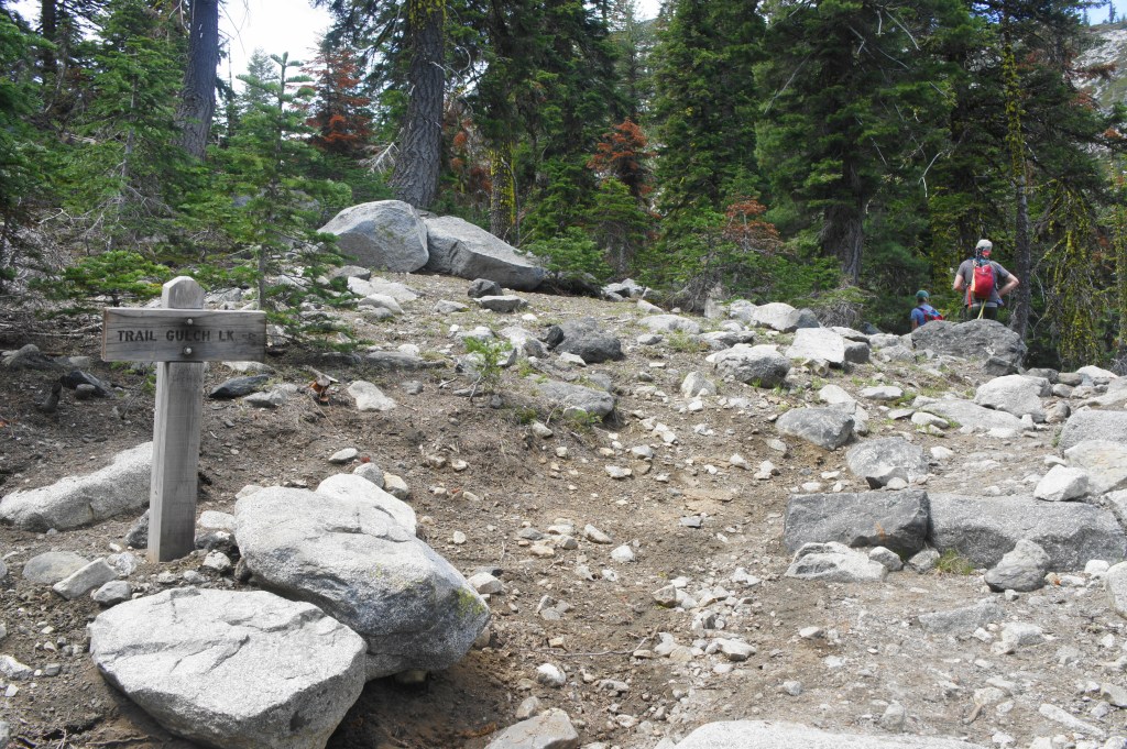 To reach the trailhead in Klamath National Forest, follow Route 93 (Cecilville Road) southwest from Callahan, California, cresting Carter Meadows Summit at about mile 12. (Note: A number of excellent hikes begin from the trailhead at the summit, including a strenuous jaunt to South Fork Lakes.) About a half-mile beyond the summit, take the next left, following a wide gravel track toward Carter Meadows Campground. Instead of pulling into the campground, however, stay left on Forest Road 39N08, which wraps around Carter Meadows to the northern flank of the Trinity Alps. (Note: Technically this area is situated at the confluence of three ranges—the Trinity Alps, Scott Mountains, and Salmon Mountains.) Follow the dusty road for 1.5 miles to the Trail Gulch Trailhead, on the left. There is a large information board and orientation map at the trailhead.