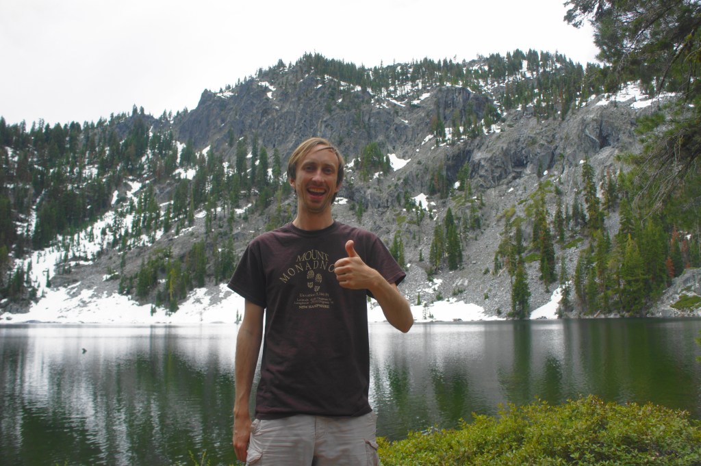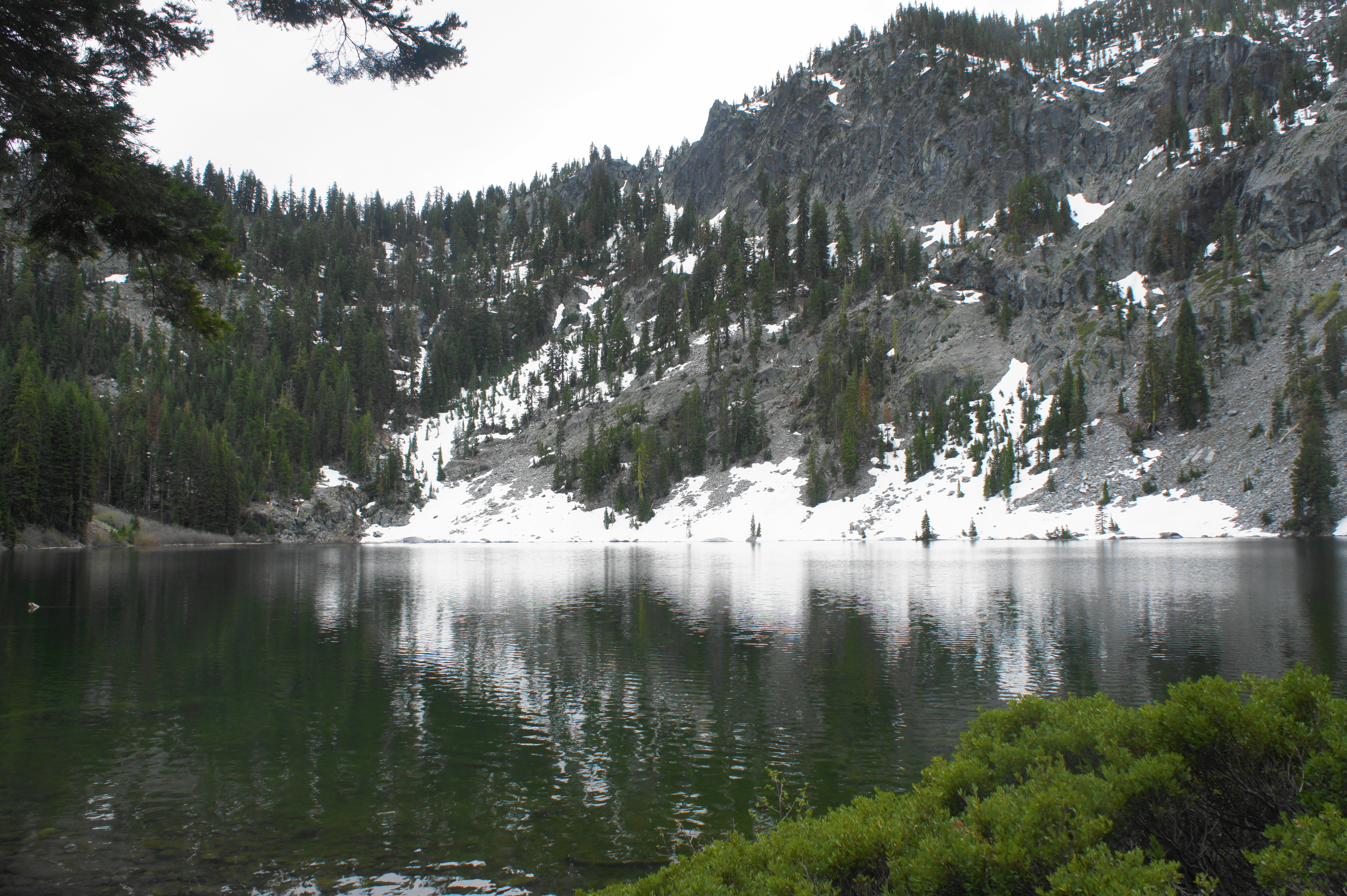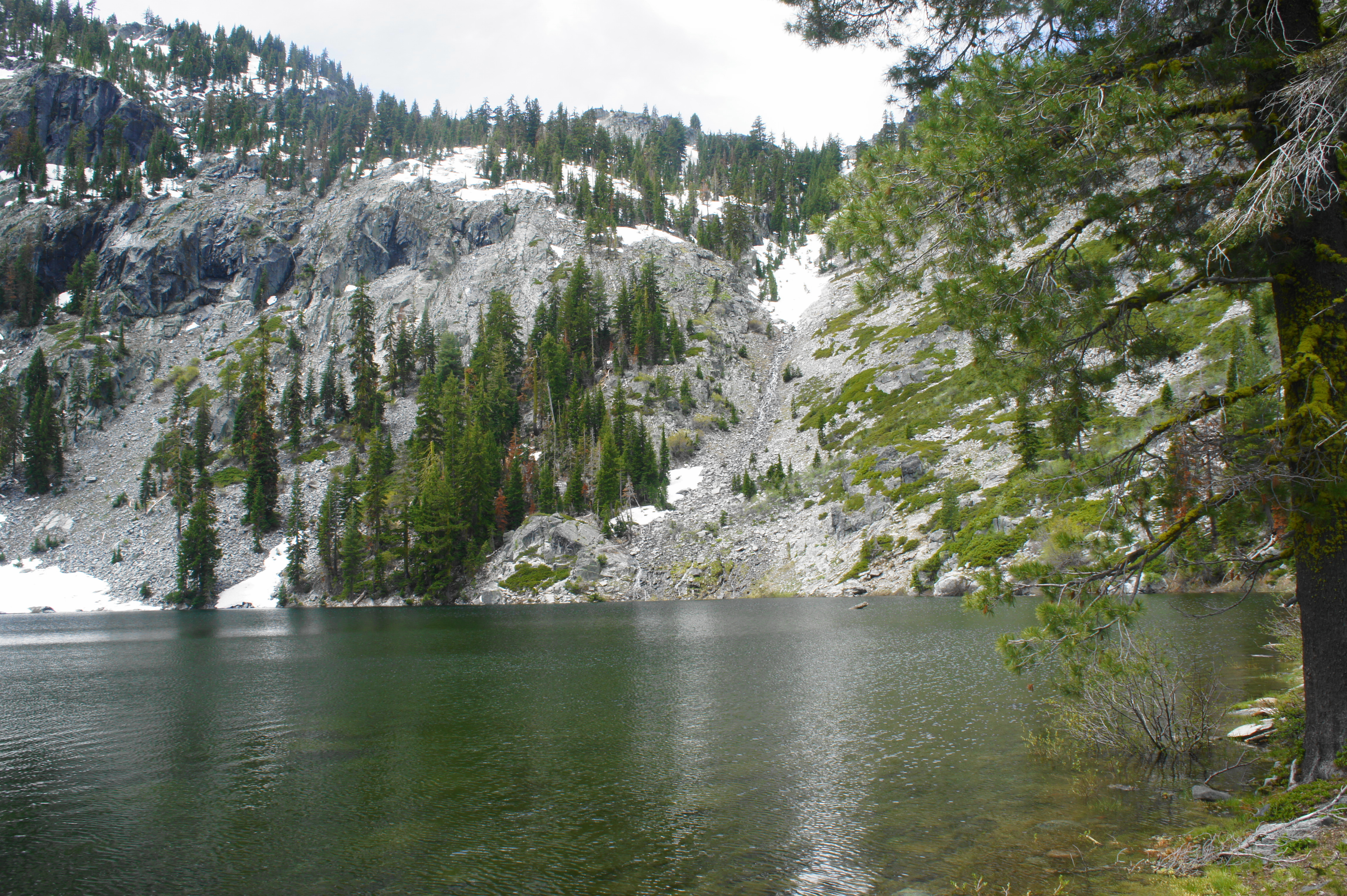 The splendid, 14-acre lake is nestled in a glacial cirque at the base of near-vertical granite cliffs. Late into spring and early summer, snowbanks dot the southern flanks of the lake. On the near side, there are a couple nice potential campsites, while a smattering of logs and rocks offer a place to dip your feet in the chilly waters.