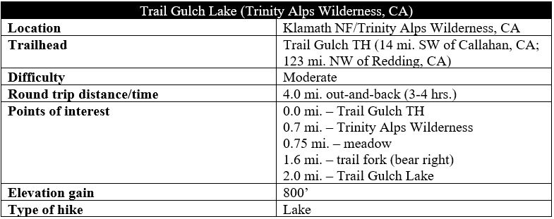 Nestled at the base of stunning granite cliffs, Trail Gulch Lake is a jewel of northern California’s Trinity Alps yet remains rather sparsely visited. This is all the more surprising since the short and relatively easy hike to the serene lake is easily accessible from the Carter Meadows area, situated just off paved Route 93 between Cecilville and Callahan. Some will climb to Trail Gulch Lake as part of a more difficult, nine-mile loop that combines Trail Gulch with its westerly cousin Long Gulch. But for those seeking a more modest walk, the out-and-back to Trail Gulch Lake is a worthy trip on its own. (Note: On many maps—including Google—Long Gulch Lake and Trail Gulch Lake are incorrectly switched; Trail Gulch is the easternmost of the two.)