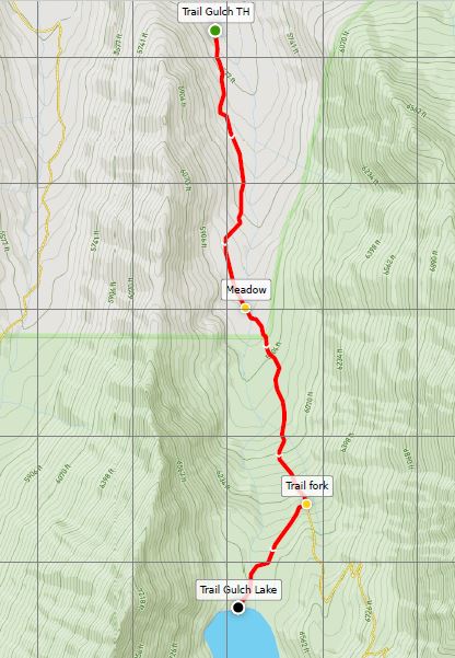 At 1.8 miles, the trail crosses Trail Gulch Creek again—this time the stream is narrower and thus easier to avoid wet feet. From here it is a short and easy trek to the northern banks of Trail Gulch Lake.