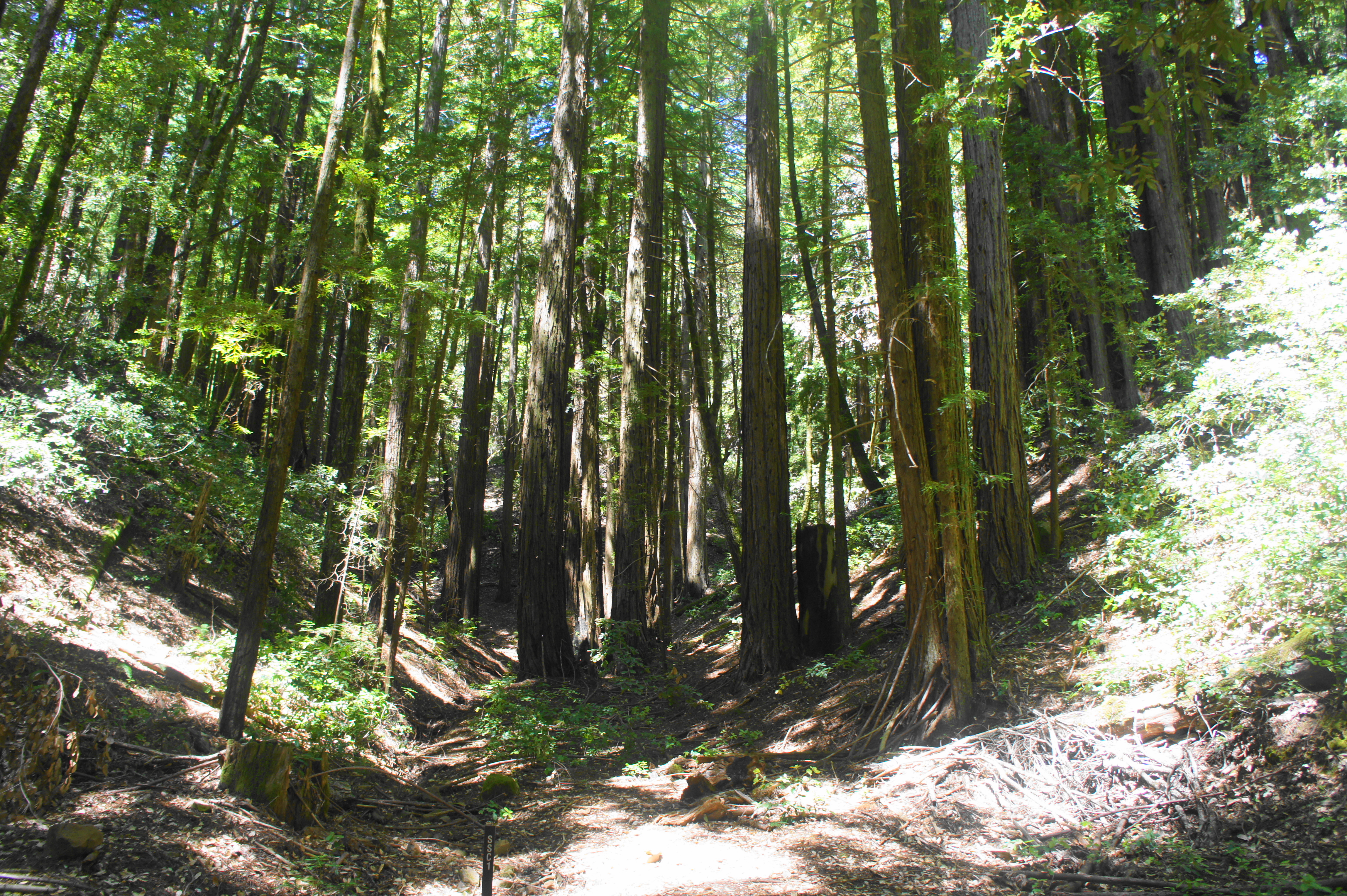While this is a popular trailhead for hikes into Purisima Creek Redwoods to the west, hikers headed for Huddart County Park and Phleger Estate should cross Skyline Boulevard and then bear south for 50 yards to catch a fire road that enters Huddart on the left. Pass through the gate and immediately come upon the first of many, many junctions—(almost) all impeccably signed. This first junction is a four-way fork. Since you want to make your northward toward Phleger Estate, bear left…but which left? Both the Skyline Trail and Summit Springs Trail head north from the junction. Taking either is fine for now, as they meet up again at a second junction after about 1/10 mile. This time, bear right on Summit Springs Trail for sure, as it provides access down into the heart of Huddart Park. (Note: Hikers will return, hours later, on the Skyline Trail.)