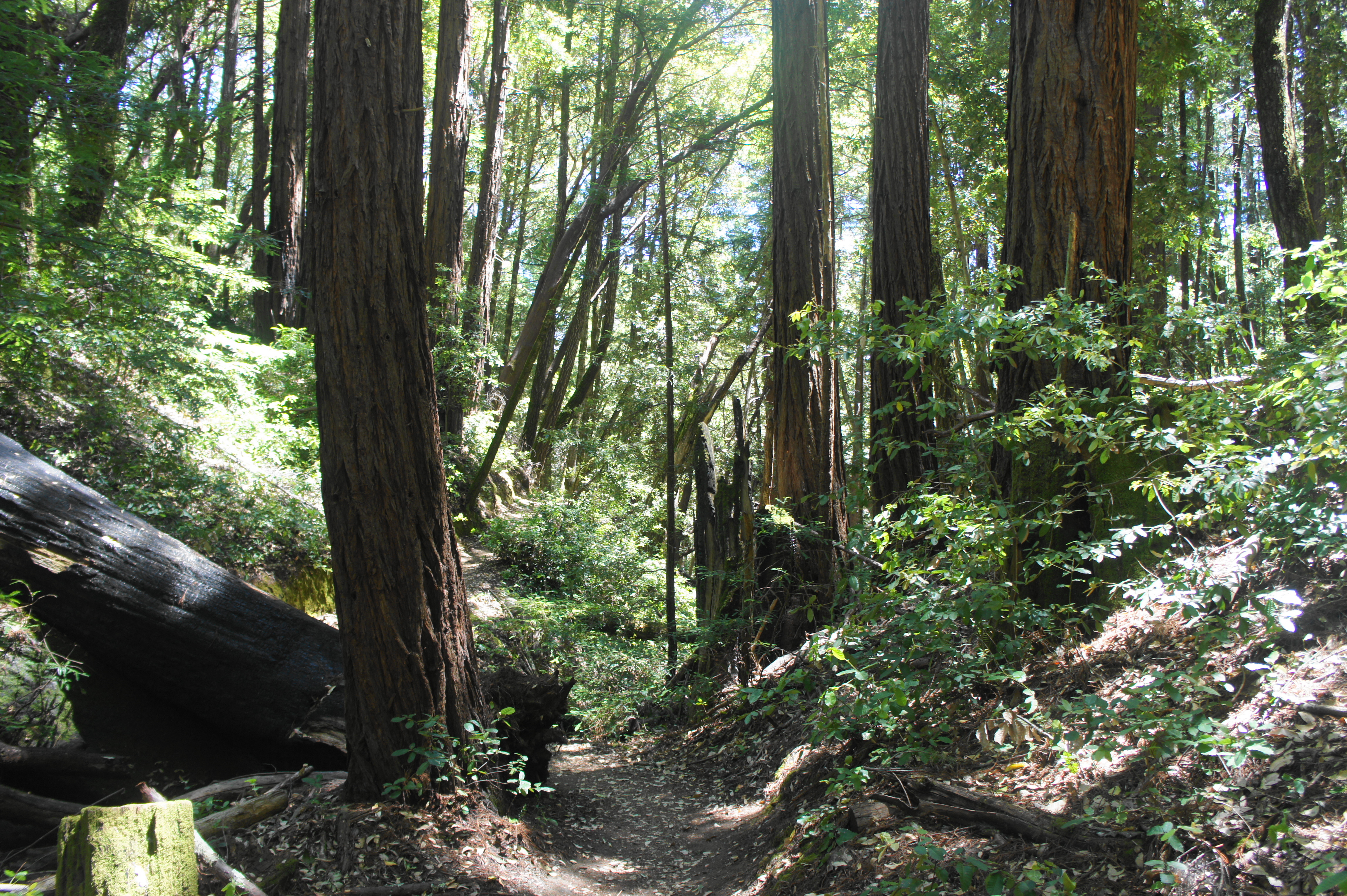 Thus begins the main loop portion: hikers should proceed counterclockwise, dropping first down through Huddart Park, then saving the more interesting ascent through Phleger Estate for the second half. The Summit Springs Trail is a wide, gradually descending track that immediately passes several batches of towering redwoods. These trees are a lesson in resilience: while the largest members of the old growth forests were heavily logged starting in the latter half of the 19th century, these second-growth redwoods have survived as a result of preservation efforts: some were small and forgotten during the logging period; others have sprouted and grown in the past several decades. Redwoods are also famously resistant to wildfires, boasting chemical tannins and thick barks that retard the fire’s progress.