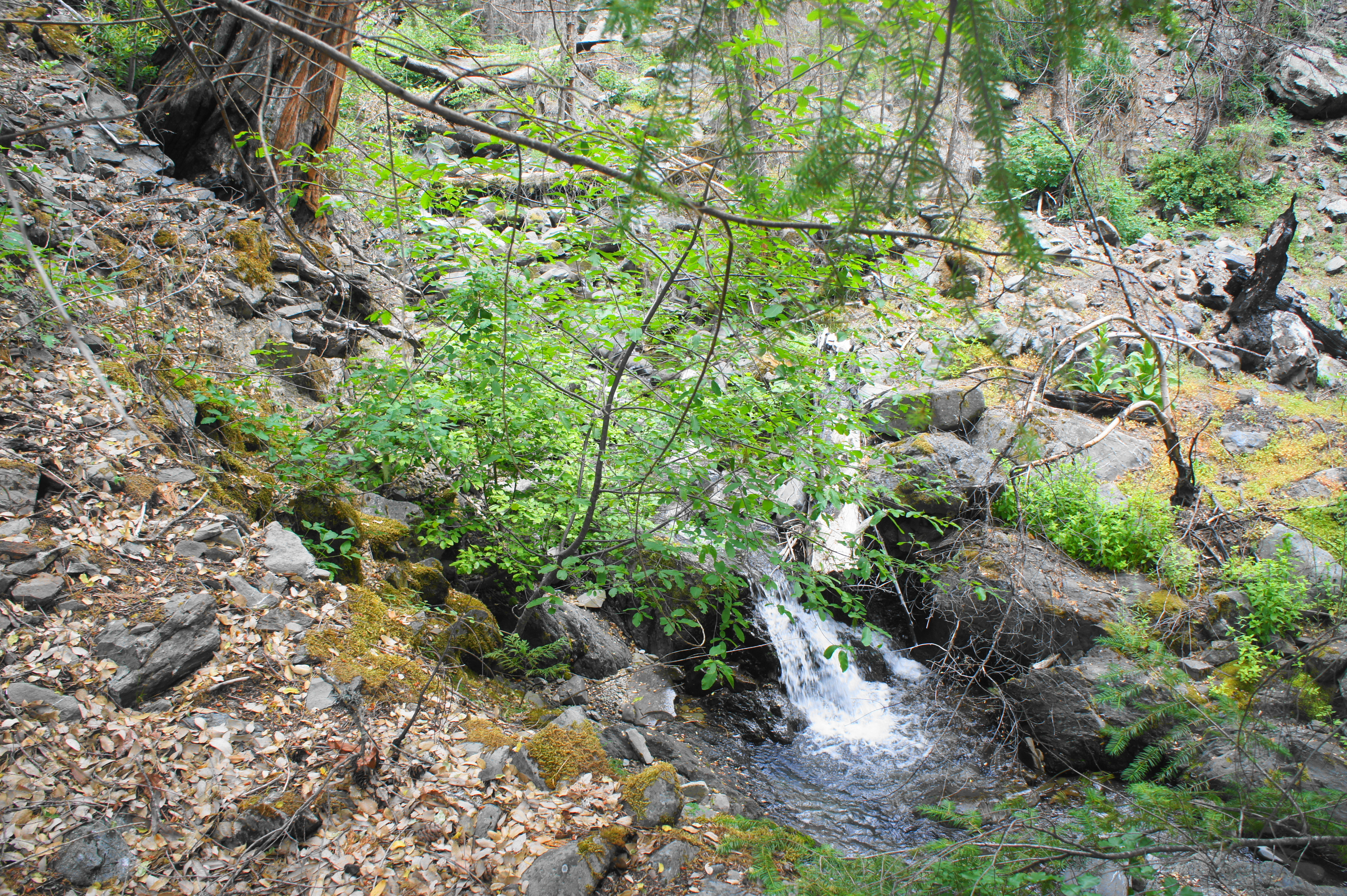 At the trailhead, be sure to sign at the trail register, and pack plenty of water and supplies for the hike, which enters remote wilderness quite quickly. The hike begins with relatively little fanfare, gradually descending an old logging track, contouring westward. The valley below was carved by the South Fork of Stony Creek, a perennial waterway that you will encounter soon. This area appears to have been partly spared by the recent fires—a variety of conifers grow tall and deep. About 250 yards from the start, follow a short single-track around a stony ravine, then continue on the old road again. Technically there is a junction at about 0.35 miles, but the trail coming in from the right is largely indiscernible.