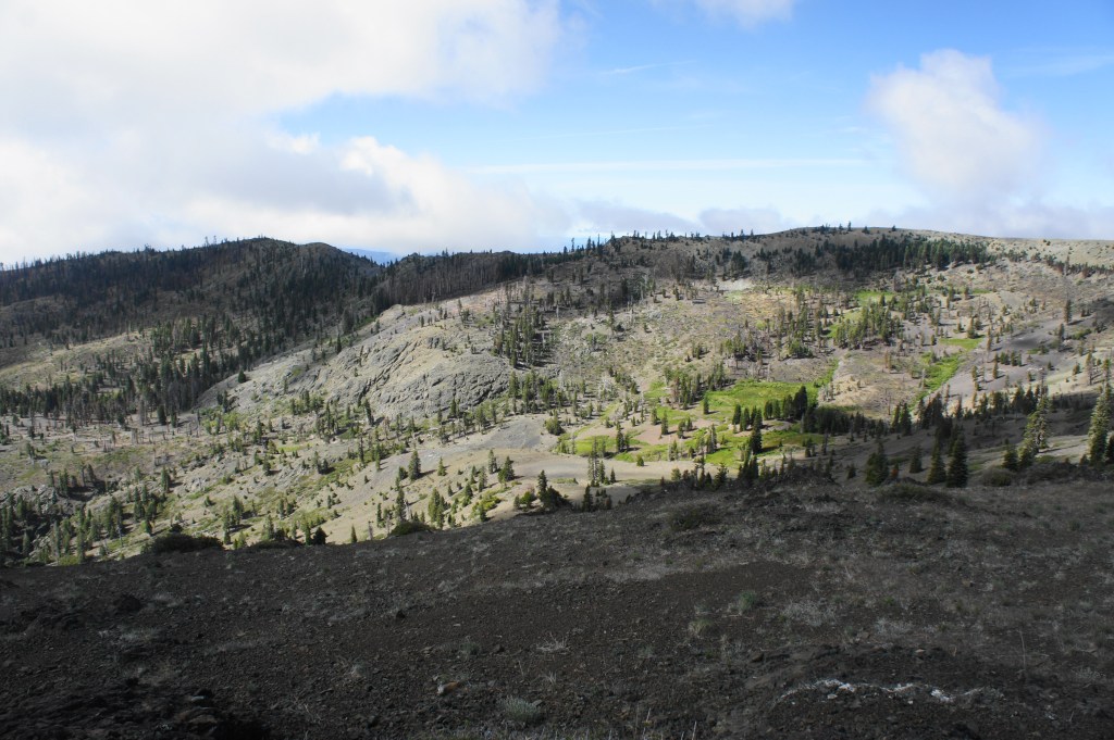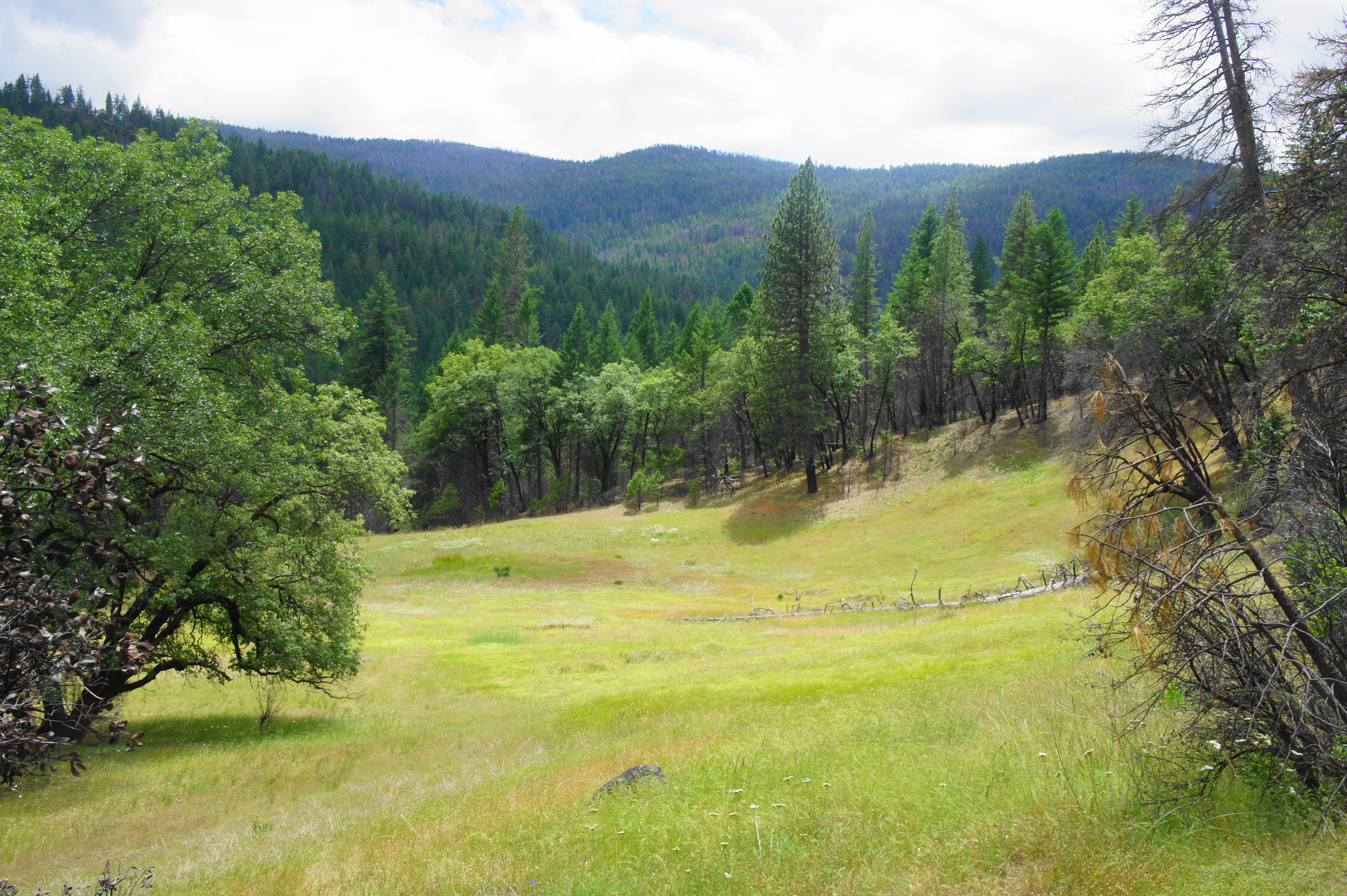 As the trail curves north, the incline steepens to a crushing 25 percent—which does not sound like a lot until one experiences it in person. The woods beyond were hit hard by the Ranch Fire, as attested by the charred remains of small manzanitas along the trail. Some pines and manzanitas, however, have survived, offering continued shade on a hot, sunny day. After briefly levelling off at 1.25 miles, the trail comes into view of its namesake Deafy Glade, a beautiful grassy meadow on the right, then climbs again to a point where it crosses the open clearing. These pretty meadows are one of the touchstones of the hike; hikers will encounter several nice glades in the Snow Mountain area. (Note: There a couple of nice, previously-used campsites at Deafy Glade; backpackers seeking to complete the entire 18-mile loop, however, should continue onward.)
