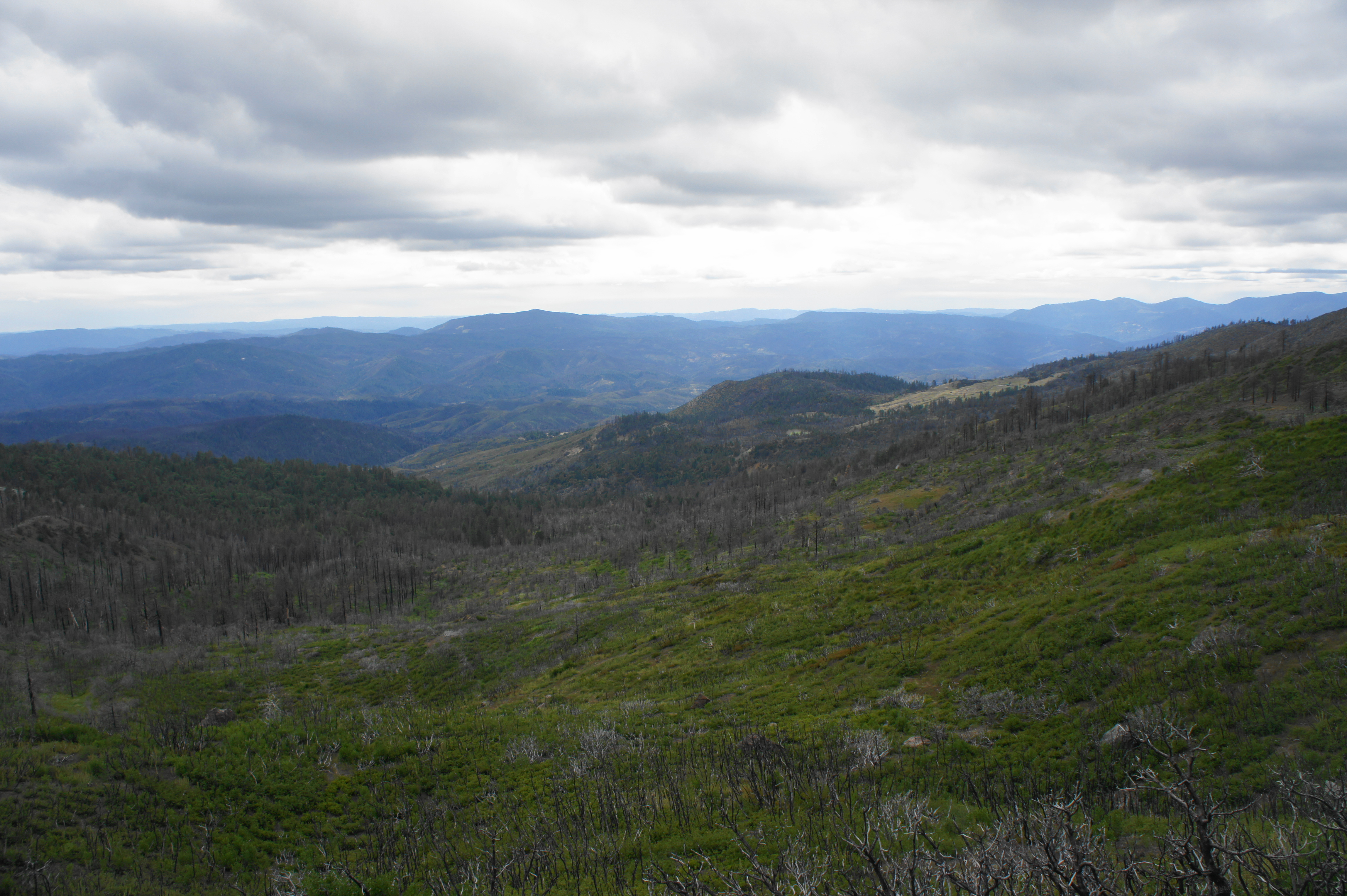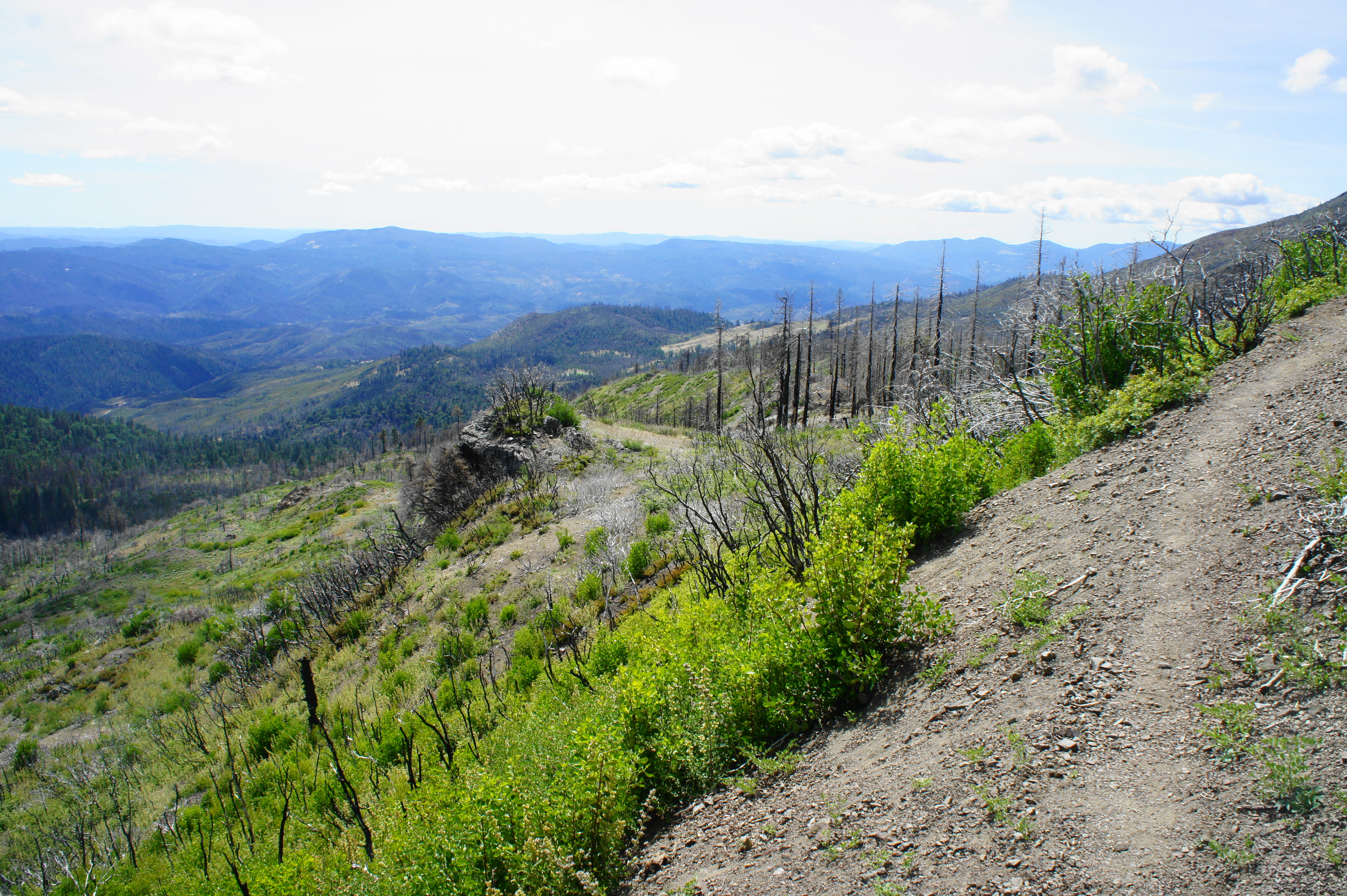 The woods beyond were heavily affected by the recent fires. But the sound of flowing water and lush undergrowth suggests the area is experiencing a slow regrowth. At 4.8 miles, the route passes Upper Bear Creek Springs on the right, continuing to skirt the Snow Mountain hillside. As the trail bears south, the bottom drops out of the Bear Creek drainage, creating a steep canyon sporting tall pines, many of which appeared to survive the fires. At 5.2 miles, the trail crosses a broader wash, with Lower Bear Creek Springs (the main source of Bear Creek) downstream to the right.