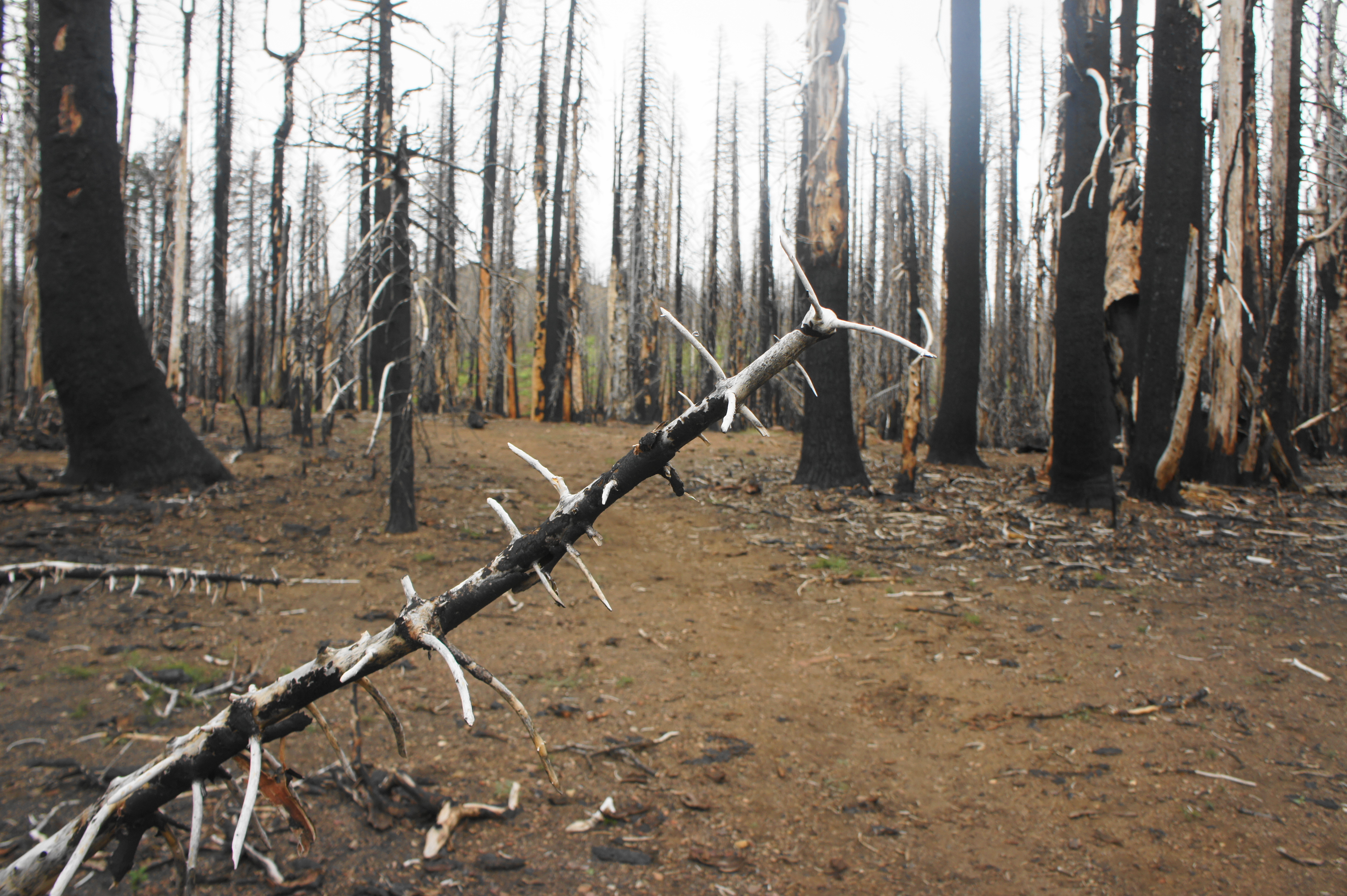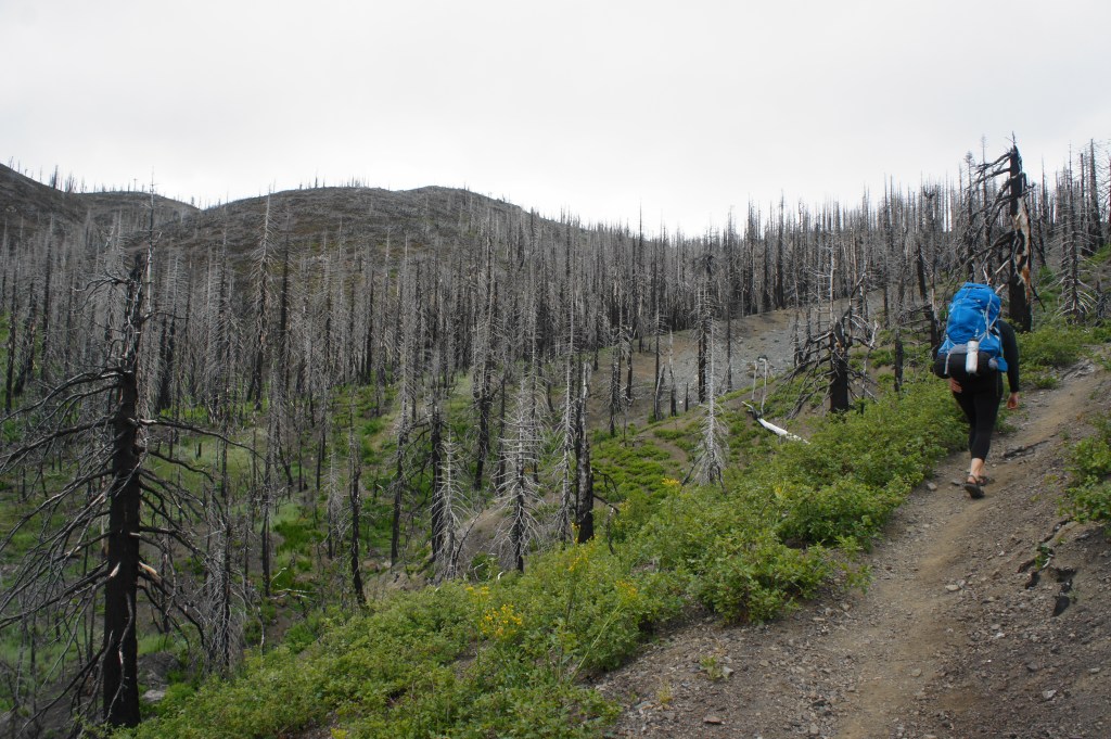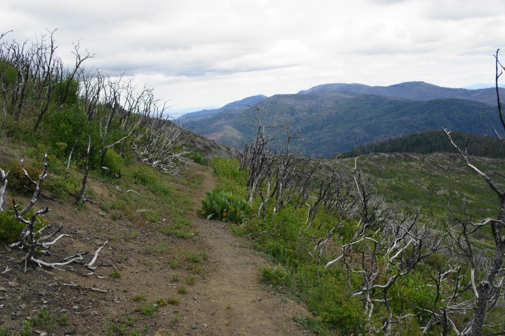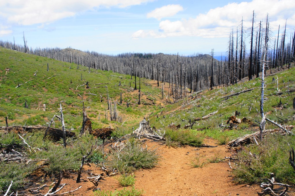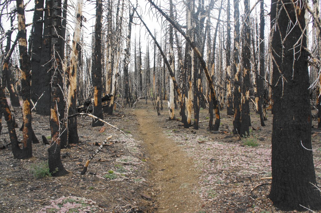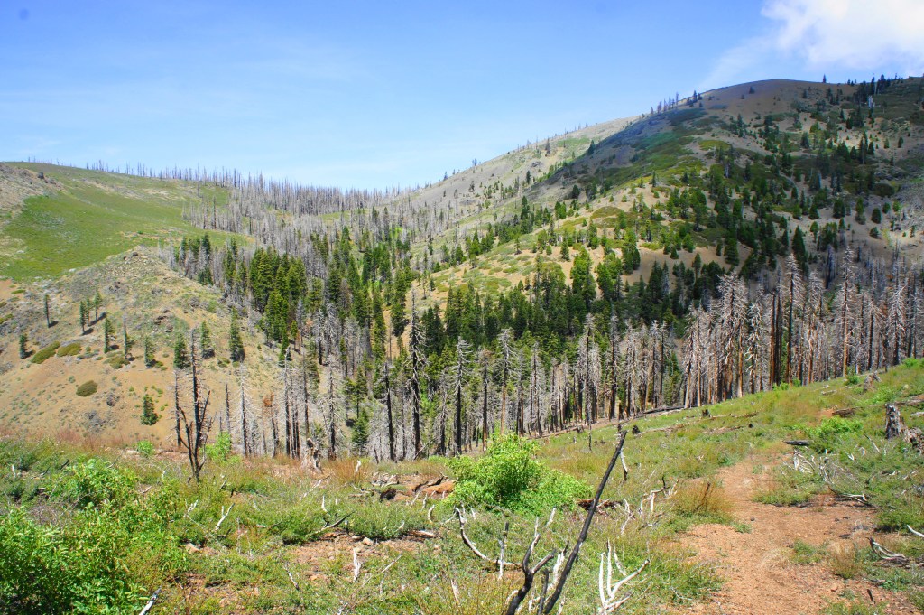 By now one has already spotted the onward route – a sudden and sharp ascent out of the shady drainage to a high pass. The ascent begins as a series of switchbacks, emerging out of the trees after 2/10 mile. While the views from the saddle at 5.7 miles are terrific, the scenery around is haunting: what once was a partly wooded slope has been reduced to ashes; scarcely a stump rises more than eight feet above the ground.