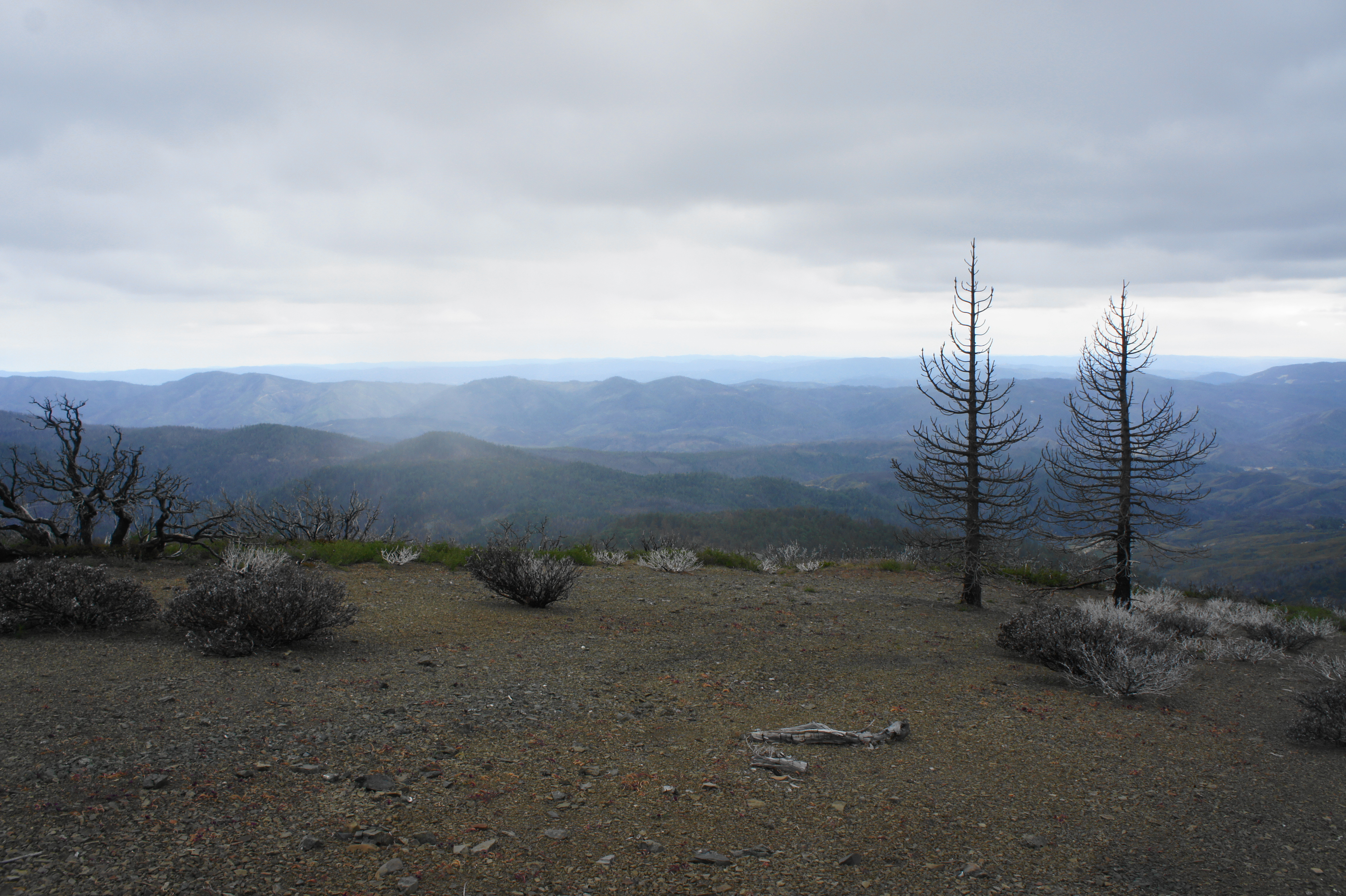 By now the climb to Cedar Camp is more than two-thirds finished, but the best section is just ahead. Ditching the woods below, the onward Summit Springs Trail stays high and sports excellent views westward toward the Pacific Ocean. The behemoth of Snow Mountain extends westward, eventually giving way to Potato Hill (4,405’), with Rice Valley beyond. At the junction, bear right, following the obvious track as it follows the spine of the ridge, then bears left along a steep hillside dotted with scrub oak and brushy manzanitas. While there is significant undergrowth, virtually nothing more than 8 feet tall has survived the latest fires.