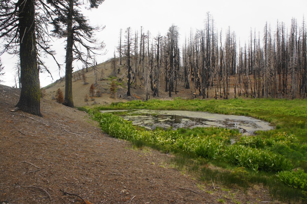 From here it is a short northward tread to Cedar Camp, an inviting oasis of green amid the hellish landscape. Off to the left is Cedar Pond, a mucky pool that is nonetheless surrounded by a ring of charming corn lilies. Just north of the pond is a popular campsite—if it’s available, take it. (Note: While Cedar Pond is not a great water source, there is a much nicer creek flowing downstream to the west.)