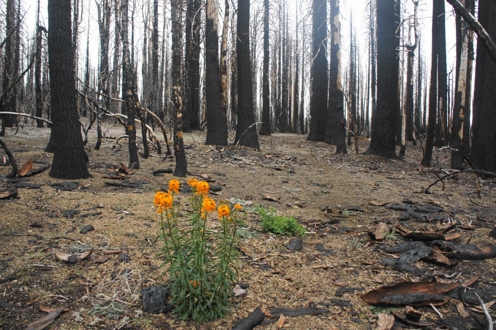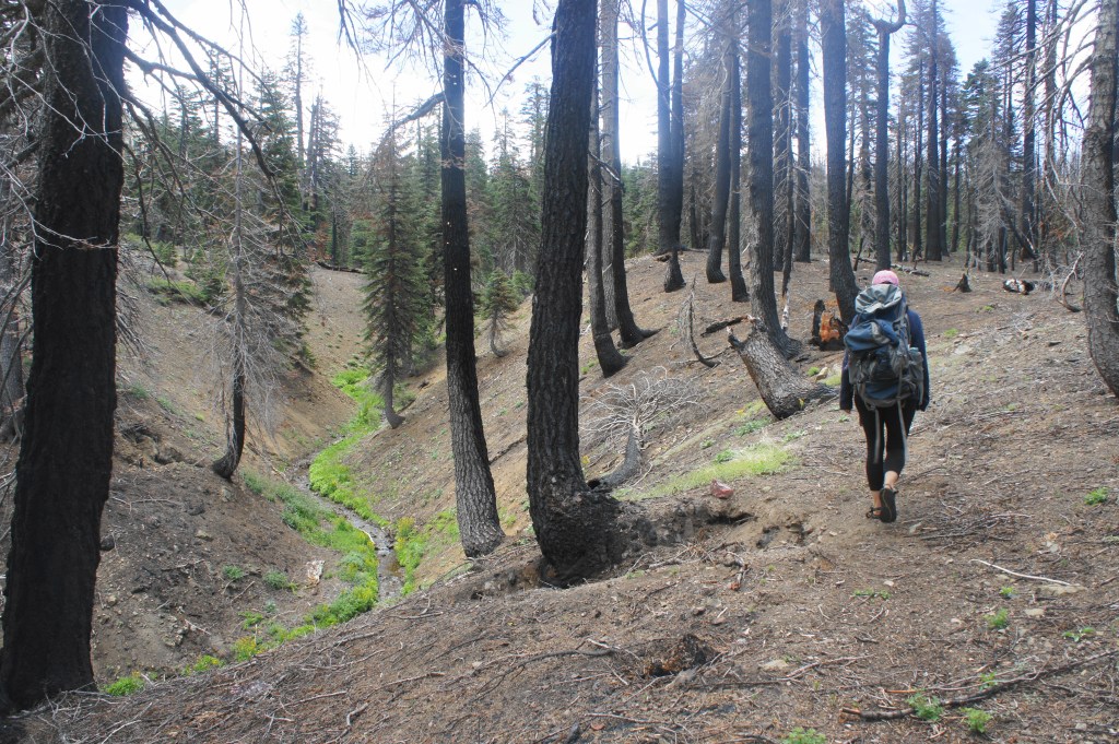 At 4.6 mile, the trail passes a rock outcrop and an alluring (though likely windswept) campsite on the left. Sunset from this spot is likely to be excellent. At 4.75 miles, the path rounds a rightward bend and enters a nameless and ghostly ravine. Despite previously passing through burned areas, this is the spookiest thus far: an entire sea of pines, tucked away in a spring-fed gully, reduced to crisp. The eerie feeling is partly soothed by the sight of wildflowers and rushing water, which pours out of a hidden spring.
