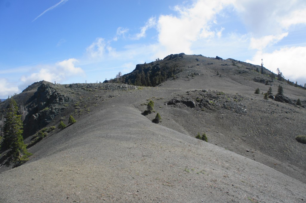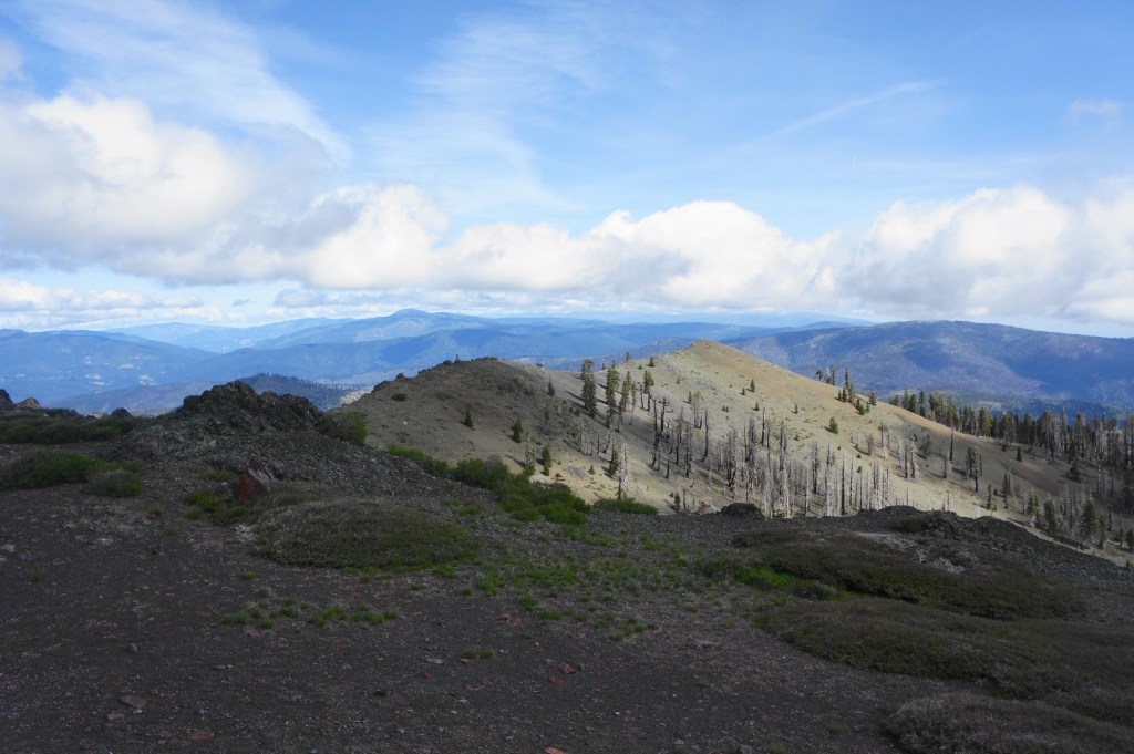 After flanking a rocky ridge, the path to the East Peak tackles a barren traverse, devoid of all but fine-grained, black-gray rock, offering views in both directions. Down to the left are Signal Peak (6,684’) and North Ridge (6,540’), still part of the Snow Mountain complex. To the right, one can see down the Dark Hollow Creek drainage toward Indian Valley. From here it is a steep and rocky but relatively brief ascent to the broad summit, which offers several nice places to sit and admire the panoramic vistas.