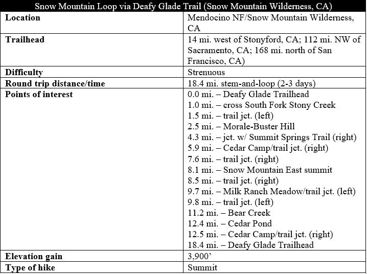 While visitors can bag the summit of Snow Mountain in one long, very strenuous day hike, the ascent is much more enjoyable as a 2- to 3-day backpack. Below I describe such a trip, starting and ending at Deafy Glade Trailhead in Mendocino National Forest, which forms an 18-mile lasso-loop that traverses forest, streams, spring-fed meadows, and high slopes with panoramic vistas of one of California’s forgotten landscapes. Unlike existing descriptions on the web, this post includes a loop option that continues past the summit to Milk Ranch Meadow and the Bear Creek area, an extension that sports expansive views and hidden glades that are well worth a few additional miles. (Note: Snow Mountain technically has two summits—a west and east peak. This description hits the east (taller) peak, but the west is easily accessible.)