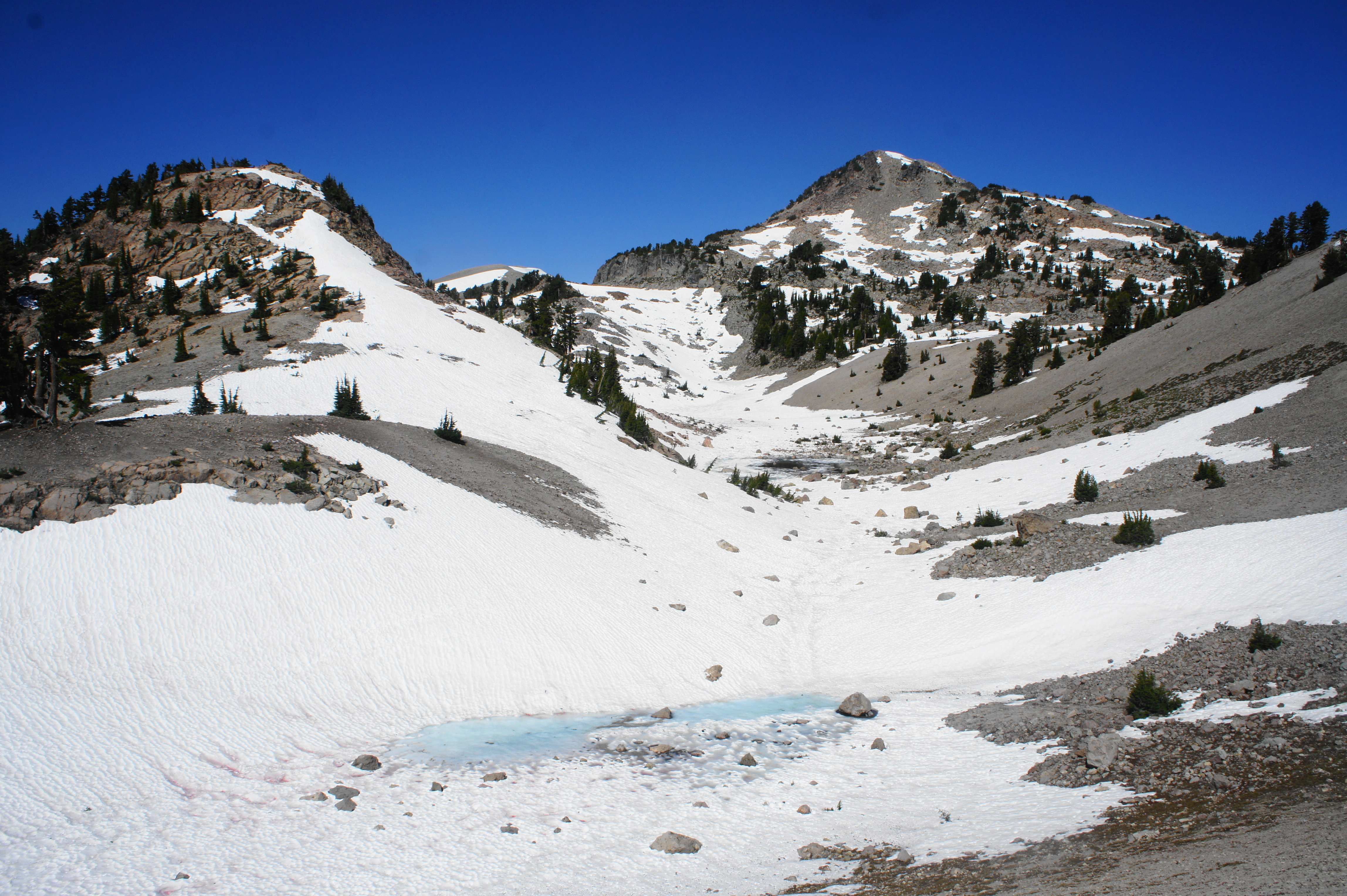Backtracking from the summit, it is also common to spot visitors veering off to the north to explore the crater area: do so with caution, as the area is often snow-covered and has lots of loose gravel, and the climb to the western rim of the peak is surprisingly steep. Hikers are rewarded, however, with views of Manzanita Lake and Chaos Crags to the northwest, as well as unobstructed vistas of Mount Shasta and the Trinities.