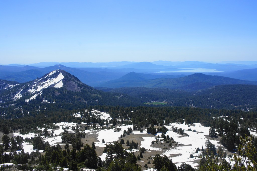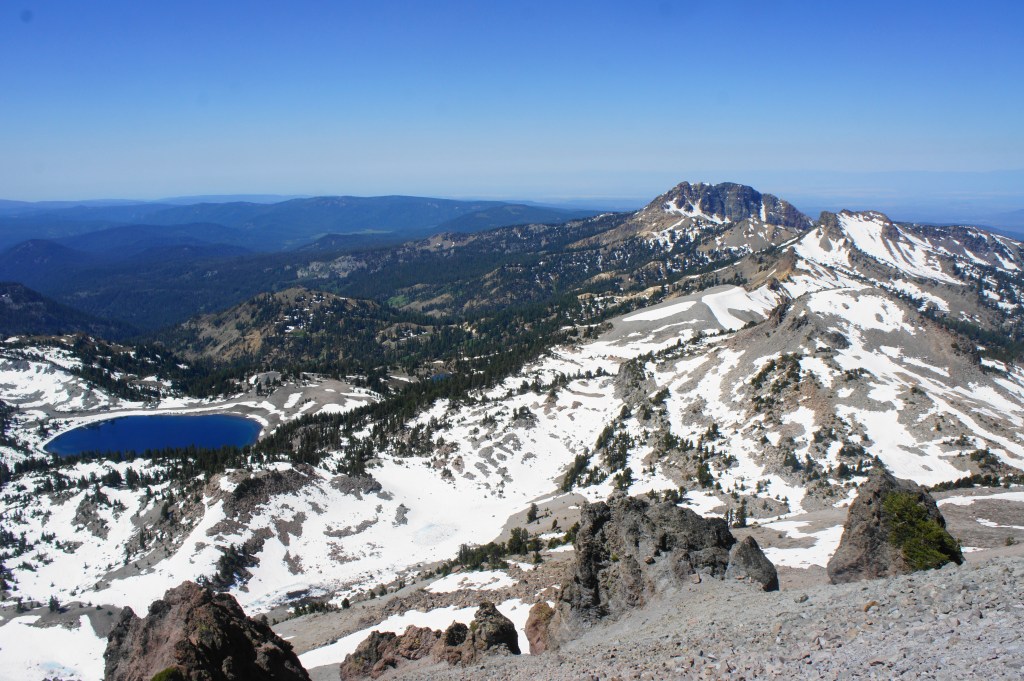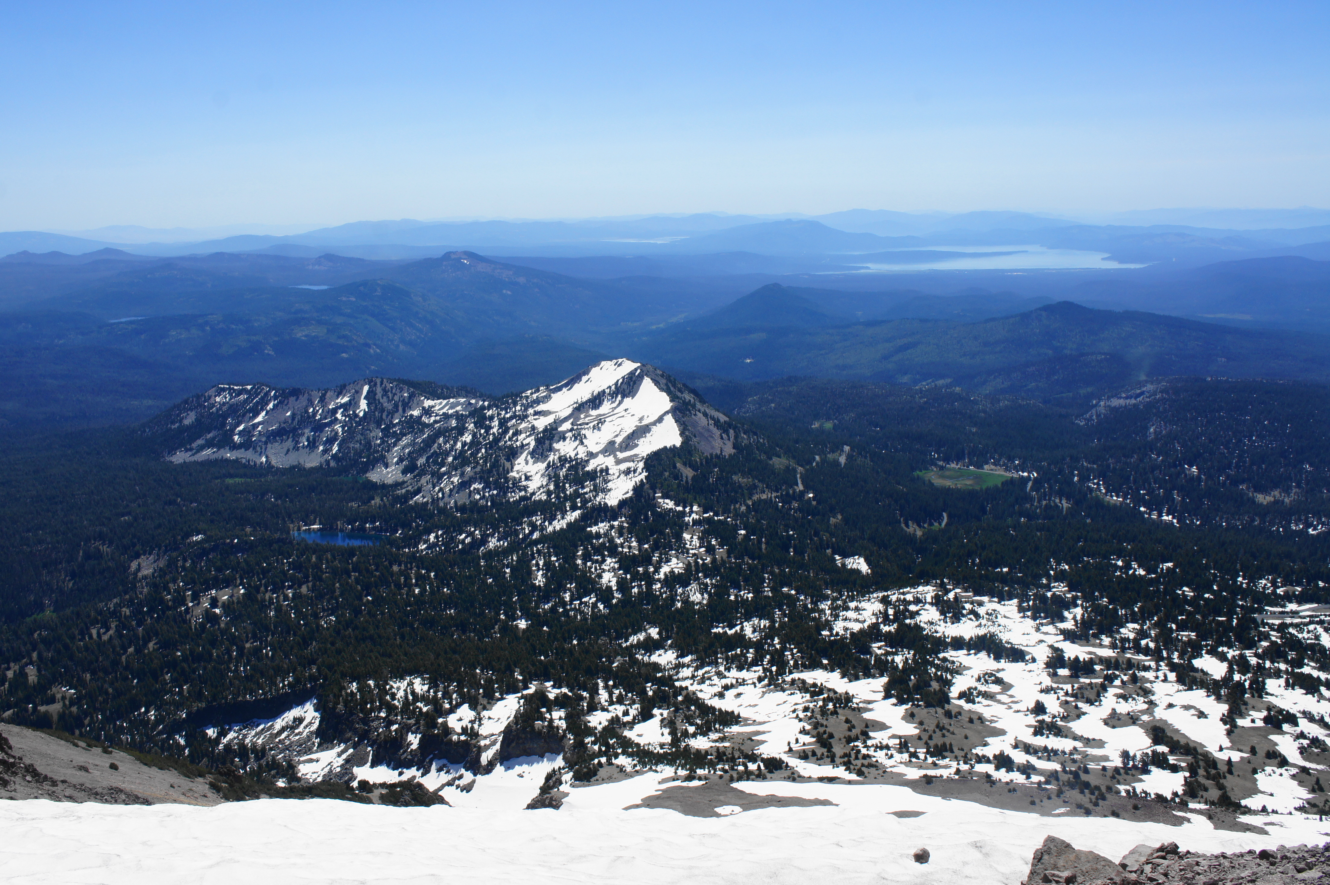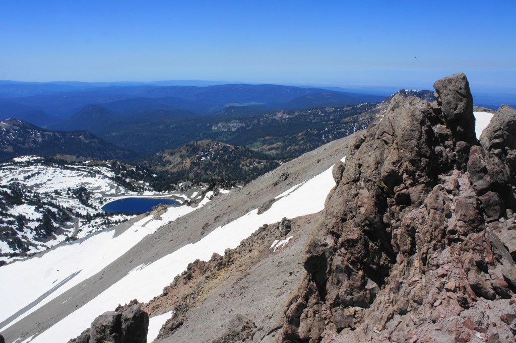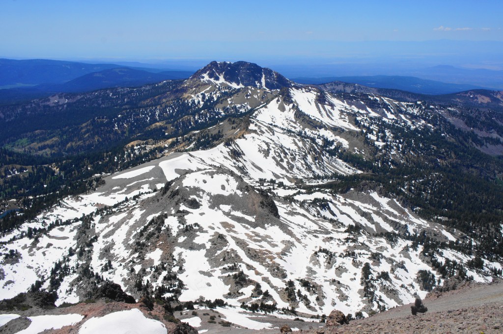 From the “false summit,” one can also see the perennially snow-capped Mount Shasta (14,179’) to the north, perhaps an even more impressive volcano that also has remained dormant for thousands of years. Also to the northwest are the Trinity Alps, a beautiful range of often snow-topped peaks, as well as the northernmost reaches of the Central Valley.
