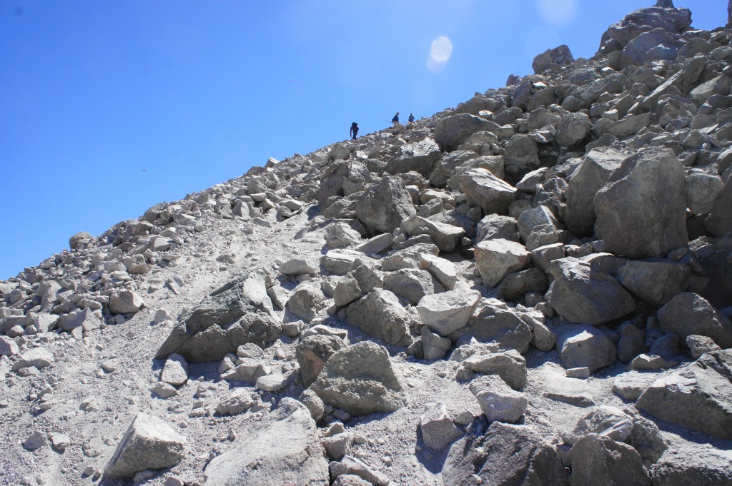 The final stretch to the top is certain to be the most exposed to the sun and wind, and the seemingly endless switchbacks leave hikers huffing and puffing, happy to stop to let downhill hikers pass. At last, the trail levels off at 2.25 miles—though not the true summit, one can see northward to the volcanic caldera and beyond for the first time. Though lacking a steaming hole like one might see at, say, Hawaii’s Kilauea, the remains of past explosions are evident: deep clefts in the mountaintop, surrounded by volcanic black crags.