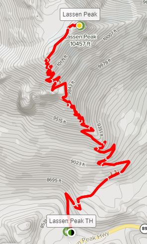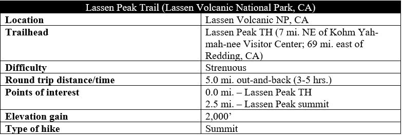 The Lassen Peak Trailhead is situated just shy of the highest point on the Lassen Volcanic National Park Highway at roughly 8,500 feet above sea level—a 7-mile drive from the Kohm Yah-mah-nee Visitor Center in the southwest of the park. The parking area is large but often crowded and has a pair of restrooms. The towering volcano is visible right from the start, and the obvious trail leading up the peak is immaculately crafted and easy to follow for the entire length of the hike.