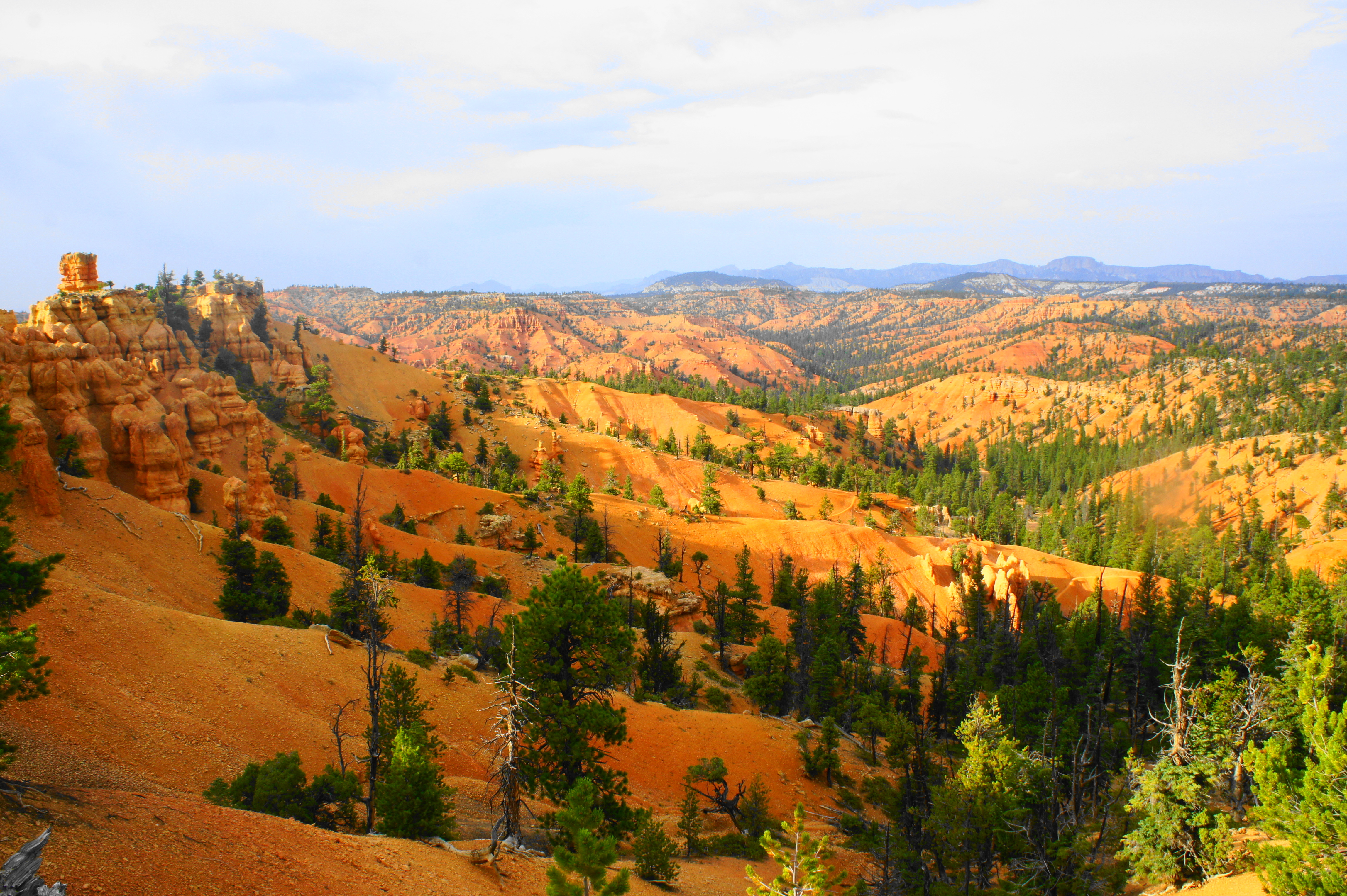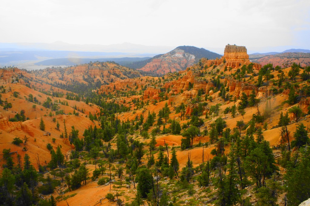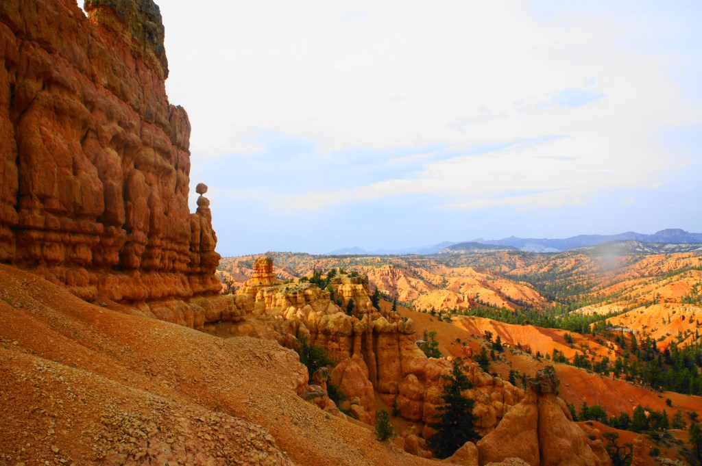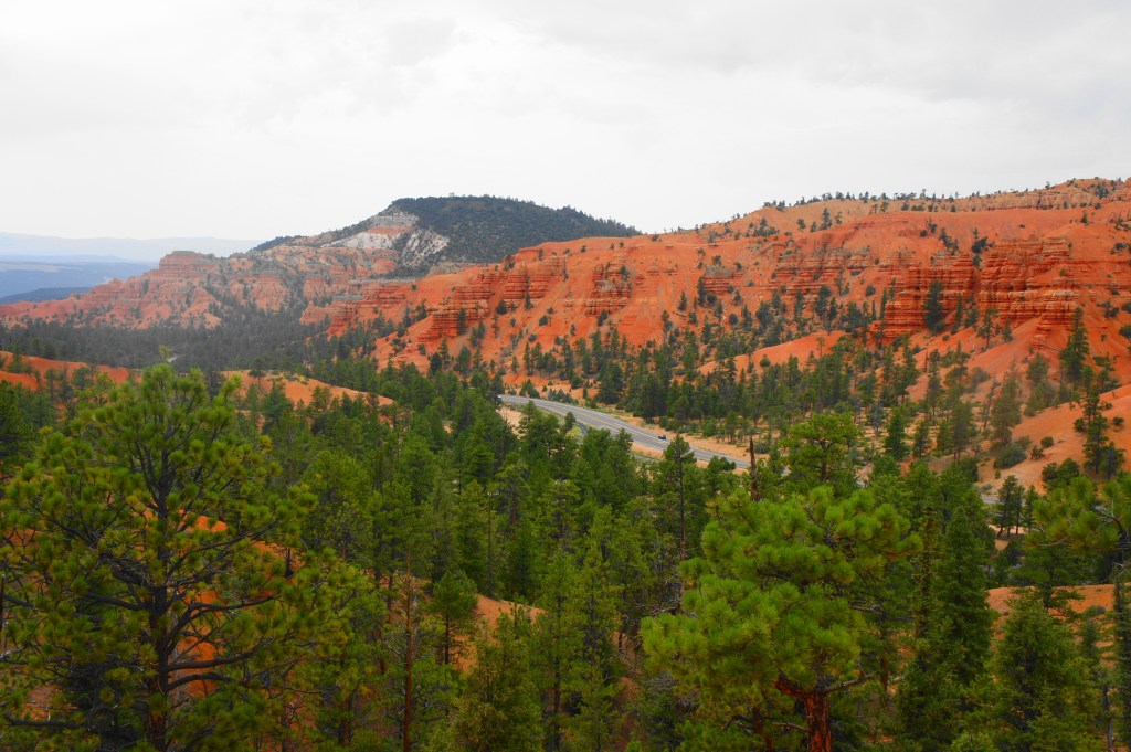 Passing the stony temple on the right, a new drainage comes into view, this one boasting bulging, carrot-tinged fins and a pine-studded valley to the north. Red Canyon and Black Mountain (7,889’) return to view in the background, with Panguitch Valley off to the left.